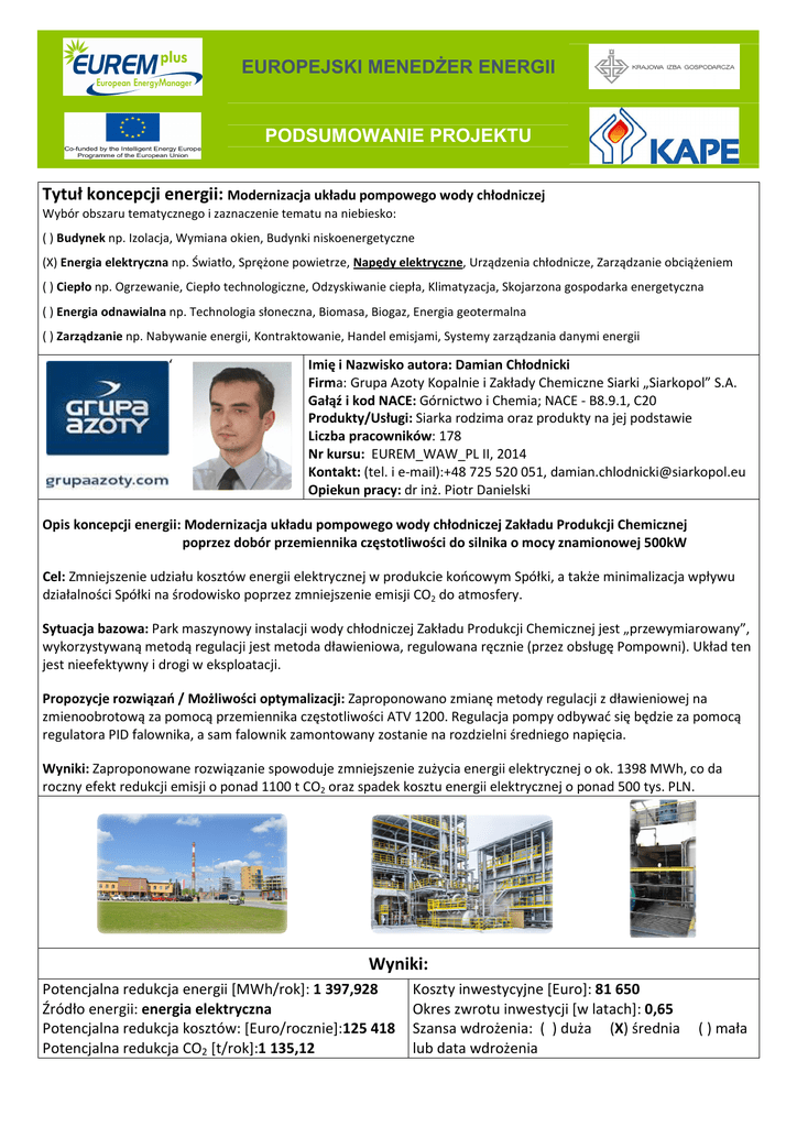 EUROPEJSKI MENEDśER ENERGII PODSUMOWANIE PROJEKTU Tytuł koncepcji energii: Modernizacja układu pompowego wody chłodniczej Wybór obszaru tematycznego i zaznaczenie tematu na niebiesko: ( ) Budynek np. Izolacja, Wymiana okien, Budynki niskoenergetyczne (X) Energia elektryczna np. Światło, Sprężone powietrze, Napędy elektryczne, Urządzenia chłodnicze, Zarządzanie obciążeniem ( ) Ciepło np. Ogrzewanie, Ciepło technologiczne, Odzyskiwanie ciepła, Klimatyzacja, Skojarzona gospodarka energetyczna ( ) Energia odnawialna np. Technologia słoneczna, Biomasa, Biogaz, Energia geotermalna ( ) Zarządzanie np. Nabywanie energii, Kontraktowanie, Handel emisjami, Systemy zarządzania danymi energii ‘ Imię i Nazwisko autora: Damian Chłodnicki Firma: Grupa Azoty Kopalnie i Zakłady Chemiczne Siarki „Siarkopol” S.A. Gałąź i kod NACE: Górnictwo i Chemia; NACE - B8.9.1, C20 Produkty/Usługi: Siarka rodzima oraz produkty na jej podstawie Liczba pracowników: 178 Nr kursu: EUREM_WAW_PL II, 2014 Kontakt: (tel. i e-mail):+48 725 520 051, [email protected] Opiekun pracy: dr inż. Piotr Danielski Opis koncepcji energii: Modernizacja układu pompowego wody chłodniczej Zakładu Produkcji Chemicznej poprzez dobór przemiennika częstotliwości do silnika o mocy znamionowej 500kW Cel: Zmniejszenie udziału kosztów energii elektrycznej w produkcie końcowym Spółki, a także minimalizacja wpływu działalności Spółki na środowisko poprzez zmniejszenie emisji CO2 do atmosfery. Sytuacja bazowa: Park maszynowy instalacji wody chłodniczej Zakładu Produkcji Chemicznej jest „przewymiarowany”, wykorzystywaną metodą regulacji jest metoda dławieniowa, regulowana ręcznie (przez obsługę Pompowni). Układ ten jest nieefektywny i drogi w eksploatacji. Propozycje rozwiązań / Możliwości optymalizacji: Zaproponowano zmianę metody regulacji z dławieniowej na zmienoobrotową za pomocą przemiennika częstotliwości ATV 1200. Regulacja pompy odbywać się będzie za pomocą regulatora PID falownika, a sam falownik zamontowany zostanie na rozdzielni średniego napięcia. Wyniki: Zaproponowane rozwiązanie spowoduje zmniejszenie zużycia energii elektrycznej o ok. 1398 MWh, co da roczny efekt redukcji emisji o ponad 1100 t CO2 oraz spadek kosztu energii elektrycznej o ponad 500 tys. PLN. Wyniki: Potencjalna redukcja energii [MWh/rok]: 1 397,928 Źródło energii: energia elektryczna Potencjalna redukcja kosztów: [Euro/rocznie]:125 418 Potencjalna redukcja CO2 [t/rok]:1 135,12 Koszty inwestycyjne [Euro]: 81 650 Okres zwrotu inwestycji [w latach]: 0,65 Szansa wdrożenia: ( ) duża (X) średnia lub data wdrożenia ( ) mała