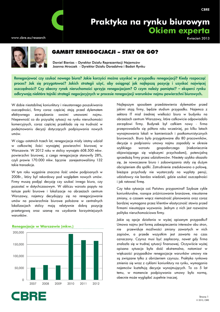 CBRE Praktyka na rynku biurowym Okiem experta www.cbre.eu/research Kwiecień 2013 GAMBIT RENEGOCJACJI – STAY OR GO? Daniel Bienias – Dyrektor Działu Reprezentacji Najemców Joanna Mroczek - Dyrektor Działu Doradztwa i Badań Rynku Renegocjować czy szukać nowego biura? Jakie korzyści można uzyskać w przypadku renegocjacji? Kiedy rozpocząć proces? Jak się przygotować? Jakich strategii użyć, aby osiągnąć jak najlepszą pozycję i uzyskać najwięcej oszczędności? Czy obecny rynek nieruchomości sprzyja renegocjacjom? O czym należy pamiętać? – eksperci rynku odkrywają niektóre tajniki strategii negocjacyjnych w procesie renegocjacji warunków najmu powierzchni biurowych. W dobie niestabilnej koniunktury i nieustannego poszukiwania oszczędności, firmy coraz częściej stają przed dylematem efektywnego zarządzania swoimi umowami najmu. Niepewność co do przyszłej sytuacji na rynku nieruchomości komercyjnych, coraz częściej przekłada się na trudność w podejmowaniu decyzji dotyczących podpisywania nowych umów. W ciągu ostatnich trzech lat, renegocjacje miały istotny udział w całkowitej ilości wynajętej powierzchni biurowej w Warszawie. W 2012 roku w stolicy wynajęto 608.500 mkw. powierzchni biurowej, z czego renegocjacje stanowiły 28%, czyli prawie 170.000 mkw. Łącznie zarejestrowaliśmy 132 takie transakcje. W tym roku wygaśnie znaczna ilość umów podpisanych w 2008r., który był rekordowy pod względem nowych umów. Firmy muszą podjąć decyzję czy szukać innego biura, czy pozostać w dotychczasowym. W obliczu wzrostu popytu na tańsze parki biurowe i lokalizacje na obrzeżach centrum Warszawy, najemcy decydujący się na renegocjowanie umów na powierzchnie biurowe położone w centralnych lokalizacjach stolicy mają relatywnie dobrą pozycję przetargową oraz szansę na uzyskanie korzystniejszych warunków. 200,000 150,000 100,000 50,000 0 2008 2009 2010 Czy taka sytuacja coś Państwu przypomina? Szybsze cykle koniunkturalne, rosnące zróżnicowanie branżowe, nieustanne zmiany, a czasem wręcz niemożność planowania oraz coraz bardziej wymagana przez klientów elastyczność stawia przed firmami nieustające wyzwania. Jednym z nich jest rozważna polityka nieruchomościowa firmy. Jakie są opcje działania w wyżej opisanym przypadku? Umowa najmu jest formą zabezpieczenia interesów obu stron, nie przewiduje możliwości zmiany zawartych w nich zapisów, a przede wszystkim jest zawarta na czas oznaczony. Czynsz musi być zapłacony, nawet gdy firma znalazła się w trudnej sytuacji finansowej. Oczywiście wyżej opisana sytuacja była dość ekstremalna, natomiast w większości przypadków renegocjacje warunków umowy nie są związane tylko z obniżeniem czynszu. Praktyka rynkowa zmienia się wraz z cyklami koniunktury na rynku, wymagania najemców kształtują decyzje wynajmujących. To co 5 lat temu, w momencie podpisywania umowy było normą, obecnie może wyglądać zupełnie inaczej. Renegocjacje w Warszawie (mkw.) 2007 Najlepszym sposobem przedstawienia dylematów przed jakimi stoją firmy, będzie studium przypadku. Najemca z sektora IT miał średniej wielkości biuro w budynku na obrzeżach centrum Warszawy, które całkowicie odpowiadało zarządowi firmy. Budynek był całkiem nowy - firma przeprowadziła się półtora roku wcześniej, po kilku latach wynajmowania lokali w kamienicach i postkomunistycznych biurowcach. Biuro było przygotowane dla 80 pracowników, decyzje o podpisaniu umowy najmu zapadały w okresie szybkiego wzrostu gospodarczego (niekoniecznie objawiającego się większymi przychodami), potencjalną sprzedażą firmy przez udziałowców. Niestety szybko okazało się, że nowoczesne biuro i zobowiązania stały się dużym obciążeniem dla spółki. Zatrudnienie zredukowano o połowę, bieżące przychody nie wystarczały na wypłaty pensji, udziałowcy nie bardzo wiedzieli, gdzie szukać oszczędności i jak ratować firmę. 2011 2012 Strona 1 © 2013, CBRE Praktyka na rynku biurowym Okiem eksperta Znajdź doradcę! Najprostszym rozwiązaniem jest zatrudnienie doradcy do spraw nieruchomości. Jest to jedyny dobry sposób, aby profesjonalne przeprowadzić renegocjacje. Wynajmujący robią wszystko, aby wynająć szybko, jak najwięcej powierzchni i uzyskać wysoką cenę najmu, a najemcy mają ograniczone budżety i pragną uzyskać jak najwięcej korzyści i udogodnień od właściciela budynku. Dobry, doświadczony negocjator uzyska dla najemcy najkorzystniejsze warunki, i sprawi, że obie strony po renegocjacjach będą zadowolone. Doradcy, pracując aktywnie na rynku nieruchomości, mają wpływ na jego zmiany. Kształtowanie rynku, polega na umiejętnym wpływaniu na właścicieli nieruchomości, aby byli w stanie (czyli mogli przekonać swoich udziałowców, banki, zarządy) zaakceptować coś co na pierwszy rzut oka nie jest możliwe do zaakceptowania. Trzeba podkreślić również znaczenie słowa nieustannie – doradcy przeprowadzają transakcje codziennie, dobrze znają rynek, mają doświadczenie i potrafią przeanalizować sytuacje w sposób trafny, poparty konkretnymi przykładami. Doradcy potrafią w umiejętny sposób pozycjonować sytuację Najemcy, tak aby podczas rozmów uzyskać jak najwięcej korzyści. Szukaj oszczędności! Wynajmujący, planując swój biznes długoterminowo, starają się unikać ryzyka. Stabilność przychodów jest o wiele ważniejsza niż częste wymiany najemców, które związane są ze znacznymi wydatkami na marketing, prowizje agentów czy utrzymywanie wolnej powierzchni nie przynoszącej przychodu. Jeżeli właściciel budynku będzie przekonany, że kłopoty firmy są przejściowe, firma ma solidne podstawy i w zamian za krótkoterminowe obniżki może wydłużyć umowę najmu, można uzyskać potrzebne oszczędności. Analizuj sytuację! Renegocjacje muszą zostać poparte gruntowną analizą sytuacji najemcy i celów jakie chcemy osiągną