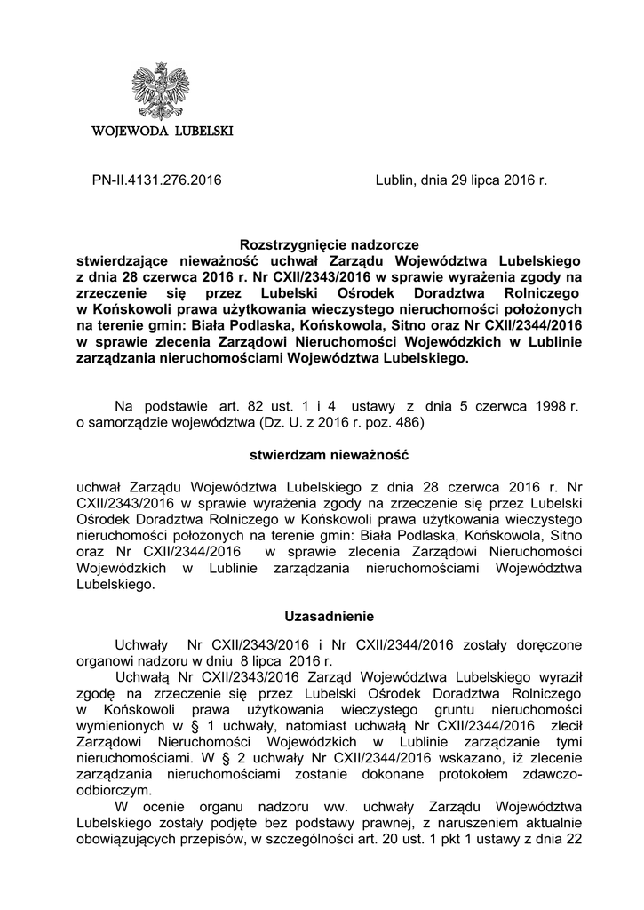WOJEWODA LUBELSKI PN-II.4131.276.2016 Lublin, dnia 29 lipca 2016 r. Rozstrzygnięcie nadzorcze stwierdzające nieważność uchwał Zarządu Województwa Lubelskiego z dnia 28 czerwca 2016 r. Nr CXII/2343/2016 w sprawie wyrażenia zgody na zrzeczenie się przez Lubelski Ośrodek Doradztwa Rolniczego w Końskowoli prawa użytkowania wieczystego nieruchomości położonych na terenie gmin: Biała Podlaska, Końskowola, Sitno oraz Nr CXII/2344/2016 w sprawie zlecenia Zarządowi Nieruchomości Wojewódzkich w Lublinie zarządzania nieruchomościami Województwa Lubelskiego. Na podstawie art. 82 ust. 1 i 4 ustawy z dnia 5 czerwca 1998 r. o samorządzie województwa (Dz. U. z 2016 r. poz. 486) stwierdzam nieważność uchwał Zarządu Województwa Lubelskiego z dnia 28 czerwca 2016 r. Nr CXII/2343/2016 w sprawie wyrażenia zgody na zrzeczenie się przez Lubelski Ośrodek Doradztwa Rolniczego w Końskowoli prawa użytkowania wieczystego nieruchomości położonych na terenie gmin: Biała Podlaska, Końskowola, Sitno oraz Nr CXII/2344/2016 w sprawie zlecenia Zarządowi Nieruchomości Wojewódzkich w Lublinie zarządzania nieruchomościami Województwa Lubelskiego. Uzasadnienie Uchwały Nr CXII/2343/2016 i Nr CXII/2344/2016 zostały doręczone organowi nadzoru w dniu 8 lipca 2016 r. Uchwałą Nr CXII/2343/2016 Zarząd Województwa Lubelskiego wyraził zgodę na zrzeczenie się przez Lubelski Ośrodek Doradztwa Rolniczego w Końskowoli prawa użytkowania wieczystego gruntu nieruchomości wymienionych w § 1 uchwały, natomiast uchwałą Nr CXII/2344/2016 zlecił Zarządowi Nieruchomości Wojewódzkich w Lublinie zarządzanie tymi nieruchomościami. W § 2 uchwały Nr CXII/2344/2016 wskazano, iż zlecenie zarządzania nieruchomościami zostanie dokonane protokołem zdawczoodbiorczym. W ocenie organu nadzoru ww. uchwały Zarządu Województwa Lubelskiego zostały podjęte bez podstawy prawnej, z naruszeniem aktualnie obowiązujących przepisów, w szczególności art. 20 ust. 1 pkt 1 ustawy z dnia 22 2 października 2004 r. o jednostkach doradztwa rolniczego (Dz. U. z 2016 r., poz. 356) oraz art. 31 ustawy z dnia 23 stycznia 2009r. o zmianie niektórych ustaw w związku ze zmianami w organizacji i podziale zadań administracji publicznej w województwie (Dz. U. z 2009 r. Nr 92 poz. 753, ze zm.). Lubelski Ośrodek Doradztwa Rolniczego w Końskowoli, zwany dalej „LODR”, jest jednostką doradztwa rolniczego, której status określa ustawa z dnia 22 października 2004 r. o jednostkach doradztwa rolniczego (Dz. U. z 2016 r., poz. 356). Jak stanowi art. 2 ust. 1 ustawy jednostkami doradztwa rolniczego są: 1) Centrum Doradztwa Rolniczego z siedzibą w Brwinowie, zwane dalej "Centrum Doradztwa"; 2) 16 wojewódzkich ośrodków doradztwa rolniczego, zwanych dalej "ośrodkami wojewódzkimi". Centrum Doradztwa jest państwową jednostką organizacyjną posiadającą osobowość prawną (art. 2 ust. 2), zaś ośrodki wojewódzkie są samorządowymi wojewódzkimi osobami prawnym (art. 2a). W art. 2b ustawa stanowi, iż zadaniem Centrum Doradztwa i ośrodków wojewódzkich jest prowadzenie doradztwa rolniczego obejmującego działania w zakresie rolnictwa, rozwoju wsi, rynków rolnych oraz wiejskiego gospodarstwa domowego, mające na celu poprawę poziomu dochodów rolniczych oraz podnoszenie konkurencyjności rynkowej gospodarstw rolnych, wspieranie zrównoważonego rozwoju obszarów wiejskich, a także podnoszenie poziomu kwalifikacji zawodowych rolników i innych mieszkańców obszarów wiejskich. LODR jest zatem w chwili obecnej samorządową wojewódzką osobą prawną realizującą zadania z zakresu doradztwa rolniczego. Obecne brzmienie przywołanym wyżej regulacjom ustawy o jednostkach doradztwa rolniczego zostało nadane przepisami ustawy z dnia 23 stycznia 2009r. o zmianie niektórych ustaw w związku ze zmianami w organizacji i podziale zadań administracji publicznej w województwie Ustawa z dnia 23 stycznia 2009 r. podporządkowała wojewódzkie ośrodki doradztwa rolniczego samorządowi województwa, nadając im – jak wskazano wyżej – status wojewódzkich osób prawnych. Powołane ustawy jednoznacznie rozstrzygają kwestie związane z wyposażeniem ośrodków doradztwa rolniczego w nieruchomości niezbędne do prowadzenia działalności statutowej. W myśl art. 20 ust. 1 pkt 1 ustawy o jednostkach doradztwa rolniczego jednostki doradztwa rolniczego są z mocy prawa użytkownikami wieczystymi nieruchomości służących do realizacji wspomnianej działalności. Status użytkownika wieczystego ośrodki doradztwa rolniczego zachowały także po wejściu w życie przepisów ustawy z dnia 23 stycznia 2009r. o zmianie niektórych ustaw w związku ze zmianami w organizacji i podziale zadań administracji publicznej w województwie. Art. 31 tej ustawy stanowi, iż z dniem wejścia w życie ustawy, tj. z dniem 1 sierpnia 2009 r. mienie Skarbu Państwa niezbędne do wykonywania zadań przekazywanych tą ustawą staje się z mocy prawa mieniem właściwej jednostki samorządu terytorialnego. Zgodnie z art. 32 ust. 1 tej ustawy nabycie mienia, o którym mowa w art. 31 ust. 1, stwierdza wojewoda w drodze decyzji administracyjnej. 3 Nabycie przez jednostkę samorządu terytorialnego mienia Skarbu Państwa niezbędnego do wykonywania zadań przekazywanych niniejszą ustawą następuje wraz z ograniczonymi prawami rzeczowymi, które ujawnia się w decyzji administracyjnej o nabyciu mienia. Ich ujawnienie nie narusza praw osób trzecich (art. 32 ust. 2 w/w ustawy). Na podstawie przepisów ustawy z dnia 23 stycznia 2009r. zadania wykonywane przez LODR w Końskowoli stały się z dniem 1 sierpnia 2009 r. zadaniami Województwa Lubelskiego. W związku z powyższym działając na podstawie art. 32 ust. 1 ustawy z 23 stycznia 2009 r. Wojewoda Lubelski decyzjami z dnia 21 lutego 2011 r.: znak: GNiR.II/NR/77723/3-6a/10, GNiR.II/NR/77723/3-6b/10, GNiR.II/NR/77723/3-6d/10, GNiR.II/NR/77723/36f/10 stwierdził, że z
