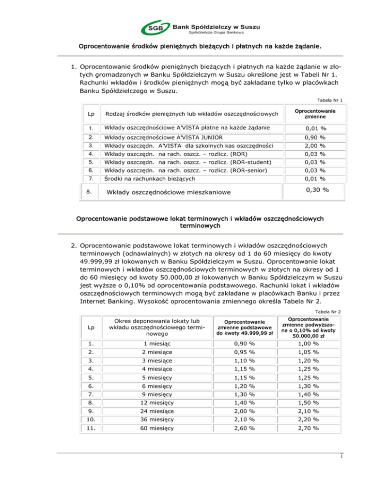 Oprocentowanie środków pieniężnych bieżących i płatnych na każde żądanie. 1. Oprocentowanie środków pieniężnych bieżących i płatnych na każde żądanie w złotych gromadzonych w Banku Spółdzielczym w Suszu określone jest w Tabeli Nr 1. Rachunki wkładów i środków pieniężnych mogą być zakładane tylko w placówkach Banku Spółdzielczego w Suszu. Tabela Nr 1 Oprocentowanie zmienne Lp Rodzaj środków pieniężnych lub wkładów oszczędnościowych 1. Wkłady oszczędnościowe A’VISTA płatne na każde żądanie 0,01 % 2. Wkłady oszczędnościowe A’VISTA JUNIOR 0,90 % 3. Wkłady oszczędn. A’VISTA dla szkolnych kas oszczędności 2,00 % 4. Wkłady oszczędn. na rach. oszcz. – rozlicz. (ROR) 0,03 % 5. Wkłady oszczędn. na rach. oszcz. – rozlicz. (ROR-student) 0,03 % 6. Wkłady oszczędn. na rach. oszcz. – rozlicz. (ROR-senior) 0,03 % 7. Środki na rachunkach bieżących 0,01 % 8. 0,30 % Wkłady oszczędnościowe mieszkaniowe Oprocentowanie podstawowe lokat terminowych i wkładów oszczędnościowych terminowych 2. Oprocentowanie podstawowe lokat terminowych i wkładów oszczędnościowych terminowych (odnawialnych) w złotych na okresy od 1 do 60 miesięcy do kwoty 49.999,99 zł lokowanych w Banku Spółdzielczym w Suszu. Oprocentowanie lokat terminowych i wkładów oszczędnościowych terminowych w złotych na okresy od 1 do 60 miesięcy od kwoty 50.000,00 zł lokowanych w Banku Spółdzielczym w Suszu jest wyższe o 0,10% od oprocentowania podstawowego. Rachunki lokat i wkładów oszczędnościowych terminowych mogą być zakładane w placówkach Banku i przez Internet Banking. Wysokość oprocentowania zmiennego określa Tabela Nr 2. Tabela Nr 2 Lp Okres deponowania lokaty lub wkładu oszczędnościowego terminowego Oprocentowanie zmienne podstawowe do kwoty 49.999,99 zł Oprocentowanie zmienne podwyższone o 0,10% od kwoty 50.000,00 zł 1. 1 miesiąc 0,90 % 1,00 % 2. 2 miesiące 0,95 % 1,05 % 3. 3 miesiące 1,10 % 1,20 % 4. 4 miesiące 1,15 % 1,25 % 5. 5 miesięcy 1,15 % 1,25 % 6. 6 miesięcy 1,20 % 1,30 % 7. 9 miesięcy 1,30 % 1,40 % 8. 12 miesięcy 1,40 % 1,50 % 9. 24 miesiące 2,00 % 2,10 % 10. 36 miesięcy 2,10 % 2,20 % 11. 60 miesięcy 2,60 % 2,70 % 1 3. Oprocentowanie lokat terminowych i wkładów oszczędnościowych terminowych (nieodnawialnych) w złotych na okresy 3, 6 i 12 miesięcy lokowanych w Banku Spółdzielczym w Suszu. Rachunki lokat i wkładów oszczędnościowych terminowych mogą być zakładane w placówkach Banku i przez Internet Banking. Oprocentowanie lokat jest stałe, a wysokość oprocentowania określa Tabela Nr 3. Tabela Nr 3 Okres deponowania lokaty lub wkładu oszczędnościowego terminowego Oprocentowanie stałe 1. 3 miesiące 1,25 % 2. 6 miesięcy 1,35 % 3. 12 miesięcy 1,55 % Lp 4. Oprocentowanie progresywne terminowej 12 miesięcznej dynamicznej lokaty oszczędnościowej (odnawialnej) w złotych PLEJADA w Banku Spółdzielczym w Suszu określa Tabela Nr 4. Oprocentowanie lokaty PLEJADA jest zmienne. Rachunki lokaty mogą być zakładane tylko w placówkach Banku. Tabela Nr 4 Lp Okres deponowania dynamicznej lokaty oszczędnościowej PLEJADA Oprocentowanie zmienne 1. 1 miesiąc 0,80 % 2. 2 miesiące 1,00 % 3. 3 miesiące 1,00 % 4. 4 miesiące 1,10 % 5. 5 miesięcy 1,10 % 6. 6 miesięcy 1,15 % 7. 7 miesięcy 1,15 % 8. 8 miesięcy 1,15 % 9. 9 miesięcy 1,25 % 10 10 miesięcy 1,50 % 11 11 miesięcy 2,00 % 12. 12 miesięcy 5,90 % 5. Oprocentowanie zmienne lokaty terminowej (nieodnawialnej) pod nazwą LOKATA KORZYSTNA W Banku Spółdzielczym w Suszu określa Tabela Nr 5. Stawka WIBID 1M ulega zmianie zgodnie ze stawkami stóp procentowych na rynku międzybankowym. Wysokość i sposób stosowania i zmiany stóp procentowych uzależnionych od stawek WIBID określa umowa z klientem. Rachunki lokat terminowych mogą być zakładane w placówkach Banku i przez Internet Banking. Tabela Nr 5 Lp Okres deponowania lokaty terminowej Oprocentowanie zmienne uzależnione od stawki WIBID 1M 1. 12 miesięcy WIBID 1M + 0,20 p.p. 2. 24 miesiące WIBID 1M + 0,30 p.p. 2