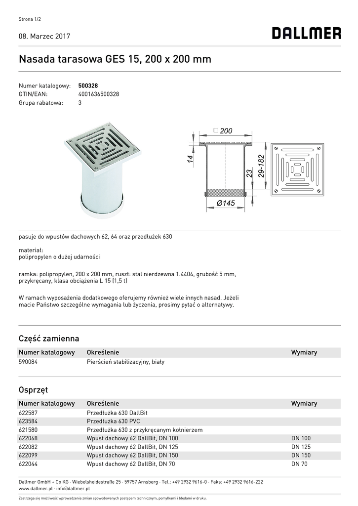 Strona 1/2 08. Marzec 2017 Nasada tarasowa GES 15, 200 x 200 mm Numer katalogowy: GTIN/EAN: Grupa rabatowa: 500328 4001636500328 3 pasuje do wpustów dachowych 62, 64 oraz przedłużek 630 materiał: polipropylen o dużej udarności ramka: polipropylen, 200 x 200 mm, ruszt: stal nierdzewna 1.4404, grubość 5 mm, przykręcany, klasa obciążenia L 15 (1,5 t) W ramach wyposażenia dodatkowego oferujemy również wiele innych nasad. Jeżeli macie Państwo szczególne wymagania lub życzenia, prosimy pytać o alternatywy. Część zamienna Numer katalogowy Określenie 590084 Pierścień stabilizacyjny, biały Wymiary Osprzęt Numer katalogowy Określenie Wymiary 622587 623584 621580 622068 622082 622099 622044 Przedłużka 630 DallBit Przedłużka 630 PVC Przedłużka 630 z przykręcanym kołnierzem Wpust dachowy 62 DallBit, DN 100 Wpust dachowy 62 DallBit, DN 125 Wpust dachowy 62 DallBit, DN 150 Wpust dachowy 62 DallBit, DN 70 DN 100 DN 125 DN 150 DN 70 Dallmer GmbH + Co KG · Wiebelsheidestraße 25 · 59757 Arnsberg · Tel.: +49 2932 9616-0 · Faks: +49 2932 9616-222 www.dallmer.pl · [email protected] Zastrzega się możliwość wprowadzenia zmian spowodowanych postępem technicznym, pomyłkami i błędami w druku. Strona 2/2 08. Marzec 2017 622167 622181 622198 622143 621627 621634 621603 623164 623188 623195 623140 621160 621184 621191 621146 623065 623089 623096 623041 621061 621085 621092 621047 642073 641014 641007 642172 641038 641021 641052 643179 641175 641045 643070 641076 630360 630384 630391 630346 630063 630087 630094 630049 Wpust dachowy 62 H DallBit, ogrzewany, DN 100 Wpust dachowy 62 H DallBit, ogrzewany, DN 125 Wpust dachowy 62 H DallBit, ogrzewany, DN 150 Wpust dachowy 62 H DallBit, ogrzewany, DN 70 Wpust dachowy 62 H FPO-PP, ogrzewany, DN 100 Wpust dachowy 62 H FPO-PP, ogrzewany, DN 125 Wpust dachowy 62 H FPO-PP, ogrzewany, DN 70 Wpust dachowy 62 H PVC, ogrzewany, DN 100 Wpust dachowy 62 H PVC, ogrzewany, DN 125 Wpust dachowy 62 H PVC, ogrzewany, DN 150 Wpust dachowy 62 H PVC, ogrzewany, DN 70 Wpust dachowy 62 H z przykręcanym kołnierzem, ogrzewany, DN 100 Wpust dachowy 62 H z przykręcanym kołnierzem, ogrzewany, DN 125 Wpust dachowy 62 H z przykręcanym kołnierzem, ogrzewany, DN 150 Wpust dachowy 62 H z przykręcanym kołnierzem, ogrzewany, DN 70 Wpust dachowy 62 PVC, DN 100 Wpust dachowy 62 PVC, DN 125 Wpust dachowy 62 PVC, DN 150 Wpust dachowy 62 PVC, DN 70 Wpust dachowy 62 z przykręcanym kołnierzem, DN 100 Wpust dachowy 62 z przykręcanym kołnierzem, DN 125 Wpust dachowy 62 z przykręcanym kołnierzem, DN 150 Wpust dachowy 62 z przykręcanym kołnierzem, DN 70 Wpust dachowy 64 DallBit, DN 70/DN 100 Wpust dachowy 64 FPO-PP, DN 100 Wpust dachowy 64 FPO-PP, DN 70 Wpust dachowy 64 H DallBit, ogrzewany, DN 70/DN 100 Wpust dachowy 64 H FPO-PP, ogrzewany, DN 100 Wpust dachowy 64 H FPO-PP, ogrzewany, DN 70 Wpust dachowy 64 H PVC, ogrzewany, DN 100 Wpust dachowy 64 H PVC, ogrzewany, DN 70 Wpust dachowy 64 H z przykręcanym kołnierzem, ogrzewany, DN 70/DN 100 Wpust dachowy 64 PVC, DN 100 Wpust dachowy 64 PVC, DN 70 Wpust dachowy 64 z przykręcanym kołnierzem, DN 70/DN 100 Wpust dachowy renowacyjny 63 T PVC, DN 100 Wpust dachowy renowacyjny 63 T PVC, DN 125 Wpust dachowy renowacyjny 63 T PVC, DN 150 Wpust dachowy renowacyjny 63 T PVC, DN 70 Wpust dachowy renowacyjny 63 T z przykręcanym kołnierzem, DN 100 Wpust dachowy renowacyjny 63 T z przykręcanym kołnierzem, DN 125 Wpust dachowy renowacyjny 63 T z przykręcanym kołnierzem, DN 150 Wpust dachowy renowacyjny 63 T z przykręcanym kołnierzem, DN 70 Dallmer GmbH + Co KG · Wiebelsheidestraße 25 · 59757 Arnsberg · Tel.: +49 2932 9616-0 · Faks: +49 2932 9616-222 www.dallmer.pl · [email protected] Zastrzega się możliwość wprowadzenia zmian spowodowanych postępem technicznym, pomyłkami i błędami w druku. DN 100 DN 125 DN 150 DN 70 DN 100 DN 125 DN 70 DN 100 DN 125 DN 150 DN 70 DN 100 DN 125 DN 150 DN 70 DN 100 DN 125 DN 150 DN 70 DN 100 DN 125 DN 150 DN 70 DN 70/DN 100 DN 100 DN 70 DN 70/DN 100 DN 100 DN 70 DN 100 DN 70 DN 70/DN 100 DN 100 DN 70 DN 70/DN 100 DN 100 DN 125 DN 150 DN 70 DN 100 DN 125 DN 150 DN 70