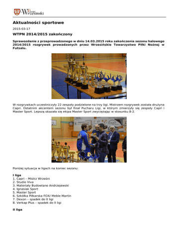 Aktualności sportowe 2015-03-17 WTPN 2014/2015 zakończony Sprawozdanie z przeprowadzonego w dniu 14.03.2015 roku zakończenia sezonu halowego 2014/2015 rozgrywek prowadzonych przez Wrzesińskie Towarzystwo Piłki Nożnej w Futsalu. W rozgrywkach uczestniczyły 22 zespoły podzielone na trzy ligi. Mistrzem rozgrywek została drużyna Capri. Ostatnim akcentem sezonu był finał Pucharu Ligi, w którym zmierzyły się zespoły Capri i Master Sport. Lepszą okazała się ekipa Master Sport zwyciężając w stosunku 8-2. Poniżej sytuacja w ligach na koniec sezonu: I liga 1. Capri – Mistrz Wrześni 2. Studio Viva 3. Materiały Budowlane Andrzejewski 4. Ignasiak Sport 5. Master Sport 6. Szkółka Piłkarska FOX/ Meble Martin 7. Dexon – spadek do II ligi 8. Verkap Plus – spadek do II ligi II liga 1. 2. 3. 4. 5. 6. 7. Elektrycznie.pl - awans do I ligi Szerszenie - awans do I ligi TW Kołaczkowo Fundamenty Pucharykopaczewski.pl Prymus Koszary - spadek do III ligi III liga 1. Techpak - awans do II ligi 2. Motoklinika - awans do II ligi 3. Mirkom - awans do II ligi 4. Intertrend 5. Obłaczkowo 6. Letniaprzygoda.eu 7. BK PRO OGK Nagrody indywidualne w poszczególnych ligach: I liga Tomasz Fitt (Capri) – najlepszy bramkarz Jakub Zakrzewicz (Ignasiak Sport) – najlepszy strzelec Maciej Trawiński (Studio Viva) – najlepszy zawodnik II liga Piotr Pirański (Szerszenie) – najlepszy bramkarz Wojciech Kopaczewski (Elektrycznie.pl) - najlepszy strzelec Jakub Długosz (Fundamenty) - najlepszy zawodnik III liga Gerard Fengler (Techpak) - najlepszy bramkarz Waldemar Przysiuda (Techpak) - najlepszy strzelec Waldemar Przysiuda (Techpak) - najlepszy zawodnik Do powyższego załączam kilka zdjęć z imprezy oraz składam podziękowania dla Starostwa Powiatowego we Wrześni za ufundowanie pucharów/nagród dla najlepszych drużyn/zawodników. Ze sportowym pozdrowieniem Wojciech Kopaczewski Prezes WTPN w Futsalu ← Poprzedni wpis Następny wpis →
