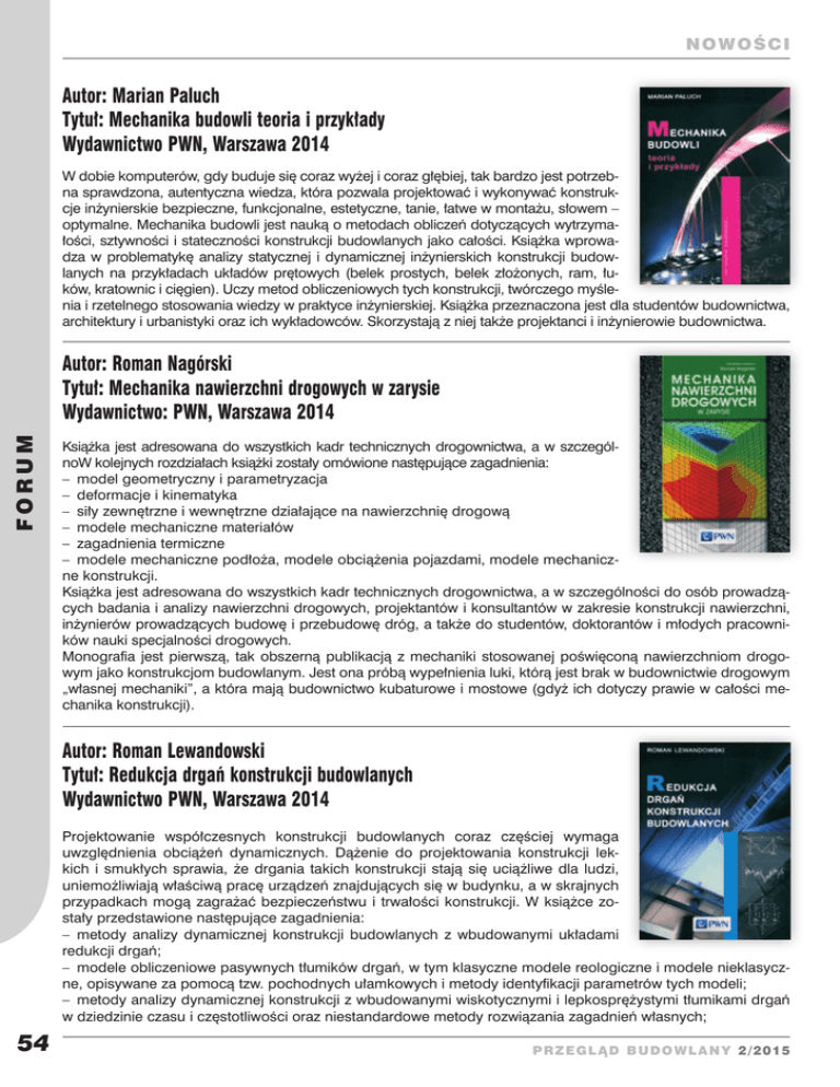 N O WO ŚCI Autor: Marian Paluch Tytuł: Mechanika budowli teoria i przykłady Wydawnictwo PWN, Warszawa 2014 W dobie komputerów, gdy buduje się coraz wyżej i coraz głębiej, tak bardzo jest potrzebna sprawdzona, autentyczna wiedza, która pozwala projektować i wykonywać konstrukcje inżynierskie bezpieczne, funkcjonalne, estetyczne, tanie, łatwe w montażu, słowem – optymalne. Mechanika budowli jest nauką o metodach obliczeń dotyczących wytrzymałości, sztywności i stateczności konstrukcji budowlanych jako całości. Książka wprowadza w problematykę analizy statycznej i dynamicznej inżynierskich konstrukcji budowlanych na przykładach układów prętowych (belek prostych, belek złożonych, ram, łuków, kratownic i cięgien). Uczy metod obliczeniowych tych konstrukcji, twórczego myślenia i rzetelnego stosowania wiedzy w praktyce inżynierskiej. Książka przeznaczona jest dla studentów budownictwa, architektury i urbanistyki oraz ich wykładowców. Skorzystają z niej także projektanci i inżynierowie budownictwa. FORUM Autor: Roman Nagórski Tytuł: Mechanika nawierzchni drogowych w zarysie Wydawnictwo: PWN, Warszawa 2014 Książka jest adresowana do wszystkich kadr technicznych drogownictwa, a w szczególnoW kolejnych rozdziałach książki zostały omówione następujące zagadnienia: – model geometryczny i parametryzacja – deformacje i kinematyka – siły zewnętrzne i wewnętrzne działające na nawierzchnię drogową – modele mechaniczne materiałów – zagadnienia termiczne – modele mechaniczne podłoża, modele obciążenia pojazdami, modele mechaniczne konstrukcji. Książka jest adresowana do wszystkich kadr technicznych drogownictwa, a w szczególności do osób prowadzących badania i analizy nawierzchni drogowych, projektantów i konsultantów w zakresie konstrukcji nawierzchni, inżynierów prowadzących budowę i przebudowę dróg, a także do studentów, doktorantów i młodych pracowników nauki specjalności drogowych. Monografia jest pierwszą, tak obszerną publikacją z mechaniki stosowanej poświęconą nawierzchniom drogowym jako konstrukcjom budowlanym. Jest ona próbą wypełnienia luki, którą jest brak w budownictwie drogowym „własnej mechaniki”, a która mają budownictwo kubaturowe i mostowe (gdyż ich dotyczy prawie w całości mechanika konstrukcji). Autor: Roman Lewandowski Tytuł: Redukcja drgań konstrukcji budowlanych Wydawnictwo PWN, Warszawa 2014 Projektowanie współczesnych konstrukcji budowlanych coraz częściej wymaga uwzględnienia obciążeń dynamicznych. Dążenie do projektowania konstrukcji lekkich i smukłych sprawia, że drgania takich konstrukcji stają się uciążliwe dla ludzi, uniemożliwiają właściwą pracę urządzeń znajdujących się w budynku, a w skrajnych przypadkach mogą zagrażać bezpieczeństwu i trwałości konstrukcji. W książce zostały przedstawione następujące zagadnienia: – metody analizy dynamicznej konstrukcji budowlanych z wbudowanymi układami redukcji drgań; – modele obliczeniowe pasywnych tłumików drgań, w tym klasyczne modele reologiczne i modele nieklasyczne, opisywane za pomocą tzw. pochodnych ułamkowych i metody identyfikacji parametrów tych modeli; – metody analizy dynamicznej konstrukcji z wbudowanymi wiskotycznymi i lepkosprężystymi tłumikami drgań w dziedzinie czasu i częstotliwości oraz niestandardowe metody rozwiązania zagadnień własnych; 54 PRZ EG L ĄD BU D OWL ANY 2/2015 NOW OŚ C I – metody badania wrażliwości konstrukcji z pasywnymi tłumikami drgań na zmianę parametrów projektowych tłumików oraz metody optymalnego doboru parametrów tłumików drgań i optymalnego rozmieszczania tych tłumików na konstrukcji; – podstawy teoretyczne analizy dynamicznych tłumików drgań jendo- i wielomasowych; – wprowadzenie do metod aktywnej i półaktywnej redukcji drgań konstrukcji budowlanych. Publikacja jest przeznaczona dla pracowników naukowych zajmujących się dynamiką konstrukcji, a w szczególności problemami redukcji drgań oraz dla projektantów obiektów narażonych na działanie sił dynamicznych, zainteresowanych nowoczesnymi sposobami redukcji drgań tych obiektów. Może też zainteresować studentów i doktorantów wydziałów budowlanych i mechanicznych. Autor: Stanisław Pisarczyk Tytuł: Gruntoznawstwo inżynierskie Wydawnictwo PWN, Warszawa 2014 FORUM W książce są omówione wybrane zagadnienia teoretyczne i praktyczne z zakresu szeroko pojętej geotechniki, tzn. mechaniki gruntów i skał, fundamentowania oraz nowych technologii stosowanych w geotechnice. Przedstawiono zwięzły opis zjawiska, najprostsze metody obliczeniowe oraz techniki wykonywania badań za pomocą ogólnie dostępnego wyposażenia laboratoryjnego. Uwzględniono dodatkowo wymagania nowych norm: PN-EN ISO 14688-1:2006 i PN-EN ISO 14688-2:2006 w zakresie oznaczania i klasyfikacji gruntów oraz nowe podejście do obliczania stanów granicznych nośności i stanu granicznego użytkowalności dla obiektów budowlanych według zasad obowiązujących w normie PN-EN 1997-1:2008 Eurokod 7. Podano nowe zasady planowania i wykonywania badań geotechnicznych oraz interpretacji i szacowania wyników. Książka jest przeznaczona dla studentów wydziałów budownictwa i inżynierii środowiska politechnik, wydziałów technicznych uniwersytetów przyrodniczych i wydziałów geologii uniwersytetów, a także dla inżynierów i techników praktyków zajmujących się projektowaniem, realizacją i użytkowaniem obiektów budowlanych oraz wykonywaniem badań podłoża gruntowego na potrzeby budownictwa, budowli ziemnych czy ochrony środowiska. Autor: Adam Rak Tytuł: Budowlane przedsięwzięcia inwestycyjne. Środowiskowe uwarunkowania przygotowania i realizacji Wydawnictwo PWN, Warszawa 2014 Wdrażanie prawa wspólnotowego Unii Europejskiej spowodowało wiele zmian przepisów prawnych i organizacyjnych związanych z procesem planowania, przygot