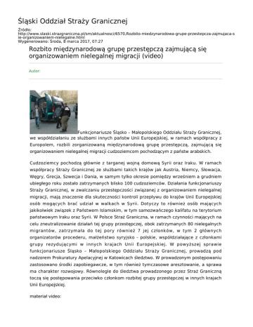 Śląski Oddział Straży Granicznej Źródło: http://www.slaski.strazgraniczna.pl/sm/aktualnosci/6570,Rozbito-miedzynarodowa-grupe-przestepcza-zajmujaca-s ie-organizowaniem-nielegalne.html Wygenerowano: Środa, 8 marca 2017, 07:27 Rozbito międzynarodową grupę przestępczą zajmującą się organizowaniem nielegalnej migracji (video) Autor: Funkcjonariusze Śląsko – Małopolskiego Oddziału Straży Granicznej, we współdziałaniu ze służbami innych państw Unii Europejskiej, w ramach współpracy z Europolem, rozbili zorganizowaną międzynarodową grupę przestępczą, zajmującą się organizowaniem nielegalnej migracji cudzoziemcom pochodzącym z państw arabskich. Cudzoziemcy pochodzą głównie z targanej wojną domową Syrii oraz Iraku. W ramach współpracy Straży Granicznej ze służbami takich krajów jak Austria, Niemcy, Słowacja, Węgry, Grecja, Szwecja i Dania, w samym tylko okresie pomiędzy wrześniem a grudniem ubiegłego roku zostało zatrzymanych blisko 100 cudzoziemców. Działania funkcjonariuszy Straży Granicznej, w zwalczaniu przestępczości związanej z organizowaniem nielegalnej migracji, mają znaczenie dla skuteczności kontroli przepływu do krajów Unii Europejskiej osób mogących brać udział w walkach w Syrii. Dotyczy to również osób mających jakikolwiek związek z Państwem Islamskim, w tym samozwańczego kalifatu na terytorium państwowym Iraku oraz Syrii. W Polsce Straż Graniczna, w ramach czynności mających na celu zneutralizowanie działań tej grupy przestępczej, obok zatrzymanych 80 nielegalnych migrantów, zatrzymała do tej pory również 7 jej członków, w tym 2 głównych organizatorów procederu, małżeństwo syryjsko - polskie, współdziałające z członkami grupy rezydującymi w innych krajach Unii Europejskiej. W powyższej sprawie funkcjonariusze Śląsko – Małopolskiego Oddziału Straży Granicznej, prowadzą pod nadzorem Prokuratury Apelacyjnej w Katowicach śledztwo. W prowadzonym postępowaniu zastosowano środki zapobiegawcze, w tym również tymczasowe aresztowanie, a sprawa ma charakter rozwojowy. Równolegle do śledztwa prowadzonego przez Straż Graniczną toczą się postępowania przeciwko członkom rozbitej grupy przestępczej w innych krajach Unii Europejskiej. materiał video: [stream provider=youtube flv=x:/youtu.be/h7vPKW4uVns embed=false share=true width=640 height=360 dock=true controlbar=over bandwidth=high autostart=false /]