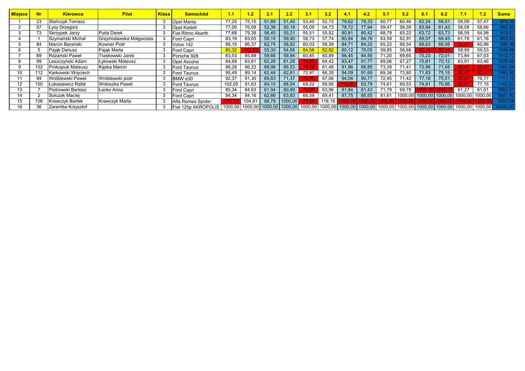 Miejsce Nr 1 2 3 4 5 6 7 8 9 10 11 12 13 14 15 16 23 57 73 1 84 5 89 99 102 112 94 100 7 2 106 36 Kierowca Stańczyk Tomasz Łysy Grzegorz Skrzypek Jerzy Szymański Michał Marcin Barański Pająk Dariusz RóŜański Paweł Leszczyński Adam Prokopiuk Mateusz Karkowski Wojciech Wróblewski Paweł Łukasiewicz Rafał Piotrowski Bartosz Solczak Maciej Krawczyk Bartek Zaremba Krzysztof Pilot Pyda Darek Grzymisławska Małgorzata Kowner Piotr Pająk Marta Traskowski Jarek Łykowski Mateusz Kępka Marcin Wróblewski piotr Wołoszka Paweł Łacko Anna Krawczyk Marta Klasa 3 3 3 3 3 3 3 3 3 3 3 3 3 3 3 3 Samochód 1.1 1.2 2.1 2.2 3.1 3.2 4.1 4.2 5.1 5.2 6.1 6.2 7.1 7.2 Suma 77,25 75,15 51,89 51,40 53,40 52,72 79,62 78,33 60,77 60,46 62,24 59,51 58,09 57,47 878,30 Opel Manta 77,00 76,08 52,38 50,18 55,09 54,73 78,72 77,94 59,47 58,59 63,94 61,43 58,09 58,66 882,30 Opel Kadett 77,68 79,38 56,45 55,21 55,51 55,52 80,81 80,42 68,79 65,22 63,72 63,73 56,59 54,98 914,01 Fiat Ritmo Abarth 83,19 83,05 59,15 59,40 58,73 57,74 85,84 84,76 63,59 62,91 69,07 69,45 61,78 61,16 959,82 Ford Capri 86,15 86,37 62,74 58,82 60,03 58,39 84,71 84,25 65,22 68,54 68,63 68,08 82,47 60,96 995,36 Volvo 142 80,32 112,72 55,30 54,66 64,58 62,92 80,12 78,05 59,85 58,66 92,14 92,14 58,99 59,53 1009,98 Ford Capri 83,53 85,88 59,66 59,94 60,85 60,89 86,45 84,56 71,20 69,65 75,23 72,01 73,84 67,03 1010,72 Porsche 928 84,68 83,81 62,26 61,28 79,08 64,42 93,47 91,77 69,06 67,27 70,81 70,12 63,91 63,46 1025,40 Opel Ascona 86,28 86,22 68,06 66,53 79,08 61,48 91,96 88,85 73,39 71,41 72,96 71,68 82,47 82,47 1082,84 Ford Taunus 95,49 89,14 62,44 62,61 72,97 66,35 94,09 91,69 69,36 73,80 71,83 75,15 82,47 82,47 1089,86 Ford Taunus 92,37 91,30 69,83 71,37 79,08 67,06 94,04 90,77 72,45 71,42 77,18 75,01 82,47 76,77 1111,12 BMW e30 102,05 91,63 84,10 68,54 69,22 69,95 116,91 93,79 74,61 69,53 74,81 70,86 82,47 77,15 1145,62 Ford Taunus 85,34 84,53 61,94 60,89 79,08 63,96 81,84 81,43 71,79 69,79 1000,00 1000,00 61,27 61,01 2862,87 Ford Capri 84,34 84,16 62,66 63,83 68,59 69,41 87,75 85,55 81,61 1000,00 1000,00 1000,00 1000,00 1000,00 5687,90 Ford Capri 112,72 104,81 88,79 1000,00 79,08 118,18 1000,00 1000,00 1000,00 1000,00 1000,00 1000,00 1000,00 1000,00 9503,58 Alfa Romeo Spider Fiat 125p AKROPOLIS 1000,00 1000,00 1000,00 1000,00 1000,00 1000,00 1000,00 1000,00 1000,00 1000,00 1000,00 1000,00 1000,00 1000,00 14000,00