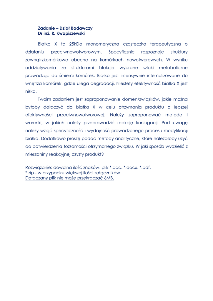 Zadanie – Dział Badawczy Dr inż. R. Kwapiszewski Białko X to 25kDa monomeryczna cząsteczka terapeutyczna o działaniu przeciwnowotworowym. Specyficznie rozpoznaje struktury zewnątrzkomórkowe obecne na komórkach nowotworowych. W wyniku oddziaływania ze strukturami blokuje wybrane szlaki metaboliczne prowadząc do śmierci komórek. Białko jest intensywnie internalizowane do wnętrza komórek, gdzie ulega degradacji. Niestety efektywność białka X jest niska. Twoim zadaniem jest zaproponowanie domen/związków, jakie można byłoby dołączyć do białka X w celu otrzymania produktu o lepszej efektywności przeciwnowotworowej. Należy zaproponować metodę i warunki, w jakich należy przeprowadzić reakcję koniugacji. Pod uwagę należy wziąć specyficzność i wydajność prowadzonego procesu modyfikacji białka. Dodatkowo proszę podać metody analityczne, które należałoby użyć do potwierdzenia tożsamości otrzymanego związku. W jaki sposób wydzielić z mieszaniny reakcyjnej czysty produkt? Rozwiązanie: dowolna ilość znaków, plik *.doc, *.docx, *.pdf, *.zip - w przypadku większej ilości załączników. Dołączany plik nie może przekraczać 6MB.