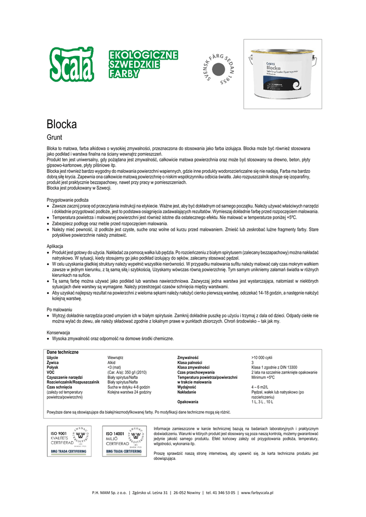 Blocka Grunt Bloka to matowa, farba alkidowa o wysokiej zmywalności, przeznaczona do stosowania jako farba izolująca. Blocka może być również stosowana jako podkład i warstwa finalna na ściany wewnątrz pomieszczeń. Produkt ten jest uniwersalny, gdy pożądana jest zmywalność, całkowicie matowa powierzchnia oraz może być stosowany na drewno, beton, płyty gipsowo-kartonowe, płyty pilśniowe itp. Blocka jest również bardzo wygodny do malowania powierzchni wapiennych, gdzie inne produkty wodorozcieńczalne się nie nadają. Farba ma bardzo dobrą siłę krycia. Zapewnia ona całkowicie matową powierzchnię o niskim współczynniku odbicia światła. Jako rozpuszczalnik stosuje się izoparafiny, produkt jest praktycznie bezzapachowy, nawet przy pracy w pomieszczeniach. Blocka jest produkowany w Szwecji. Przygotowanie podłoża Zawsze zacznij pracę od przeczytania instrukcji na etykiecie. Ważne jest, aby być dokładnym od samego początku. Należy używać właściwych narzędzi i dokładnie przygotować podłoże, jest to podstawa osiągnięcia zadawalających rezultatów. Wymieszaj dokładnie farbę przed rozpoczęciem malowania. Temperatura powietrza i malowanej powierzchni jest również istotne dla ostatecznego efektu. Nie malować w temperaturze poniżej +5ºC. Zabezpiecz podłogę oraz meble przed rozpoczęciem malowania. Należy mieć pewność, iż podłoże jest czyste, suche oraz wolne od kurzu przed malowaniem. Zmieść lub zeskrobać luźne fragmenty farby. Stare połyskliwe powierzchnie należy zmatowić. Aplikacja Produkt jest gotowy do użycia. Nakładać za pomocą wałka lub pędzla. Po rozcieńczeniu z białym spirytusem (zalecany bezzapachowy) można nakładać natryskowo. W sytuacji, kiedy stosujemy go jako podkład izolujący do sęków, zalecamy stosować pędzel. W celu uzyskania gładkiej struktury należy wypełnić wszystkie nierówności. W przypadku malowania sufitu należy malować cały czas mokrym wałkiem zawsze w jednym kierunku, z tą samą siłą i szybkością. Uzyskamy wówczas równą powierzchnię. Tym samym unikniemy załamań światła w różnych kierunkach na suficie. Tą samą farbę można używać jako podkład lub warstwa nawierzchniowa. Zazwyczaj jedna warstwa jest wystarczająca, natomiast w niektórych sytuacjach dwie warstwy są wymagane. Należy przestrzegać czasów schnięcia między warstwami. Aby uzyskać najlepszy rezultat na powierzchni z wieloma sękami należy nałożyć cienko pierwszą warstwę, odczekać 14-18 godzin, a następnie nałożyć kolejną warstwę. Po malowaniu Wytrzyj dokładnie narzędzia przed umyciem ich w białym spirytusie. Zamknij dokładnie puszkę po użyciu i trzymaj z dala od dzieci. Odpady ciekłe nie można wylać do zlewu, ale należy składować zgodnie z lokalnym prawe w punktach zbiorczych. Chroń środowisko – tak jak my. Konserwacja Wysoka zmywalność oraz odporność na domowe środki chemiczne. Dane techniczne Użycie Żywica Połysk VOC Czyszczenie narzędzi Rozcieńczalnik/Rozpuszczalnik Czas schnięcia (zależy od temperatury powietrza/powierzchni) Wewnątrz Alkid <3 (mat) (Car. A/a): 350 g/l (2010) Biały spirytus/Nafta Biały spirytus/Nafta Sucha w dotyku 4-8 godzin Kolejna warstwa 24 godziny Zmywalność Klasa palności Klasa zmywalności Czas przechowywania Temperatura powietrza/powierzchni w trakcie malowania Wydajność Nakładanie Opakowania >10 000 cykli 3 Klasa 1 zgodnie z DIN 13300 2 lata na szczelnie zamknięte opakowanie Minimum +5ºC 4 – 6 m2/L Pędzel, wałek lub natryskowo (po rozcieńczeniu) 1 L, 3 L , 10 L Powyższe dane są obowiązujące dla białej/niezmodyfikowanej farby. Po modyfikacji dane techniczne mogą się różnić. Informacje zamieszczone w karcie technicznej bazują na badaniach laboratoryjnych i praktycznym doświadczeniu. Warunki w których produkt jest stosowany są poza naszą kontrolą, możemy gwarantować jedynie jakość samego produktu. Efekt końcowy zależy od przygotowania podłoża, temperatury, wilgotności, wykonania itp. Proszę sprawdzić naszą stronę internetową, aby upewnić się, że karta techniczna produktu jest obowiązująca. P.H. MAM Sp. z o.o. | Zgórsko ul. Leśna 31 | 26-052 Nowiny | tel. 41 346 53 05 | www.farbyscala.pl