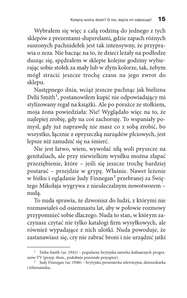 15 Kolejny wolny dzień? O nie, dajcie mi odpocząć! Wybrałem się więc z całą rodziną do jednego z tych sklepów z prezentami-duperelami, gdzie zapach różnych suszonych pachnidełek jest tak intensywny, że przyprawia o zeza. Nie bacząc na to, że dzieci leżały na podłodze dusząc się, spędzałem w sklepie kolejne godziny wybierając sobie stołek za mały lub w złym kolorze, tak, żebym mógł stracić jeszcze trochę czasu na jego zwrot do sklepu. Następnego dnia, wciąż jeszcze pachnąc jak bielizna Delii Smith 1, postanowiłem kupić nie odpowiadający mi stylizowany regał na książki. Ale po porażce ze stołkiem, moja żona powiedziała: Nie! Wyglądało więc na to, że najlepiej zrobię, gdy na coś zachoruję. To wspaniały pomysł, gdy już naprawdę nie masz co z sobą zrobić, bo wszystko, łącznie z opryszczką narządów płciowych, jest lepsze niż zanudzić się na śmierć. Nie jest łatwo, wiem, wywołać siłą woli pryszcze na genitaliach, ale przy niewielkim wysiłku można złapać przeziębienie, które – jeśli się jeszcze trochę bardziej postarać – przejdzie w grypę. Właśnie. Nawet leżenie w łóżku i oglądanie Judy Finnegan 2 przebranej za Świętego Mikołaja wygrywa z nieuleczalnym nowotworem – nudą. To nuda sprawia, że dzwonisz do ludzi, z którymi nie rozmawiałeś od osiemnastu lat, aby w połowie rozmowy przypomnieć sobie dlaczego. Nuda to stan, w którym zaczynasz czytać nie tylko katalogi firm wysyłkowych, ale również wypadające z nich ulotki. Nuda powoduje, że zastanawiasz się, czy nie zabrać broni i nie urządzić jatki 1 Delia Smith (ur. 1941) – popularna brytyjska autorka kulinarnych programów TV (przyp. tłum., podobnie pozostałe przyspisy). 2 Judy Finnegan (ur. 1948) – brytyjska prezenterka telewizyjna, dziennikarka i felietonistka..