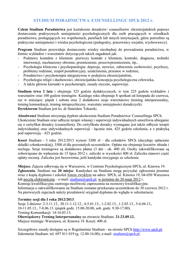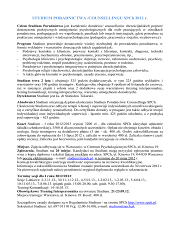 STUDIUM PORADNICTWA /COUNSELLINGU SPCh 2012 r. Celem Studium Poradnictwa jest kształcenie doradców/ counsellorów chrześcijańskich poprzez dostarczenie praktycznych umiejętności psychologicznych dla osób pracujących w ośrodkach poradnictwa, posługujących we wspólnotach, parafiach lub innych instytucjach, gdzie potrzebne są praktyczne umiejętności i wiedza psychologiczna (pedagodzy, pracownicy socjalni, wychowawcy). Program Studium przewiduje dostarczenie wiedzy niezbędnej do prowadzenia poradnictwa, w formie wykładów i warsztatów dotyczących takich zagadnień jak: - Podstawy kontaktu z klientem: pierwszy kontakt z klientem, kontrakt, diagnoza, techniki interwencji, mechanizmy obronne, przeniesienie, przeciwprzeniesienie, itp., - Psychologia kliniczna i psychopatologia: depresje, nerwice, zaburzenia osobowości, psychozy, problemy rodzinne, zespół postaborcyjny, uzależnienia, przemoc w rodzinie, - Poradnictwo i psychoterapia integratywna w podejściu chrześcijańskim, - Psychologia religii i duchowości, chrześcijańska koncepcja psychologiczna człowieka, - A także główne kierunki w psychoterapii, zasady etyczne, superwizje. Studium trwa 2 lata i obejmuje 325 godzin dydaktycznych, w tym 225 godzin wykładów i warsztatów oraz 100 godzin treningów. Każdego roku obejmuje 8 spotkań od listopada do czerwca, raz w miesiącu: piątek i sobota oraz 2 dodatkowe sesje warsztatowe (trening interpersonalny, trening komunikacji, trening intrapsychiczny, warsztaty umiejętności doradczych). Dyrektorem Studium jest ks. dr Stanisław Tokarski. Absolwenci Studium otrzymają dyplom ukończenia Studium Poradnictwa/ Counsellingu SPCh. Ukończenie Studium oraz odbycie terapii własnej i superwizji indywidualnych umożliwia ubieganie się o certyfikat doradcy (counsellora). Do certyfikatu doradcy wymagane jest także odbycie terapii indywidualnej oraz indywidualnych superwizji - łącznie min. 425 godzin szkolenia, a z praktyką pod superwizją – 625 godzin. Koszt Studium - I roku 2012/2013 wynosi 3200 zł - dla członków SPCh (decyduje opłacenie składki członkowskiej), 3500 zł dla pozostałych uczestników. Opłata nie obejmuje kosztów obiadu i noclegu. Sesje treningowe są dodatkowo płatne (3 dni - ok. 400 zł). Osoby zakwalifikowane są zobowiązane do wpłacenia do 15 lipca 2012 r. zaliczki w wysokości 400 zł. Zaliczka stanowi część opłaty rocznej. Zaliczka jest bezzwrotna, jeśli kandydat zrezygnuje ze szkolenia. Miejsce. Zajęcia odbywają się w Warszawie, w Centrum Psychologicznym SPCh, ul. Kinowa 19. Zgłoszenia. Studium ma 20 miejsc. Kandydaci na Studium mogą przysyłać zgłoszenia pisemne wraz z kopią dyplomu i szkoleń listem zwykłym na adres: SPCh, ul. Kinowa 19, 04-030 Warszawa lub pocztą elektroniczną – e-mail: [email protected], w terminie do 20 maja 2012 r. Komisja kwalifikacyjna zastrzega możliwość zaproszenia na rozmowy kwalifikacyjne. Informacja o zakwalifikowaniu na Studium zostanie przekazana uczestnikom do 30 czerwca 2012 r. Na pierwszych zajęciach należy przedstawić oryginał dyplomu do wglądu w sekretariacie. Terminy sesji dla I roku 2012/2013: Sesje 2-dniowe: 2-3.11.12., 30.11-1.12.12., 4-5.01.13., 1-2.02.13., 1-2.03.13., 5-6.04.13., 10-11.05.13., 7-8.06.13. (piątek godz. 15.00-20.00, sob. godz. 9.30-17.00). Trening Komunikacji: 14-16.03.13. Obowiązkowy Trening Interpersonalny na otwarcie Studium: 21-23.09.12. Miejsce treningu: Warszawa, ul. Kinowa 19. Koszt: 400 zł. Szczegółowe zasady dostępne są w Regulaminie Studium - na stronie SPCh http://www.spch.pl. Sekretariat Studium: tel. 697 011 019 (g. 12.00-16.00), e-mail: [email protected]. STUDIUM PORADNICTWA /COUNSELLINGU SPCh 2012 Program ramowy Bloki Tematyczne Treningi – self experience Wprowadzenie. Zagadnienia etyczne Psychologia kliniczna, psychopatologia Podstawy kontaktu z klientem Poradnictwo psychologiczne w podejściu chrześcijańskim – wykłady i warsztaty Główne kierunki w psychoterapii Psychologia religii i duchowości Superwizje Treningi – self experience WUD - Warsztaty Umiejętności Doradczych Rok I Trening Interpersonalny 25 6 24 30 30 Rok II Trening Intrapsychiczny 25 18 8 64 14 8 Trening Komunikacji 25 14 8 WUD 25 Prowadzący zajęcia: 1. Giblewska Anna – psycholog, psychoterapeuta, Ośrodek Rodziny Warszawa-Bemowo 2. Dr Golczyńska Maria - psychiatra, psychoterapeuta, superwizor, SPCh, Polskie Towarzystwo Psychiatryczne 3. Ks. prof. UKSW dr hab. Jaworski Romuald - psycholog, psychoterapeuta, superwizor, przewodniczący ZG SPCh, wykładowca UKSW, Centrum Psychologiczne SPCh 4. Maciocha Ewa - psycholog, seksuolog, Instytut Psychiatrii i Neurologii, SPCh 5. Ostaszewska Anna – psychoterapeuta, superwizor, europejski certyfikat psychoterapeuty-ECP, przewodnicząca Sekcji Psychoterapii SPCh, Centrum Psychologiczne SPCh 6. Dr Próchniewicz Jolanta - psycholog, wykładowca UAM, SPCh, Poznań 7. Rusak Agata – psycholog, psychoterapeuta, superwizor, europejski certyfikat psychoterapeutyECP, SPCh 8. Stelmaszczyk Anna - terapeuta rodzinny i małżeński, specjalista terapii zespołu postaborcyjnego, europejski certyfikat psychoterapeuty - ECP, Polskie Towarzystwo Psychiatryczne, SPCh, Łódź 9. Talmont Katarzyna - psychoterapeuta, Centrum Psychologiczne SPCh 10. Ks. dr Tokarski Stanisław - psycholog, psychoterapeuta, superwizor, Ośrodek Pomocy Psychologicznej SPCh, wykładowca UKSW, wiceprzewodniczący ZG SPCh 11. Prof. dr hab. Załuska Maria - psychiatra, IPiN, dyrektor Oddziału Psychiatrycznego w Szpitalu Bielańskim, wykładowca UKSW, SPCh, Polskie Towarzystwo Psychiatryczne 12. Zimna-Rycerz Ewa - psycholog, psychoterapeuta, Ośrodek Pomocy Psychologicznej SPCh. ZGŁOSZENIE Proszę o zakwalifikowanie mnie na Studium Poradnictwa/ Counsellingu SPCh w edycji 2012. Imię i nazwisko ........................................................…….PESEL:……………….............................. Data urodzenia:.........................