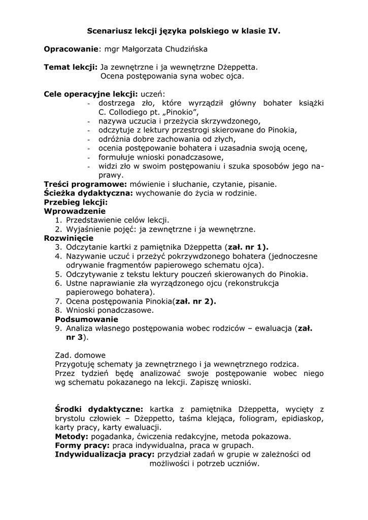 Scenariusz lekcji języka polskiego w klasie IV. Opracowanie: mgr Małgorzata Chudzińska Temat lekcji: Ja zewnętrzne i ja wewnętrzne Dżeppetta. Ocena postępowania syna wobec ojca. Cele operacyjne lekcji: uczeń: - dostrzega zło, które wyrządził główny bohater książki C. Collodiego pt. „Pinokio”, - nazywa uczucia i przeżycia skrzywdzonego, - odczytuje z lektury przestrogi skierowane do Pinokia, - odróżnia dobre zachowania od złych, - ocenia postępowanie bohatera i uzasadnia swoją ocenę, - formułuje wnioski ponadczasowe, - widzi zło w swoim postępowaniu i szuka sposobów jego naprawy. Treści programowe: mówienie i słuchanie, czytanie, pisanie. Ścieżka dydaktyczna: wychowanie do życia w rodzinie. Przebieg lekcji: Wprowadzenie 1. Przedstawienie celów lekcji. 2. Wyjaśnienie pojęć: ja zewnętrzne i ja wewnętrzne. Rozwinięcie 3. Odczytanie kartki z pamiętnika Dżeppetta (zał. nr 1). 4. Nazywanie uczuć i przeżyć pokrzywdzonego bohatera (jednoczesne odrywanie fragmentów papierowego schematu ojca). 5. Odczytywanie z tekstu lektury pouczeń skierowanych do Pinokia. 6. Ustne naprawianie zła wyrządzonego ojcu (rekonstrukcja papierowego bohatera). 7. Ocena postępowania Pinokia(zał. nr 2). 8. Wnioski ponadczasowe. Podsumowanie 9. Analiza własnego postępowania wobec rodziców – ewaluacja (zał. nr 3). Zad. domowe Przygotuję schematy ja zewnętrznego i ja wewnętrznego rodzica. Przez tydzień będę analizować swoje postępowanie wobec niego wg schematu pokazanego na lekcji. Zapiszę wnioski. Środki dydaktyczne: kartka z pamiętnika Dżeppetta, wycięty z brystolu człowiek – Dżeppetto, taśma klejąca, foliogram, epidiaskop, karty pracy, karty ewaluacji. Metody: pogadanka, ćwiczenia redakcyjne, metoda pokazowa. Formy pracy: praca indywidualna, praca w grupach. Indywidualizacja pracy: przydział zadań w grupie w zależności od możliwości i potrzeb uczniów. Załącznik nr 1. Wspomnienia Dżeppetta Jestem Dżeppetto. Wystrugałem z kawałka drewna pajacai nazwałem go Pinokio. Myślałem, że będzie mi na starość ostoją. O, jakże się myliłem! Najpierw uciekł z domu. Ludzie, którzy przyglądali się scenie pogoni za synem powiedzieli, że to ja jestem okrutny wobec pajaca. Zostałem więc przez niego zamknięty w więzieniu. Kiedy wróciłem, zastałem Pinokia głodnego i zziębniętego. Miał spalone stopy. Bez namysłu oddałem mu swoje śniadanie – trzy gruszki. Było mi go żal. Ten zaś zaczął wybrzydzać i nie chciał zjeść skórek. Dopiero głód go zmusił do tego. Byłem dumny, kiedy syn oznajmił mi, że pójdzie do szkoły. Zrobiłem mu piękne ubranko z papieru w kwiatki, sprzedałem swój jedyny kaftan, aby kupić mu elementarz. A on co? Sprzedał swój cenny podręcznik, bo zabrakło mu pieniędzy na bilet wstępu do Teatru Marionetek. Otrzymał od Ogniojada pięć złotych cekinów, aby wspomóc naszą rodzinę finansowo. Jednak mój syn dał się namówić na wyprawę do Krainy Głupków, gdyż chciał w cudowny sposób się wzbogacić – bez uczciwej pracy oczywiście. Później na Polu Cudów ostatecznie pozbył się majątku. Na wyspie Pracowitych Pszczół żebrał o jałmużnę. Nie chciał w zamian pracować, chciał jeść za darmo. Boże, przecież uczyłem go czegoś innego! Szczytem wszystkiego była wyprawa z Knotem do Krainy Zabawek – wiecznej zabawy, beztroski i radości. Tam Pinokio dopiero dostał nauczkę. Zmienił się w osła. Jaki to wstyd dla biednego, ale uczciwego starca. Jestem już zmęczony tymi kłopotami i błędami życiowymi Pinokia. Mam nadzieję, że to się zmieni. Załącznik nr 2. Ocena postępowania bohatera (1.)........................................Pinokio jako pajac postępował (2.)..................................... , ponieważ (3.)........................... ............................................................................................... ............................................................................................. . Materiały na folii: 1. Sądzę, że ... Moim zdaniem ... Uważam, że ... 2. odpowiedzialnie nieodpowiedzialnie źle dobrze rozsądnie nierozsądnie rozważnie nierozważnie nieodpowiednio odpowiednio 3. skrzywdził zasmucał ranił nie szanował naśmiewał się wymuszał wyłudzał ... Załącznik nr 3. Karta ewaluacji W jaki sposób najczęściej ranię ja wewnętrzne moich rodziców? ................................................................................................... ................................................................................................... Jak mogę to naprawić? ................................................................................................... ...................................................................................................