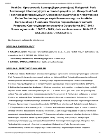 16.04.2013 bzp0.portal.uzp.gov.pl/index.php?ogloszenie=show&pozycja=150526&rok=2013-04-16 Kraków: Opracowanie koncepcji gry promującej Małopolski Park Technologii Informacyjnych w ramach projektu pn. Małopolski Park Technologii Informacyjnych-Ośrodek Innowacyjności Krakowskiego Parku Technologicznego współfinansowanego ze środków Europejskiego Funduszu Rozwoju Regionalnego w ramach Programu Operacyjnego Innowacyjna Gospodarka 2007-2013 Numer ogłoszenia: 150526 - 2013; data zamieszczenia: 16.04.2013 OGŁOSZENIE O KONKURSIE Zamieszczanie ogłoszenia: obowiązkowe. SEKCJA I: ZAMAWIAJĄCY I. 1) NAZWA I ADRES: Krakowski Park Technologiczny Sp. z o.o., Al. Jana Pawła II 41 L, 31-864 Kraków, woj. małopolskie, tel. 012 6401940, faks 012 6401945. Adres strony internetowej zamawiającego: www.sse.krakow.pl I. 2) RODZAJ ZAMAWIAJĄCEGO: Inny: Spółka prawa handlowego. SEKCJA II: PRZEDMIOT KONKURSU II.1) Nazwa nadana konkursowi przez zamawiającego: Opracowanie koncepcji gry promującej Małopolski Park Technologii Informacyjnych w ramach projektu pn. Małopolski Park Technologii Informacyjnych-Ośrodek Innowacyjności Krakowskiego Parku Technologicznego współfinansowanego ze środków Europejskiego Funduszu Rozwoju Regionalnego w ramach Programu Operacyjnego Innowacyjna Gospodarka 2007-2013. II.2) Określenie przedmiotu konkursu: 1. Konkurs prowadzony jest zgodnie z przepisami ustawy z dnia 29 stycznia 2004 r. Prawo zamówień publicznych (Dz. U. z 2010 r. Nr 113, poz.759 z późn. zm.) zwanej dalej ustawą Pzp oraz wydanymi do niej rozporządzeniami wykonawczymi. 2. Konkurs jest realizowany w ramach Projektu pn. Małopolski Park Technologii Informacyjnych - Ośrodek Innowacyjności Krakowskiego Parku Technologicznego współfinansowanego ze środków Europejskiego Funduszu Rozwoju Regionalnego w ramach Programu Operacyjnego Innowacyjna Gospodarka 2007-2013, oś priorytetowa 5 Dyfuzja Innowacji, Działanie 5.3 Wspieranie Ośrodków Innowacyjności. 3. Konkurs jest konkursem jednoetapowym, w którym uczestnicy składają wnioski o dopuszczenie do udziału w konkursie, a Zamawiający dopuszcza do udziału w konkursie i zaprasza do składania prac konkursowych Wykonawców spełniających warunki udziału w konkursie. 4. Celem konkursu jest uzyskanie najlepszej pod względem kreacji i innowacji, funkcjonalnym, estetycznym, realizacyjnym koncepcji i gry promującej Małopolski Park Technologii Informacyjnych pn. Małopolski Park Technologii Informacyjnych - Ośrodek Innowacyjności Krakowskiego Parku Technologicznego współfinansowany ze środków Europejskiego Funduszu Rozwoju Regionalnego w ramach Programu bzp0.portal.uzp.gov.pl/index.php?ogloszenie=show&pozycja=150526&rok=2013-04-16 1/3 16.04.2013 bzp0.portal.uzp.gov.pl/index.php?ogloszenie=show&pozycja=150526&rok=2013-04-16 Operacyjnego Innowacyjna Gospodarka 2007-2013, oś priorytetowa 5 Dyfuzja Innowacji, Działanie 5.3 Wspieranie Ośrodków Innowacyjności. 5. Założenia dla koncepcji gry: 1) Gra ma być przede wszystkim narzędziem marketingowym, służącym do promocji marki i oferty Małopolskiego Parku Technologii Informacyjnych, największej inwestycji Krakowskiego Parku Technologicznego. Opis projektu stanowi załącznik do Regulaminu Konkursu. Istotne informacje o projekcie są dostępne również na stronach internetowych www.kpt.krakow.pl i www.mpti.krakow.pl. 2) W projekcie gry najważniejsze będą jej walory graficzne. Projekt powinien być atrakcyjny wizualnie i w jak największym stopniu w swojej fabule powinien wykorzystywać motyw marki, funkcjonalności i budynku Małopolskiego Parku Technologii Informacyjnych. 3) Gra powinna być dostępna jako aplikacja działająca w systemach operacyjnych IOS i Android. Będzie ona udostępniana przez KPT w formie gadżetu reklamowego na nośnikach USB i CD oraz do ściągnięcia ze strony www.kpt.krakow.pl i www.mpti.krakow.pl i na innych stronach internetowych prowadzonych przez Zamawiającego obecnie lub w przyszłości. 4) Realizacja przedsięwzięcia współfinansowana jest ze środków Europejskiego Funduszu Rozwoju Regionalnego w ramach Programu Operacyjnego Innowacyjna Gospodarka, Działanie 5.3. II.3) Wspólny Słownik Zamówień (CPV): 72.21.29.11-8, 72.21.20.00-4, 72.26.00.00-5. SEKCJA III: INFORMACJE O CHARAKTERZE PRAWNYM, EKONOMICZNYM, FINANSOWYM I TECHNICZNYM WARUNKI UDZIAŁU Wymagania, jakie muszą spełniać uczestnicy konkursu: 1. W konkursie mogą brać udział Uczestnicy, którzy nie podlegają wykluczeniu z postępowania na podstawie art. 24 ust. 1 i 2 ustawy Pzp oraz spełniają warunki określone na podstawie art. 22 ust. 1 ustawy Pzp, dla których opis sposobu dokonania oceny spełniania został określony w pkt. 2. 2. O udzielenie zamówienia mogą ubiegać się Wykonawcy, którzy spełniają warunki dotyczące: 1) posiadania uprawnień do wykonywania określonej działalności lub czynności, jeżeli przepisy prawa nakładają obowiązek ich posiadania: Zamawiający nie precyzuje w tym zakresie żadnych wymagań, których spełnianie Uczestnik zobowiązany jest wykazać w sposób szczególny. 2) posiadania wiedzy i doświadczenia: Uczestnik musi wykazać się doświadczeniem, w wykonaniu w okresie ostatnich 3 lat przed upływem terminu składania wniosków o dopuszczenie do udziału w Konkursie, a jeżeli okres prowadzenia działalności jest krótszy - w tym okresie co najmniej czterech gier na przynajmniej jedną z następujących platform: PC, Android, iOS, Mac (przez wykonanie będzie rozumiane zaprojektowanie i wydanie gry). 3) dysponowania odpowiednim potencjałem technicznym oraz osobami zdolnymi do wykonania zamówienia: Zamawiający nie precyzuje w tym zakresie żadnych wymagań, których spełnianie Uczestnik zobowiązany jest wykazać w sposób szczególny. 4) sytuacji ekonomicznej i finansowej: Zamawiający nie precyzuje w tym zakresie żadnych wymagań, których spełnianie Uczestnik zobowiązany jest wykazać w sposób szczególny. SEKC