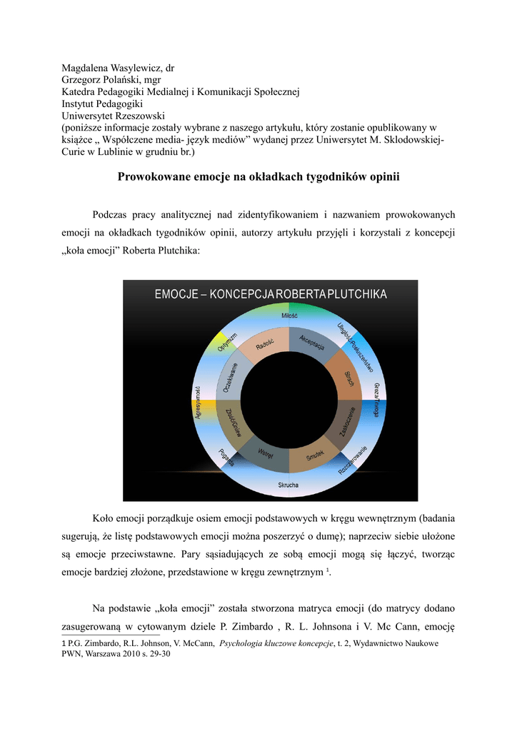 Magdalena Wasylewicz, dr Grzegorz Polański, mgr Katedra Pedagogiki Medialnej i Komunikacji Społecznej Instytut Pedagogiki Uniwersytet Rzeszowski (poniższe informacje zostały wybrane z naszego artykułu, który zostanie opublikowany w książce „ Współczene media- język mediów” wydanej przez Uniwersytet M. SklodowskiejCurie w Lublinie w grudniu br.) Prowokowane emocje na okładkach tygodników opinii Podczas pracy analitycznej nad zidentyfikowaniem i nazwaniem prowokowanych emocji na okładkach tygodników opinii, autorzy artykułu przyjęli i korzystali z koncepcji „koła emocji” Roberta Plutchika: Koło emocji porządkuje osiem emocji podstawowych w kręgu wewnętrznym (badania sugerują, że listę podstawowych emocji można poszerzyć o dumę); naprzeciw siebie ułożone są emocje przeciwstawne. Pary sąsiadujących ze sobą emocji mogą się łączyć, tworząc emocje bardziej złożone, przedstawione w kręgu zewnętrznym 1. Na podstawie „koła emocji” została stworzona matryca emocji (do matrycy dodano zasugerowaną w cytowanym dziele P. Zimbardo , R. L. Johnsona i V. Mc Cann, emocję 1 P.G. Zimbardo, R.L. Johnson, V. McCann, Psychologia kluczowe koncepcje, t. 2, Wydawnictwo Naukowe PWN, Warszawa 2010 s. 29-30 „duma”). Następnie autorzy artykułu analizowali okładki tygodników: „Polityka”, „Uważam Rze”, ”Wprost” i „Newsweek” ukazujących się od 01.05.2011 r. do 16.04.2012 r. - po pięćdziesiąt kolejnych numerów. Emocje sprowokowane przez obrazy na okładkach poszczególnych numerów tygodników były oceniane i sygnowane na matrycy. Dane zostały przeliczone na wartości procentowe i zaprezentowane w formie graficznej. Jako sędziowie kompetentni, autorzy artykuły, dla zobiektywizowania swojej pracy podczas analizy i oceniania prowokowanych emocji, przyjęli formułę poznawczego odseparowania się od własnych poglądów politycznych, światopoglądowych oraz preferencji kulturowych i estetycznych. Wyniki badania Poszczególne wykresy obrazują procentowe występowanie wyszczególnionych emocji na okładkach kolejnych pięćdziesięciu numerach tygodników (200 okładek): Wnioski 1. Dane z badania emocji prowokowanych przez analizowane okładki ukazują ogromną przewagę emocji negatywnych nad pozytywnymi. Wyjątek stanowi emocja dumy – jest ona przede wszystkim związana z obrazami (fotografiami) postaci, przede wszystkim polityków, artystów. Prezentowana przez te postaci duma zdaje się być atrybutem ich roli, czy też zawodów, które wykonują(a pewnie i cech osobowości). 2. Przewaga emocji negatywnych nad pozytywnymi na ekranach - okładkach tygodników opinii, które przecież są i reklamą periodyków i maja prowokować do zakupu egzemplarza czasopisma - jest związana ze sposobem przetwarzania informacji przez człowieka. Badania nad konsekwencjami nastroju wskazują, że pozytywne i negatywne przeżycia emocjonalne wzbudzają odmienne sposoby przetwarzania danych. Afekt pozytywny prowadzi zwykle do bardziej pobieżnego, heurystycznego przetwarzania informacji, a więc do posługiwania się przez ludzi znanymi skryptami, stereotypami. Natomiast afekt negatywny skutkuje bardziej systematycznym, analitycznym i kontrolowanym przetwarzaniem informacji przy pełniejszym uwzględnianiu szczegółów2. Dla osób interesujących się światem polityki, życia społecznego, kulturalnego, zmianami we współczesnym świecie, które są czytelnikami, bądź potencjalnymi czytelnikami tygodników opinii, w kontekście możliwości poszerzenia swojej wiedzy, ten drugi sposób przetwarzania informacji wydaje się adekwatny. Okładka tygodnika, jako reklama jego zawartości,, prowokująca negatywne emocje może bardziej przyciągać uwagę i chęć analizy zawartości danego numeru od okładki prowokującej emocje pozytywne. 3. Treścią okładek tygodników są obrazy i słowa. Warto także wspomnieć o teorii A. Paivio, która mówi, że każda informacja może być zapisana w kodzie werbalnym, wizualnym lub w obu kodach jednocześnie. Ta ostatnia możliwość jest najbardziej korzystna dla efektów pamięciowych. Pamięć informacji obrazowej wydaje się być zdeterminowana przez umiejętność nadawania obrazowi interpretacji znaczeniowej. Lepiej zapamiętujemy materiał słowny, który był jednocześnie wyobrażany i materiału obrazowego omawianego w trakcie zapamiętywania. Z teorii podwójnego kodowania A. Paivio wynika, że nie tylko słowo ułatwia zapamiętywanie obrazu, ale dzieje się też odwrotnie – obraz kojarzony z tekstem powinien być efektywnym mediatorem w zapamiętywaniu materiału werbalnego. W wielu badaniach potwierdzono efekt wyższości anemicznej obrazów: stwierdzono, że obrazy są najczęściej lepiej pamiętane niż odpowiadające im słowa3. 2 G. C. Clore, Dlaczego przeżywamy emocje, w: P. Ekman, R.J. Davidson. Natura emocji. Gdańskie Wydawnictwo Psychologiczne. Sopot 2012. s. 94-102 3 M. Jagodzińska, Obraz w procesie poznania i uczenia się, WSiP, Warszawa 1991 4. Okładki tygodników opinii są ekranami – zawierają obrazy, fotografie, grafiki w specyficzny sposób „wykadrowane”, nie zawierające wielu treści, zwykle jest to jeden, wiodący temat (obraz ze sloganem), który ma zwrócić uwagę i sprowokować emocje, tak by potencjalny czytelnik spostrzegł, oglądnął i zainteresował się przekazem. Ten efekt perswazji, w kontekście nadmiaru informacji, tytułów, obrazów, sloganów innych wydawców, których produkt zestawiony jest w salonach prasowych zdaje się ważny. Model szans rozpracowania przekazu, autorstwa R. Petty i J. Cacioppo, mówi od dwóch torach dochodzenia do skutku w procesie perswazji: centralnym i peryferyjnym. Centralny tor perswazji zawiera staranne i przemyślane przetwarzanie informacji zawartej w przekazie, a skuteczność przekazu jest związana z jego zdolnością do wywołania przychylnych reakcji poznawczych odbiorcy. Peryferyjny tor perswazji opie