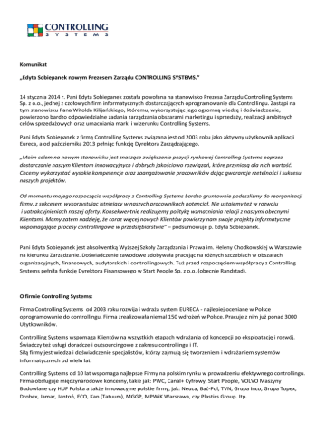 Komunikat „Edyta Sobiepanek nowym Prezesem Zarządu CONTROLLING SYSTEMS.” 14 stycznia 2014 r. Pani Edyta Sobiepanek została powołana na stanowisko Prezesa Zarządu Controlling Systems Sp. z o.o., jednej z czołowych firm informatycznych dostarczających oprogramowanie dla Controllingu. Zastąpi na tym stanowisku Pana Witolda Kilijańskiego, któremu, wykorzystując jego ogromną wiedzę i doświadczenie, powierzono bardzo odpowiedzialne zadania zarządzania obszarami marketingu i sprzedaży, realizacji ambitnych celów sprzedażowych oraz umacniania marki i wizerunku Controlling Systems. Pani Edyta Sobiepanek z firmą Controlling Systems związana jest od 2003 roku jako aktywny użytkownik aplikacji Eureca, a od października 2013 pełniąc funkcję Dyrektora Zarządzającego. „Moim celem na nowym stanowisku jest znaczące zwiększenie pozycji rynkowej Controlling Systems poprzez dostarczanie naszym Klientom innowacyjnych i dobrych jakościowo rozwiązań, które przyniosą dla nich wartość. Chcemy wykorzystać wysokie kompetencje oraz zaangażowanie pracowników dając gwarancje rzetelności i sukcesu naszych projektów. Od momentu mojego rozpoczęcia współpracy z Controlling Systems bardzo gruntownie podeszliśmy do reorganizacji firmy, z sukcesem wykorzystując istniejący w naszych pracownikach potencjał. Nie ustajemy też w rozwoju i uatrakcyjnieniach naszej oferty. Konsekwentnie realizujemy politykę wzmacniania relacji z naszymi obecnymi Klientami. Mamy zatem nadzieję, że coraz więcej nowych Klientów powierzy nam swoje projekty informatyczne wspomagające procesy controllingowe w przedsiębiorstwie” – podsumowuje p. Edyta Sobiepanek. Pani Edyta Sobiepanek jest absolwentką Wyższej Szkoły Zarządzania i Prawa im. Heleny Chodkowskiej w Warszawie na kierunku Zarządzanie. Doświadczenie zawodowe zdobywała pracując na różnych szczeblach w obszarach organizacyjnych, finansowych, audytorskich i controllingowych. Tuż przed rozpoczęciem współpracy z Controlling Systems pełniła funkcję Dyrektora Finansowego w Start People Sp. z o.o. (obecnie Randstad). O firmie Controlling Systems: Firma Controlling Systems od 2003 roku rozwija i wdraża system EURECA - najlepiej oceniane w Polsce oprogramowanie do controllingu. Firma zrealizowała niemal 150 wdrożeń w Polsce. Pracuje z nim już ponad 3000 Użytkowników. Controlling Systems wspomaga Klientów na wszystkich etapach wdrażania od koncepcji po eksploatację i rozwój. Świadczy też usługi doradcze i outsourcingowe z zakresu controllingu i IT. Siłą firmy jest wiedza i doświadczenie specjalistów, którzy zajmują się tworzeniem i wdrażaniem systemów informatycznych od wielu lat. Controlling Systems od 10 lat wspomaga najlepsze Firmy na polskim rynku w prowadzeniu efektywnego controllingu. Firma obsługuje międzynarodowe koncerny, takie jak: PWC, Canal+ Cyfrowy, Start People, VOLVO Maszyny Budowlane czy HUF Polska a także innowacyjne polskie firmy, jak: Neuca, Bać-Pol, TVN, Grupa Inco, Grupa Topex, Drobex, Jamar, Jantoń, ECO, Kan (Tatuum), MGGP, MPWiK Warszawa, czy Plastics Group. Itp. Kontakt: Witold Kilijański, Dyrektor ds. sprzedaży i marketingu tel. 0048 71 325 38 70, kom. 601 79 77 83, [email protected] Maciej Kędracki, Marketing manager tel. 0048 71 325 38 70, kom. 695 133 888, [email protected] CONTROLLING SYSTEMS sp. z o.o., Sąd Rejonowy dla Wrocławia - Fabryczna, VI Wydział Gospodarczy KRS NR 0000175303, kapitał zakładowy 73 000 PLN w całości opłacony NIP 895-179-99-52, REGON 932948275