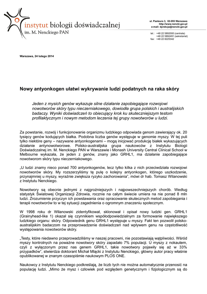 ul. Pasteura 3, 02-093 Warszawa http://www.nencki.gov.pl e-mail: [email protected] tel.: +48 22 5892000 (centrala) +48 22 5892491 (sekretariat) fax: +48 22 8225342 Warszawa, 24 lutego 2014 Nowy antyonkogen ułatwi wykrywanie ludzi podatnych na raka skóry Jeden z mysich genów wykazuje silne działanie zapobiegające rozwojowi nowotworów skóry typu nieczerniakowego, dowiodła grupa polskich i australijskich badaczy. Wyniki doświadczeń to obiecujący krok ku skuteczniejszym testom profilaktycznym i nowym metodom leczenia tej grupy nowotworów u ludzi. Za powstanie, rozwój i funkcjonowanie organizmu ludzkiego odpowiada genom zawierający ok. 20 tysięcy genów kodujących białka. Podobna liczba genów występuje w genomie myszy. W tej puli tylko niektóre geny – nazywane antyonkogenami – mogą inicjować produkcję białek wykazujących działanie antynowotworowe. Polsko-australijska grupa naukowców z Instytutu Biologii Doświadczalnej im. M. Nenckiego PAN w Warszawie i Monash University Central Clinical School w Melbourne wykazała, że jeden z genów, znany jako GRHL1, ma działanie zapobiegające nowotworom skóry typu nieczerniakowego. „U ludzi znamy nieco ponad 700 antyonkogenów, lecz tylko kilka z nich przeciwdziała rozwojowi nowotworów skóry. My rozszerzyliśmy tę pulę o kolejny antyonkogen, którego uszkodzenie, przynajmniej u myszy, wyraźnie zwiększa ryzyko zachorowania”, mówi dr hab. Tomasz Wilanowski z Instytutu Nenckiego. Nowotwory są obecnie jednymi z najgroźniejszych i najpowszechniejszych chorób. Według statystyk Światowej Organizacji Zdrowia, rocznie na całym świecie umiera na nie ponad 8 mln ludzi. Zrozumienie przyczyn ich powstawania oraz opracowanie skutecznych metod zapobiegania i terapii nowotworów to w tej sytuacji zagadnienia o ogromnym znaczeniu społecznym. W 1998 roku dr Wilanowski zidentyfikował, sklonował i opisał nowy ludzki gen. GRHL1 (Grainyhead-like 1) okazał się czynnikiem współodpowiedzialnym za formowanie największego ludzkiego organu: skóry. Odpowiednik genu GRHL1 występuje u myszy. Fakt ten pozwolił polskoaustralijskim badaczom na przeprowadzenie doświadczeń nad wpływem genu na częstotliwość występowania nowotworów skóry. „Testy, które niedawno przeprowadziliśmy w naszej pracowni, nie pozostawiają wątpliwości. Wśród myszy kontrolnych na poważne nowotwory skóry zapadało 7% populacji. U myszy z nokautem, czyli z wyłączonym przez nas genem GRHL1, takie nowotwory pojawiły się aż w 33% przypadków”, stwierdza doktorant Michał Mlącki z Instytutu Nenckiego, główny autor pracy właśnie opublikowanej w znanym czasopiśmie naukowym PLOS ONE. Naukowcy z Instytutu Nenckiego podkreślają, że liczb tych nie można automatycznie przenosić na populację ludzi. „Mimo że mysz i człowiek pod względem genetycznym i fizjologicznym są do siebie bardzo podobne, są to jednak inne organizmy. Myszy są tylko modelami badawczymi dolegliwości ludzkich i pozwalają na lepsze zrozumienie procesów chorobowych”, mówi Michał Mlącki. „Dziś nie możemy jeszcze jednoznacznie odpowiedzieć na pytanie, czy ludzie z uszkodzonym genem GRHL1 będą zapadali na nowotwory nieczerniakowe pięciokrotnie częściej, jak myszy, czy też będzie to wzrost czterokrotny lub sześciokrotny. Badania nad ustaleniem skali tego wzrostu w ludzkiej populacji dopiero się zaczęły”, zaznacza dr Wilanowski. Znalezienie nowego antyonkogenu to pierwszy krok ku opracowaniu testów pozwalających wykrywać uszkodzony gen GRHL1 u dzieci i dorosłych. W przyszłości osoby świadome wady genetycznej mogłyby podejmować działania zapobiegawcze obniżające ryzyko zachorowania, na przykład unikać solariów, właściwie się ubierać w słoneczne dni czy stosować kremy skuteczniej blokujące promieniowanie ultrafioletowe. „Sam gen to tylko nośnik informacji. Za antynowotworowe działanie genu GRHL1 odpowiada kodowane przez niego białko. Teraz, gdy znamy efekty działania tego białka, chcemy spróbować znaleźć sposób na stymulowanie jego aktywności w organizmie człowieka. A to już droga nie tylko do profilaktyki, ale także do przyszłych leków, które można byłoby podawać chorym”, mówi dr Wilanowski. Badania nad nowym antyonkogenem zostały sfinansowane ze środków Narodowego Centrum Nauki, Europejskiej Organizacji Biologii Molekularnej i 7. Programu Ramowego Unii Europejskiej. Instytut Biologii Doświadczalnej im. M. Nenckiego Polskiej Akademii Nauk, utworzony w 1918 roku, jest największym nieuniwersyteckim ośrodkiem badań biologicznych w Polsce. Do priorytetowych dziedzin podejmowanych w Instytucie należą: neurobiologia, neurofizjologia, biologia i biochemia komórkowa oraz biologia molekularna – w skalach złożoności od organizmów tkankowych przez organelle komórkowe do białek i genów. W Instytucie działa 40 laboratoriów, m.in. nowoczesnej Mikroskopii Konfokalnej, Cytometrii Przepływowej i Skaningowej, Mikroskopii Elektronowej, Testów Behawioralnych i Elektrofizjologii. Instytut dysponuje nowoczesną aparaturą badawczą i zmodernizowaną zwierzętarnią, pozwalającą na hodowlę zwierząt laboratoryjnych, także transgenicznych, według najwyższych standardów. Poziom prac eksperymentalnych, publikacje i silne związki z nauką światową plasują Instytut wśród wiodących placówek biologicznych Europy. KONTAKTY: dr hab. Tomasz Wilanowski Instytut Biologii Doświadczalnej im. M. Nenckiego w Warszawie tel. +48 22 5892311 email: [email protected] PRACE NAUKOWE: „Loss of Grainy head-like 1 is associated with disruption of the epidermal barrier and squamous cell carcinoma of the skin”; Michał Mlącki, Charbel Darido, Stephen M. Jane, Tomasz Wilanowski; PLOS ONE; DOI: 10.1371/journal.pone.0089247 http://dx.plos.org/10.1371/journal.pone.0089247 POWIĄZANE STRONY WWW: http://www.nencki.gov.pl/ Strona Instytutu Biologii Doświadczalnej im. M. Nenckiego w Warszawie. http://pre