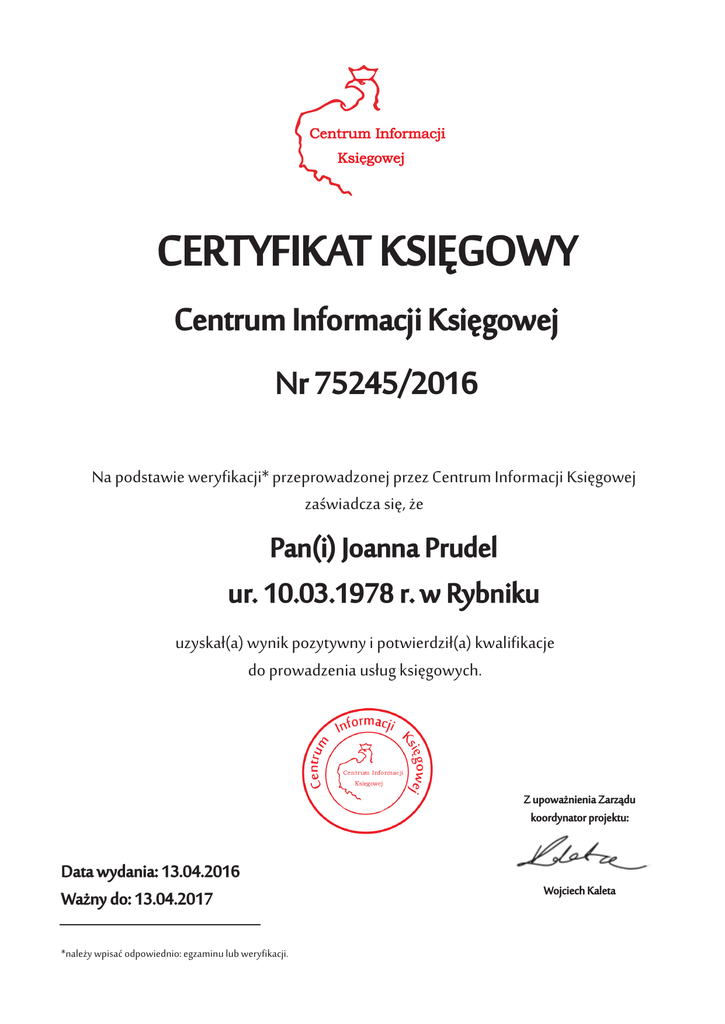 Centrum CentrumInformacji Informacji Ksiêgowej Księgowej CERTYFIKAT KSIĘGOWY Centrum Informacji Księgowej Nr 75245/2016 Na podstawie weryfikacji* przeprowadzonej przez Centrum Informacji Księgowej zaświadcza się, że Pan(i) Joanna Prudel ur. 10.03.1978 r. w Rybniku uzyskał(a) wynik pozytywny i potwierdził(a) kwalifikacje do prowadzenia usług księgowych. Z upoważnienia Zarządu koordynator projektu: Data wydania: 13.04.2016 Ważny do: 13.04.2017 *należy wpisać odpowiednio: egzaminu lub weryfikacji. Wojciech Kaleta