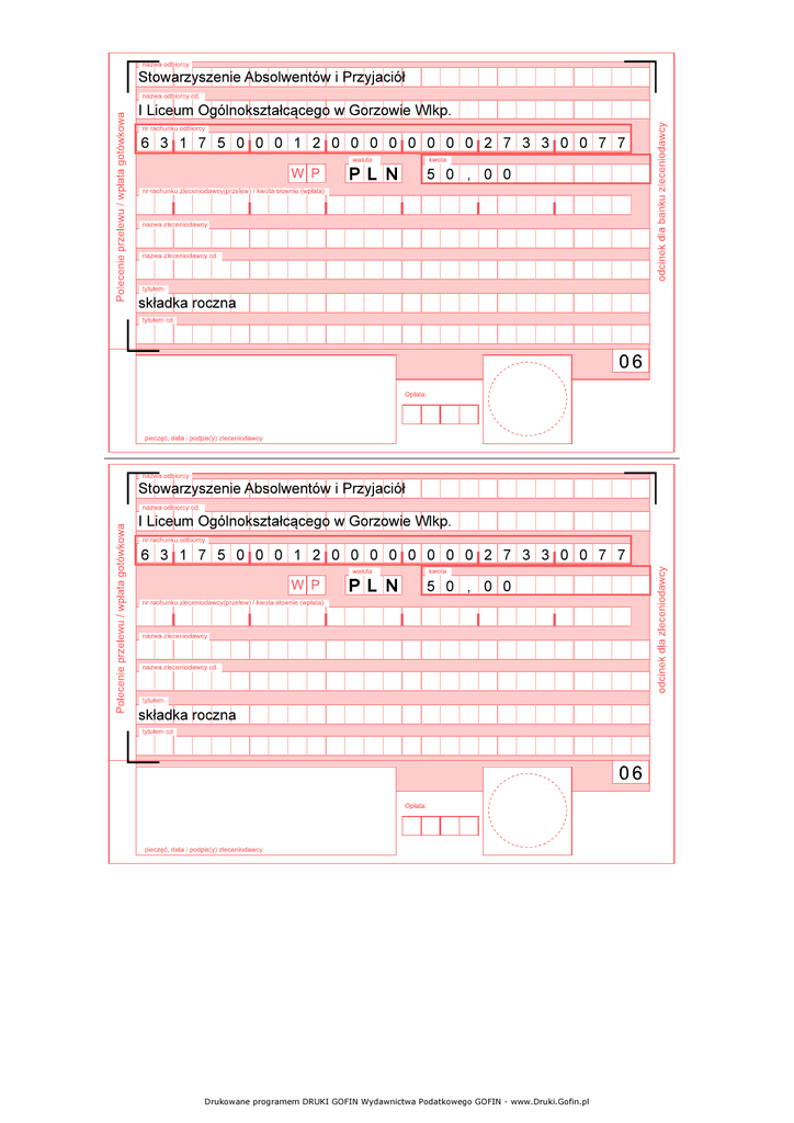 Stowarzyszenie Absolwentów i Przyjaciół I Liceum Ogólnokształcącego w Gorzowie Wlkp. 6 3 1 7 5 0 0 0 1 2 0 0 0 0 0 0 0 0 2 7 3 3 0 0 7 7 5 0 , 0 0 składka roczna Stowarzyszenie Absolwentów i Przyjaciół I Liceum Ogólnokształcącego w Gorzowie Wlkp. 6 3 1 7 5 0 0 0 1 2 0 0 0 0 0 0 0 0 2 7 3 3 0 0 7 7 5 0 , 0 0 składka roczna Drukowane programem DRUKI GOFIN Wydawnictwa Podatkowego GOFIN - www.Druki.Gofin.pl