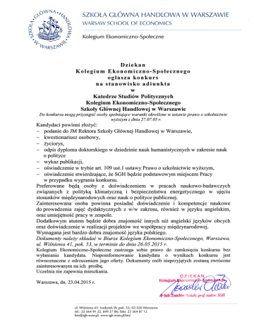 SZKOLA CLOWN A HANDLOWA W WARSZAWIE WARSAW SCHOOL OF ECONOMICS Kolegium Ekonomiczno-Spoleczne Dziekan Kolegium Ekonomiczno-Spolecznego oglasza konkurs na s t a n o w i s k o a d i u n k t a w Katedrze Studiow Politycznych Kolegium Ekonomiczno-Spolecznego Szkoly Glownej Handlowej w Warszawie Do konkursu mogq przystqpic osoby spelniajqce warunki okreslone w ustawie prawo o szkolnictwie wyzszym z dnia 27.07.05 r. Kandydaci powinni zlozyc: - podanie do JM Rektora Szkoly Glownej Handlowej w Warszawie, kwestionariusz osobowy, zyciorys, odpis dyplomu doktorskiego w dziedzinie nauk humanistycznych w zakresie nauk o polityce - wykaz publikacji, - oswiadczenie w trybie art. 109 ust. 1 ustawy Prawo o szkolnictwie wyzszym, - oswiadczenie stwierdzajajse, ze SGH be^dzie podstawowym miejscem Pracy w przypadku wygrania konkursu. Preferowane be_dq. osoby z doswiadczeniem w pracach naukowo-badawczych zwiazanych z polityka^ klimatyczna. i bezpieczenstwa energetycznego w uJQciu stosunkow miedzynarodowych oraz nauk o polityce publicznej. Zainteresowana osoba powinna posiadac doswiadczenie i kompetencje naukowe do prowadzenia zaj^c dydaktycznych z w/w zakresu, rowniez w JQzyku angielskim, oraz umiejejnosc pracy w zespole. Dodatkowym atutem b^dzie dobra znajomosc innych niz angielski jqzykow obcych oraz doswiadczenie w realizacji projektow we wspolpracy mi^dzynarodowej. Wymagana jest bardzo dobra znajomosc jejzyka polskiego. Dokumenty nalezy skladac w Biurze Kolegium Ekonomiczno-Spolecznego, Warszawa, ul. Wisniowa 41, pok. 53, w terminie do dnia 26.05.2015 r. Kolegium Ekonomiczno-Spoleczne zastrzega sobie prawo do zamknie_cia konkursu bez wylaniania kandydata. Niepoinformowanie kandydata o wynikach konkursu jest rownoznaczne z odrzuceniem jego oferty. Dokumenty osob nieprzyje^tych zostanq. zwrocone zainteresowanym na ich prosbq. Uczelnia nie zapewnia mieszkania. DZIEKAN. Warszawa, dn. 23.04.2015 r. Kolegium«konomic? hab,%ach(m Osifakii pref, nadzw. SGH ul. Wisniowa 41; budynek W, pok. 53; 02-520 Warszawa tel.: 22 564 91 22, 849 27 86; faks: 22 564 87 12 [email protected]; www.sgh.waw.pl/kes/