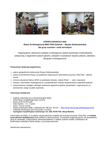 OFERTA EDUKACYJNA Stacji Ornitologicznej MiIZ PAN (Gdańsk – Wyspa Sobieszewska) dla grup uczniów i osób dorosłych Organizujemy całoroczne wykłady ornitologiczne oparte prezentacji multimedialnej połączonej z nagraniami ptasich głosów, pokazem muzealnych okazów ptaków, plakatów, obrączek ornitologicznych Prezentacje obejmują zagadnienia: • walory geograficzno-historyczne Wyspy Sobieszewskiej • walory przyrodnicze Wyspy na podstawie miejscowych rezerwatów przyrody „Ptasi Raj” i „Mewia Łacha • ochrona obszarów Natura 2000 na podstawie obszaru „Ujście Wisły” – cele i znaczenie • metody i cele badań ornitologicznych z podkreśleniem metody obrączkowania (wędrówki ptaków) • rozpoznawanie, biologia i ekologia wybranych gatunków ptaków (pospolitych i zagrożonych) ze zwróceniem uwagi na ptaki wybrzeża. Informacje dodatkowe: - wykłady odbywają się w sali edukacyjnej Stacji prezentacje uwzględniają wiek uczniów grupy od 20 do 40 osób czas trwania : 1,5 – 2 godz. koszt : 6 zł od ucznia dojazd autobusem MZK z Gdańska linii 186 (ok. 40 min. – http://www.stornit.gda.pl/lokidojazd.html) materiały edukacyjne dla nauczycieli i uczniów wymagana wcześniejsza rezerwacja: tel. (58) 30-80-759, Alicja Bielska Informujemy ponadto, iż w pobliżu naszej placówki znajduje się rezerwat przyrody „Ptasi Raj” ze ścieżką przyrodniczo-dydaktyczną (dwie platformy obserwacyjne). Z powodów organizacyjnych nie prowadzimy grup do rezerwatu, dysponujemy natomiast folderem z mapką i opisem ścieżki. Zachęcamy do konfrontacji zdobytej w Stacji wiedzy z przyrodą rezerwatu. Serdecznie zapraszamy!
