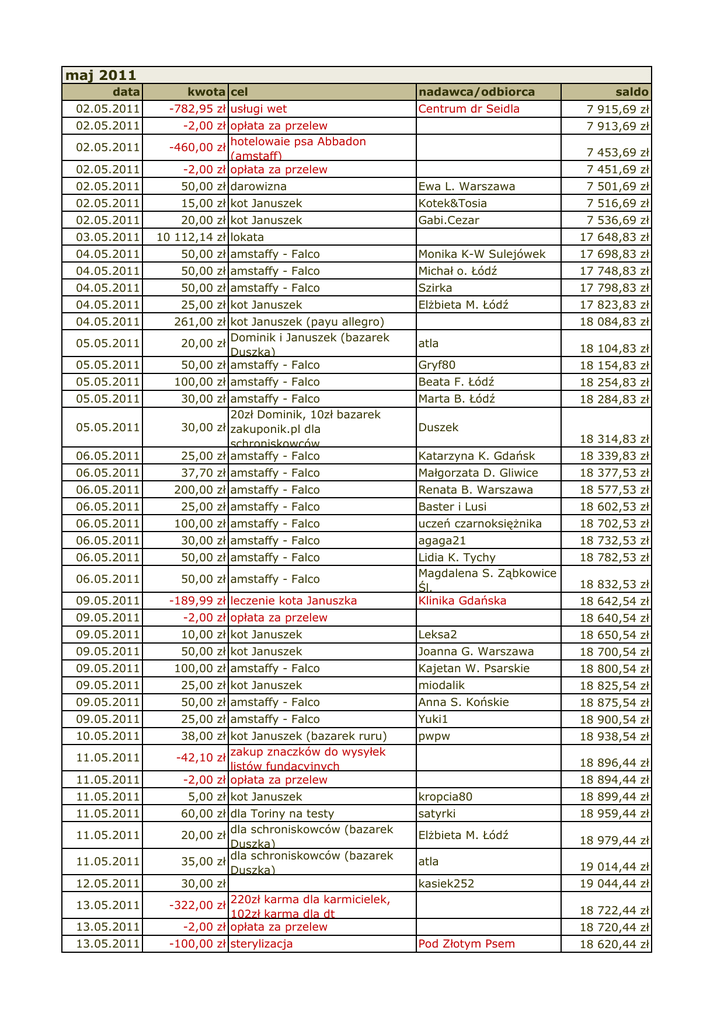maj 2011 data kwota cel 02.05.2011 -782,95 zł usługi wet 02.05.2011 -2,00 zł opłata za przelew hotelowaie psa Abbadon -460,00 zł (amstaff) -2,00 zł opłata za przelew 02.05.2011 02.05.2011 nadawca/odbiorca Centrum dr Seidla saldo 7 915,69 zł 7 913,69 zł 7 453,69 zł 7 451,69 zł 02.05.2011 50,00 zł darowizna Ewa L. Warszawa 7 501,69 zł 02.05.2011 15,00 zł kot Januszek Kotek&Tosia 7 516,69 zł 20,00 zł kot Januszek Gabi.Cezar 02.05.2011 03.05.2011 10 112,14 zł lokata 7 536,69 zł 17 648,83 zł 04.05.2011 50,00 zł amstaffy - Falco Monika K-W Sulejówek 17 698,83 zł 04.05.2011 50,00 zł amstaffy - Falco Michał o. Łódź 17 748,83 zł 04.05.2011 50,00 zł amstaffy - Falco Szirka 17 798,83 zł 04.05.2011 25,00 zł kot Januszek Elżbieta M. Łódź 17 823,83 zł 04.05.2011 atla 18 104,83 zł 05.05.2011 261,00 zł kot Januszek (payu allegro) Dominik i Januszek (bazarek 20,00 zł Duszka) 50,00 zł amstaffy - Falco Gryf80 18 154,83 zł 05.05.2011 100,00 zł amstaffy - Falco 05.05.2011 18 084,83 zł Beata F. Łódź 18 254,83 zł 30,00 zł amstaffy - Falco 20zł Dominik, 10zł bazarek 30,00 zł zakuponik.pl dla schroniskowców 25,00 zł amstaffy - Falco Marta B. Łódź 18 284,83 zł Katarzyna K. Gdańsk 18 339,83 zł 06.05.2011 37,70 zł amstaffy - Falco Małgorzata D. Gliwice 18 377,53 zł 06.05.2011 200,00 zł amstaffy - Falco Renata B. Warszawa 18 577,53 zł Baster i Lusi 18 602,53 zł uczeń czarnoksiężnika 18 702,53 zł 05.05.2011 05.05.2011 06.05.2011 Duszek 18 314,83 zł 06.05.2011 25,00 zł amstaffy - Falco 06.05.2011 100,00 zł amstaffy - Falco 06.05.2011 30,00 zł amstaffy - Falco agaga21 18 732,53 zł 06.05.2011 50,00 zł amstaffy - Falco 18 782,53 zł 06.05.2011 50,00 zł amstaffy - Falco Lidia K. Tychy Magdalena S. Ząbkowice Śl. Klinika Gdańska 09.05.2011 -189,99 zł leczenie kota Januszka 18 832,53 zł 18 642,54 zł 09.05.2011 -2,00 zł opłata za przelew 09.05.2011 10,00 zł kot Januszek Leksa2 18 650,54 zł 09.05.2011 50,00 zł kot Januszek Joanna G. Warszawa 18 700,54 zł 09.05.2011 Kajetan W. Psarskie 18 800,54 zł 09.05.2011 25,00 zł kot Januszek miodalik 18 825,54 zł 09.05.2011 50,00 zł amstaffy - Falco Anna S. Końskie 18 875,54 zł 09.05.2011 25,00 zł amstaffy - Falco Yuki1 18 900,54 zł pwpw 18 938,54 zł 10.05.2011 11.05.2011 11.05.2011 11.05.2011 100,00 zł amstaffy - Falco 18 640,54 zł 38,00 zł kot Januszek (bazarek ruru) zakup znaczków do wysyłek -42,10 zł listów fundacyjnych -2,00 zł opłata za przelew 18 894,44 zł kropcia80 18 899,44 zł satyrki 18 959,44 zł Elżbieta M. Łódź 18 979,44 zł atla 19 014,44 zł kasiek252 19 044,44 zł 13.05.2011 60,00 zł dla Toriny na testy dla schroniskowców (bazarek 20,00 zł Duszka) dla schroniskowców (bazarek 35,00 zł Duszka) 30,00 zł 220zł karma dla karmicielek, -322,00 zł 102zł karma dla dt -2,00 zł opłata za przelew 13.05.2011 -100,00 zł sterylizacja Pod Złotym Psem 11.05.2011 11.05.2011 11.05.2011 12.05.2011 13.05.2011 5,00 zł kot Januszek 18 896,44 zł 18 722,44 zł 18 720,44 zł 18 620,44 zł 13.05.2011 -2,00 zł opłata za przelew 13.05.2011 30,00 zł amstaffy - Falco dla schroniskowców (bazarek 50,00 zł Duszka) 50,00 zł Torina (bazarek Duszka) 13.05.2011 13.05.2011 16.05.2011 16.05.2011 16.05.2011 16.05.2011 25,00 zł darowizna dla Fundacji adopcja wirtualna Czarni Bracia 60,00 zł z Sokolnik -431,33 zł sterylizacje -2,00 zł opłata za przelew 17.05.2011 50,00 zł buldożki 18.05.2011 18.05.2011 18.05.2011 18.05.2011 18.05.2011 19.05.2011 19.05.2011 18 648,44 zł Duszek 18 698,44 zł wiedźma 18 748,44 zł -25,00 zł opłata za prowadzenie rachunku 16.05.2011 18.05.2011 18 618,44 zł gonia13 -71,00 zł kot Januszek - diagnostyka 18 723,44 zł Elżbieta S. Łódź 18 748,44 zł Kalina i Krzysiek 18 808,44 zł futrzak 18 377,11 zł 18 375,11 zł Wioletta Ł. Gubin 18 425,11 zł Cztery Łapy 18 354,11 zł -2,00 zł opłata za przelew -690,22 zł tomografia amstaff Falco 18 352,11 zł SGGW -2,00 zł opłata za przelew 5,00 zł kot Januszek bazarek zakuponik.pl 43,00 zł (schroniskowce) -79,65 zł żwir dt Gośka 17 659,89 zł ducam 17 664,89 zł dagmara-olga 17 707,89 zł 17 628,24 zł -2,00 zł opłata za przelew 19.05.2011 -10 000,00 zł założenie lokaty bazarek zakuponik.pl 20.05.2011 12,00 zł (schroniskowce) 17 661,89 zł 17 626,24 zł 7 626,24 zł dagmara-olga 7 638,24 zł 20.05.2011 30,00 zł darowizna Teo adopcja wirtualna casica 7 668,24 zł 20.05.2011 22,00 zł kotka Torina - bazarek Anety myszki 7 690,24 zł 23.05.2011 -312,00 zł karma dla kotów w schronisku 23.05.2011 -2,00 zł opłata za przelew 23.05.2011 11,50 zł kotka Torina - bazarek Sis 24.05.2011 24.05.2011 24.05.2011 24.05.2011 26.05.2011 27.05.2011 maxyma 7 378,24 zł 7 376,24 zł eski 25,50 zł kotka Torina - bazarek Sis małgocha pe 12zł - Torina (bazarek Anety), 32,00 zł 10zł - Torina (bazarek Sis), 10zł - Duszek schroniskowce (bazarek zakuponik.pl) ostrza do strzyzenia psów i -242,16 zł kotów w schronisku -2,00 zł opłata za przelew 14,50 zł kotka Torina - bazarek Sis kotka Torina - bazarek 38,00 zł kiche_wilczyca naline satyr77 suma na koniec msc. 7 387,74 zł 7 413,24 zł 7 445,24 zł 7 203,08 zł 7 201,08 zł 7 215,58 zł 7 253,58 zł 7 253,58 zł