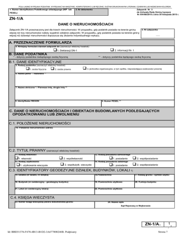 POLA JASNE WYPEŁNIA PODATNIK. WYPEŁNIAĆ NA MASZYNIE, KOMPUTEROWO LUB RĘCZNIE, DUŻYMI DRUKOWANYMI LITERAMI, CZARNYM LUB NIEBIESKIM KOLOREM. 1. Numer Identyfikatora Podatkowego składającego (NIP lub Załącznik Nr 3 do Uchwały Rady Gminy Łęczyce Nr XIV/88/2015 z dnia 30 listopada 2015 r. 2. Nr dokumentu PESEL) ........................................................................................................................................... ZN-1/A DANE O NIERUCHOMOŚCIACH 3. Nr załącznika Załącznik ZN-1/A przeznaczony jest dla trzech nieruchomości. W przypadku, gdy podatnik posiada na terenie gminy więcej niż trzy nieruchomości należy wypełnić odrębne załączniki. W przypadku, gdy podatnik posiada na terenie gminy ......... więcej niż dziewięć nieruchomości dopuszcza się złożenie indywidualnego wykazu. A. PRZEZNACZENIE FORMULARZA 4. Niniejszy formularz stanowi załącznik do (zaznaczyć właściwy kwadrat): 2. informacji IN- 1 1. Deklaracji DN-1 B. DANE PODATNIKA ** - dotyczy podatnika będącego osobą fizyczną * - dotyczy podatnika niebędącego osobą fizyczną B.1. DANE IDENTYFIKACYJNE 5. Rodzaj podatnika (zaznaczyć właściwy kwadrat): 1. osoba fizyczna 2. osoba prawna 3. jednostka organizacyjna, w tym spółka, nieposiadająca osobowości prawnej 6. Nazwa pełna * / Nazwisko ** 7. Nazwa skrócona * / Pierwsze imię, drugie imię ** 8. Identyfikator REGON 9. Numer PESEL ** C. DANE O NIERUCHOMOŚCIACH I OBIEKTACH BUDOWLANYCH PODLEGAJĄCYCH OPODATKOWANIU LUB ZWOLNIENIU C.1. POŁOŻENIE NIERUCHOMOŚCI 10. Położenie nieruchomości (adres) C.2. TYTUŁ PRAWNY (zaznaczyć właściwy kwadrat): 11. Rodzaj własności 1. własność 13. Rodzaj użytkowania 1. użytkowanie wieczyste 12. Rodzaj posiadania samoistnego 2. współwłasność 2. współużytk. wieczyste 1. posiadanie 14. Rodzaj posiadania zależnego 1. posiadanie 2. współposiadanie 2. współposiadanie C.3. IDENTYFIKATORY GEODEZYJNE DZIAŁEK, BUDYNKÓW, LOKALI 1) 15. Działka (nr działki, nr obrębu) 16.Powierzchnia 17. Rodzaj gruntu - symbol użytku 18. Budynek (nr ewidencyjny - geodezyjny budynku) 19. Powierzchnia użytkowa 20. Funkcja budynku 21. Lokal (nr ewidencyjny lokalu) 22. Powierzchnia użytkowa C.4. KSIĘGA WIECZYSTA 23. Numer księgi wieczystej (zbioru dokumentów) gruntu 24. Nazwa sądu Sąd Rejonowy w Wejherowie ZN-1/A (1) 1 2 / Id: BBD31376-F478-4B13-B1D2-3A677800246B. Podpisany Strona 7 POLA JASNE WYPEŁNIA PODATNIK. WYPEŁNIAĆ NA MASZYNIE, KOMPUTEROWO LUB RĘCZNIE, DUŻYMI DRUKOWANYMI LITERAMI, CZARNYM LUB NIEBIESKIM KOLOREM. D. DANE O NIERUCHOMOŚCIACH I OBIEKTACH BUDOWLANYCH PODLEGAJĄCYCH OPODATKOWANIU LUB ZWOLNIENIU D.1. POŁOŻENIE NIERUCHOMOŚCI 25. Położenie nieruchomości (adres) D.2. TYTUŁ PRAWNY (zaznaczyć właściwy kwadrat): 26. Rodzaj własności 1. własność 28. Rodzaj użytkowania 1. użytkowanie wieczyste 27. Rodzaj posiadania samoistnego 2. współwłasność 2. współużytk. wieczyste 1. posiadanie 29. Rodzaj posiadania zależnego 1. posiadanie 2. współposiadanie 2. współposiadanie D.3. IDENTYFIKATORY GEODEZYJNE DZIAŁEK, BUDYNKÓW, LOKALI 1) 30. Działka (nr działki, nr obrębu) 31.Powierzchnia 32. Rodzaj gruntu - symbol użytku 33. Budynek (nr ewidencyjny - geodezyjny budynku) 34. Powierzchnia użytkowa 35. Funkcja budynku 36. Lokal (nr ewidencyjny lokalu) 37. Powierzchnia użytkowa D.4. KSIĘGA WIECZYSTA 38. Numer księgi wieczystej (zbioru dokumentów) gruntu 39. Nazwa sądu Sąd Rejonowy w Wejherowie E. DANE O NIERUCHOMOŚCIACH I OBIEKTACH BUDOWLANYCH PODLEGAJĄCYCH OPODATKOWANIU LUB ZWOLNIENIU E.1. POŁOŻENIE NIERUCHOMOŚCI 40. Położenie nieruchomości (adres) E.2. TYTUŁ PRAWNY (zaznaczyć właściwy kwadrat): 41. Rodzaj własności 1. własność 43. Rodzaj użytkowania 1. użytkowanie wieczyste 42. Rodzaj posiadania samoistnego 2. współwłasność 2. współużytk. wieczyste 1. posiadanie 44. Rodzaj posiadania zależnego 1. posiadanie 2. współposiadanie 2. współposiadanie E.3. IDENTYFIKATORY GEODEZYJNE DZIAŁEK, BUDYNKÓW, LOKALI 1) 45. Działka (nr działki, nr obrębu) 46.Powierzchnia 47. Rodzaj gruntu - symbol użytku 48. Budynek (nr ewidencyjny - geodezyjny budynku) 49. Powierzchnia użytkowa 50. Funkcja budynku 51. Lokal (nr ewidencyjny lokalu) 52. Powierzchnia użytkowa E.4. KSIĘGA WIECZYSTA 53. Numer księgi wieczystej (zbioru dokumentów) gruntu 54. Nazwa sądu Sąd Rejonowy w Wejherowie 1) Identyfikatory wykazuje się, jeżeli zostały nadane. ZN-1/A (1) 2/2 Id: BBD31376-F478-4B13-B1D2-3A677800246B. Podpisany Strona 8