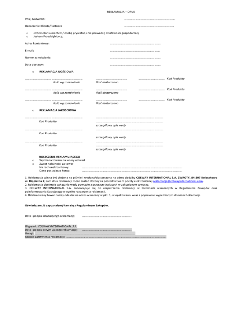 REKLAMACJA – DRUK Imię, Nazwisko: ………………………………………………………….. Oznaczenie Klienta/Partnera …………………………………………………………. o o Jestem Konsumentem/ osobą prywatną i nie prowadzę działalności gospodarczej Jestem Przedsiębiorcą; Adres kontaktowy: ………………………………………………………….. E-mail: …………………………………………………………. Numer zamówienia: ………………………………………………………….. Data dostawy: ………………………………………………………….. o REKLAMACJA ILOŚCIOWA …………………………………………………………………… Ilość wg zamówienia …………………………………… Ilość dostarczona ……………………………… Kod Produktu …………………………………………………………………… Ilość wg zamówienia …………………………………… Ilość dostarczona ……………………………… Kod Produktu …………………………………………………………………… Ilość wg zamówienia …………………………………… Ilość dostarczona ……………………………… Kod Produktu o REKLAMACJA JAKOŚCIOWA …………………………………………………………………… Kod Produktu …………………………………………………………………… Kod Produktu …………………………………………………………………… Kod Produktu o o ……………………………………………….……………………………… ……………………………………………….……………………………… szczegółowy opis wady ……………………………………………….……………………………… ……………………………………………….……………………………… szczegółowy opis wady ……………………………………………….……………………………… ……………………………………………….……………………………… szczegółowy opis wady ROSZCZENIE REKLAMUJĄCEGO Wymiana towaru na wolny od wad Zwrot należności za towar Na rachunek bankowy: ………………………………………………………………………………………………………………………. Dane posiadacza konta: ………………………………………………………………………………………………………………………. 1. Reklamacja winna byd złożona na piśmie i wysłana/dostarczona na adres siedziby COLWAY INTERNATIONAL S.A. ZWROTY, 84-207 Koleczkowo ul. Hippiczna 2; sam druk reklamacji może zostad złożony za pośrednictwem poczty elektronicznej [email protected]. 2. Reklamacja obejmuje wyłącznie wady powstałe z przyczyn tkwiących w zakupionym towarze. 3. COLWAY INTERNATIONAL S.A. zobowiązuje się do rozpatrzenia reklamacji w terminach wskazanych w Regulaminie Zakupów oraz poinformowania Kupującego o wyniku rozparzenia reklamacji. 4. Reklamowany towar należy odesład na adres wskazany w pkt. 1, w opakowaniu wraz z poprawnie wypełnionym drukiem Reklamacji. Oświadczam, iż zapoznałem/-łam się z Regulaminem Zakupów. Data i podpis składającego reklamację: ………………………………………………………….. Wypełnia COLWAY INTERNATIONAL S.A. Data i podpis przyjmującego reklamację: ………………………………………………………….. Uwagi: …………………………………………………………..………………………………………………………….. Sposób załatwienia reklamacji: …………………………………………………………..…………………………………………………………..