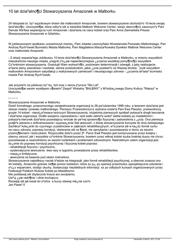 10 lat dzia³alno¶ci Stowarzyszenia Amazonek w Malborku 24 listopada br. by³ wyj±tkowym dniem dla malborskich Amazonek, bowiem stowarzyszenie obchodzi³o 10-lecie swojej dzia³alno¶ci. Uroczysto¶æ, która odby³a siê w siedzibie Malbork Welcome Center, swoj± obecno¶ci± zaszczyci³y Pani Danuta Wa³êsa wspieraj±ca ruch Amazonek i dzia³ania na rzecz kobiet oraz Pani Anna Ziemiañska Prezes Stowarzyszenia Amazonek w Gdañsku. W jubileuszowym spotkaniu uczestniczyli równie¿ Pani Jolanta Leszczyñska Wicestarosta Pwowiatu Malborksiego, Pan Andrzej Rych³owski Burmistrz Miasta Malborka, Pani Magdalena Marsza³kowska Dyrektor Malbrok Welcome Center oraz malborskie Amazonki. - Z okazji wspania³ego Jubileuszu 10-lecia dzia³alno¶ci Stowarzyszenia Amazonek w Malborku, w imieniu wszystkich mieszkañców naszego miasta, pragnê z³o¿yæ najserdeczniejsze ¿yczenia wszelkiej pomy¶lno¶ci wszystkim Cz³onkiniom stowarzyszenia. Gratulujê Wam wytrwa³o¶ci, podziwiam determinacjê i odwagê, z jak± realizujecie w³asne plany zawodowe i osobiste, wbrew przeszkodom, jakie ¿ycie postawi³o na Waszej drodze. ¯yczê wszystkim malborskim Amazonkom satysfakcji z realizowanych zamierzeñ i nieustaj±cego zdrowia - ¿yczenia sk³ada³ burmistrz miasta Pan Andrzej Rych³owski. Jak przysta³o na jubileusz by³ te¿ tort oraz z serca p³yn±ce "Sto Lat". Uroczysto¶æ swoim wystêpem u¶wietni³ Zespó³ Wokalny "BALBINY" z M³odzie¿owego Domu Kultury "Ratusz" w Malborku. ***** Stowarzyszenie Amazonek w Malborku Dzieñ formalnego, prawomocnego zarejestrowania organizacji to 26 pa¼dziernika 1999 roku, a terenem dzia³ania jest obszar miasta i powiatu malborskiego. Pierwsz± Przewodnicz±c± wybrana zosta³a Pani Ewa Pieszko, przewodniczy grupie 14 kobiet - nieod¿a³owana twórczyni Stowarzyszenia, inicjatorka pierwszych spotkañ pokaza³a drogê tworzenia i dzia³ania organziacji. Dziêki swojemu usposobieniu i woli walki zebra³a wokó³ siebie kobiety po mastektomii i pokaza³a kierunek dzia³ania pozwalaj±cy wróciæ do pe³nej sprawno¶ci fizycznej i zadowolenia z ¿ycia. Ona pierwsza podjê³a starania o dofinansowanie i wyposa¿enie Sali æwiczeñ, z której stowarzyszenie korzysta do dnia dzisiejszego. Zachêca³ kole¿anki do czynnego uczestnictwa w zajêciach rehabilitacyjnych, w³±czania siê w ka¿d± formê ruchu na rzecz zdrowia, poprawy kondycji, otwierania siê na ¶wiat, nie zamykania i pozostawania w domu ze swoimi przemy¶leniami i bol±czkami. Rozpoczête dzie³o przez ¦P. Pani± Ewê Pieszko jest kontynuowane przez kolejny i obecny zarz±d, jak i wszystkie cz³onkinie Stowarzyszenia, bowiem coraz wiêcej kobiet szuka bratniej duszy nie chc±c pozostawaæ w osamotnieniu ze swoimi rozterkami i problemami zdrowotnymi. Nadrzêdnym celem organizacji jest d±¿enie do poprawy kondycji psychicznej i fizycznej kobiet poprzez: - rehabilitacjê fizyczn± i psychiczn±, - systematyczne æwiczenia dwa razy w tygodniu prowadzone przez rehabilitantów, - masa¿e limfatyczne, - æwiczenia na basenie pod okiem instruktora. Stowarzyszenie najwiêkszy nacisk k³adzie na integracjê, jako formê rehabilitacji psychicznej, a obecnie zrzesza ono 44 kobiety. Amazonki gotowe nie¶æ pomoc kobietom, które s± ju¿ po operacji przechodz± specjalistyczne szkolenie i s³u¿± wsparciem, dodaj± otuchy, dostarczaj± niezbêdnych informacji s± po odbytych kursach organizowanych przez Federacjê Polskich Klubów Kobiet po Mastektomii. Nie poddawaj siê zbytecznie trosce ani zw±tpieniu. Usi³uj ¿yæ rado¶nie i ufnie kochaj±co. Rozwijaj siê jak kwiat do s³oñca a burzy stawiaj mê¿nie czo³o Jan Pawe³ II http://www.malbork.pl/um/ - Malbork, Urz±d Miasta Page created by www.kraszewski.pl Generated: 8 March, 2017, 07:26