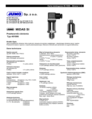 Karta katalogowa 40.1006 Strona 1 / 4 Sp. z o.o. 53-021 Wrocław ul. Korfantego 28 tel. 071/339 82 39, fax 071/339 73 79 tel. 071/339 87 56, NIP 899-22-97-851 MIDAS SI Przetwornik ciśnienia Typ 401006 Krótki Opis Jest to przetwornik ciśnienia, który może być używany do pomiaru względnego i absolutnego ciśnienia cieczy i gazów. Przetwornik działa w oparciu o czujnik piezorezystancyjny. Mierzone ciśnienie jest zamieniane na sygnał elektryczny. Dane techniczne Spełnia warunki wg DIN 16086 i IEC 770/5.3 Zakresy pomiarowe patrz Szczegóły zamawiania Dopuszczalne przeciążenia dla zakresów do 0-25bar 3 x pełny zakres Ciśnienie niszczące dla zakresów do 0-25bar ≤ 4 x pełny zakres Błąd od temperatury otoczenia o w zakresie –20 d +85 C (skompensowany zakres temperatury) o zero : ≤ 0,02%/ C typowy o ≤ 0,04%/ C max. o zakres : ≤ 0,02%/ C typowy o ≤ 0,04%/ C max. Odchylenie od charakterystyki ≤ 0,5% pełnego zakresu (nast. graniczne) Temp. przechowywania o -20 do +125 C wersja z dołączonym kablem o -20 do +100 C Histereza ≤ 0,1% pełnego zakresu Dopuszczalna temp. medium o -30 do +125 C Części mające kontakt z medium standard : st.st.1.4571 i 1.4435 Powtarzalność ≤ 0,05% pełnego zakresu Sygnał wyjściowy 4-20mA 2-przewodowy obciążenie ≤ (UB-10V) / 0,02A 0,5-4,5V obciążenie ≥ 20kΩ 1-5(6)V obciążenie ≥ 10kΩ 0-10V obciążenie ≥ 10kΩ Czas reakcji ≤ 3 msec max Błąd obciążenia < 0,5% max. Odchylenie sygnału Zera ≤ 0,3% pełnego zakresu Histereza termiczna ≤ ± 0,5% pełnego zakresu (w skompensowanym zakresie temperatury) ≤ ± 1% dla zakresów 0-250mbar 0-400mbar 0-600mbar Dopuszczalna temp. otoczenia dla wersji z wtyczką : o -20 do +125 C dla wersji z kablem : -20 do +100oC Zgodność elektromagnetyczna (EMC) zgodnie z EN 61326 Stabilność / rok ≤ 1% pełnego zakresu Zasilanie 10-30VDC (wyjście 4-20mA i 1-(5)6V) 5VDC (wyjście 0,5-4,5V) 11,5-30VDC (wyjście 0-10V) Pulsacja : skoki napięcia nie mogą przekraczać podanych wartości zasilania Max. prąd : około 25mA Błąd zasilania ≤ 0,02% na V (nominalne napięcie zasilania 24VDC) proporcjonalny przy napięciu zasilania 5VDC (± 0,5%) Wstrząs mechaniczny (wg IEC 68-2-27) 100g/1msec Wibracje mechaniczne (wg IEC 68-2-6) 20g max. przy 15-2000Hz Stopień ochrony obudowy z wtyczką IP65 wg EN 60529 (średnica kabla 5mm min., 7mm max.) z dołączonym kablem lub z przyłączem okrągłym M12 x 1 IP67 wg EN 60529 Obudowa st.st. 1.4301 PBT Karta katalogowa 40.1006 Przyłącze procesowe zobacz Szczegóły zamawiania inne przyłącza na zamówienie Przyłącze elektryczne zobacz Szczegóły zamawiania wtyczka wg DIN 43650, wersja A 2 kabel o przekroju do 1,5mm , lub z dołączonym 4-żyłowym kablem, o długości 0,5m (inne długości na zamówienie) lub 4-biegunowe okrągłe przyłącze M12x1 Pozycja pracy dowolna Waga 120g Połączenia elektryczne Położenie pin’ów Połączenie Zasilanie 10-30VDC 11,5-30VDC 5VDC Wyjście 1-(5)6V 0-10V (dla wyjścia) ( 1-5(6)V ) ( 0-10V ) ( 0,5 – 4,5V ) Zasilanie 10-30VDC ( dla wyjścia) ( 4-20mA, 2-przewodowy ) Wyjście 4-20mA, 2-przewodowe Strona 2 / 4 Wtyczka Przyłącza Kabel M12 x 1 1 L+ 2 L- biały brązowy 1+ 2- 2– 3+ brązowy żółty 2– 3+ 1 L+ 2 L- biały brązowy 1+ 3- 1+ 2- biały brązowy 1+ 3– prąd proporcjonalny 4 do 20mA Karta katalogowa 40.1006 Wymiary Przyłącza elektryczne Przyłącza procesowe Strona 3 / 4 Karta katalogowa 40.1006 Szczegóły zamawiania Wersja podstawowa 401006 Przetwornik ciśnienia JUMO MIDAS SI I Rozszerzenie wersji podstawowej I /000 nic I /999 wersja specjalna I I Zakres I I 451 0 - 0,25 bar I I 452 0 - 0,4 bar I I 453 0 - 0,6 bar I I 454 0 - 1,0 bar I I 455 0 - 1,6 bar I I 478 -1 - 0 bar I I 479 -1 - 0,6 bar I I 487 0 - 0,6 bar (ciśnienie absolutne) I I 488 0 - 1,0 bar (ciśnienie absolutne) I I 489 0 - 1,6 bar (ciśnienie absolutne) I I 490 0 - 2,5 bar (ciśnienie absolutne) I I 491 0 - 4 bar (ciśnienie absolutne) I I 492 0 - 6 bar (ciśnienie absolutne) I I 493 0 - 10 bar (ciśnienie absolutne) I I 494 0 - 16 bar (ciśnienie absolutne) I I 495 0 - 25 bar (ciśnienie absolutne) I I 998 zakres specjalny (ciśnienie absolutne) I I 999 zakres specjalny I I I Sygnał wyjściowy I I I 405 4-20mA 2-przewodowy I I I 412 0,5-4,5V 3-przewodowy I I I 415 0-10V 3-przewodowy I I I 418 1-5V 3-przewodowy I I I 420 1-6V 3-przewodowy I I I I Przyłącze procesowe (bez membrany czołowej) I I I I 502 G ¼ wg EN 837 I I I I 504 G ½ wg EN 837 I I I I 511 1/4-18NPT wg EN 837 I I I I 521 G ¼ wg DIN 3852 T11 I I I I 523 G ½ wg DIN 3852 T11 I I I I I Materiał przyłącza procesowego I I I I I 20 stal nierdzewna I I I I I I Przyłącze elektryczne I I I I I I 11 z przyłączonym kablem 0,5m I I I I I I 36 okrągłe przyłącze M12x1 I I I I I I 61 wtyczka I I I I I I I Dodatkowe kody I I I I I I I 000 nic I I I I I I I 591 dławik ciśnienia I I I I I I I I 401006 / - - - - - / Kod zamówienia Akcesoria Określenie 4-biegunowe proste gniazdo M12x1 z 2m kablem (PVC) 4-biegunowe kątowe gniazdo M12x1 z 2m kablem (PVC) Nr artykułu 40/00404585 40/00409334 Strona 4 / 4