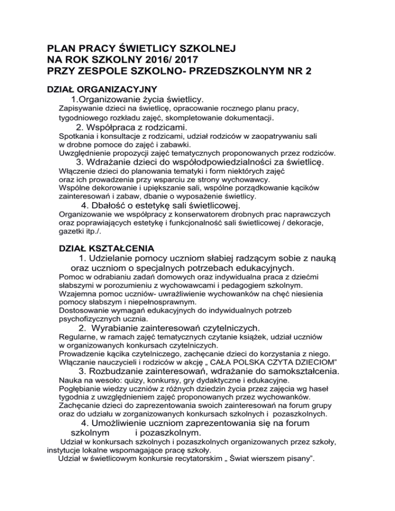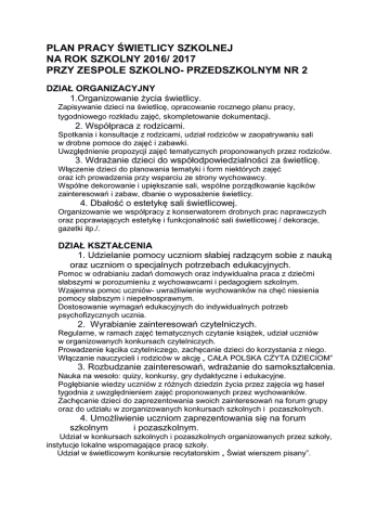 PLAN PRACY ŚWIETLICY SZKOLNEJ NA ROK SZKOLNY 2016/ 2017 PRZY ZESPOLE SZKOLNO- PRZEDSZKOLNYM NR 2 DZIAŁ ORGANIZACYJNY 1.Organizowanie życia świetlicy. Zapisywanie dzieci na świetlicę, opracowanie rocznego planu pracy, tygodniowego rozkładu zajęć, skompletowanie dokumentacji. 2. Współpraca z rodzicami. Spotkania i konsultacje z rodzicami, udział rodziców w zaopatrywaniu sali w drobne pomoce do zajęć i zabawki. Uwzględnienie propozycji zajęć tematycznych proponowanych przez rodziców. 3. Wdrażanie dzieci do współodpowiedzialności za świetlicę. Włączenie dzieci do planowania tematyki i form niektórych zajęć oraz ich prowadzenia przy wsparciu ze strony wychowawcy. Wspólne dekorowanie i upiększanie sali, wspólne porządkowanie kącików zainteresowań i zabaw, dbanie o wyposażenie świetlicy. 4. Dbałość o estetykę sali świetlicowej. Organizowanie we współpracy z konserwatorem drobnych prac naprawczych oraz poprawiających estetykę i funkcjonalność sali świetlicowej / dekoracje, gazetki itp./. DZIAŁ KSZTAŁCENIA 1. Udzielanie pomocy uczniom słabiej radzącym sobie z nauką oraz uczniom o specjalnych potrzebach edukacyjnych. Pomoc w odrabianiu zadań domowych oraz indywidualna praca z dziećmi słabszymi w porozumieniu z wychowawcami i pedagogiem szkolnym. Wzajemna pomoc uczniów- uwrażliwienie wychowanków na chęć niesienia pomocy słabszym i niepełnosprawnym. Dostosowanie wymagań edukacyjnych do indywidualnych potrzeb psychofizycznych ucznia. 2. Wyrabianie zainteresowań czytelniczych. Regularne, w ramach zajęć tematycznych czytanie książek, udział uczniów w organizowanych konkursach czytelniczych. Prowadzenie kącika czytelniczego, zachęcanie dzieci do korzystania z niego. Włączanie nauczycieli i rodziców w akcję „ CAŁA POLSKA CZYTA DZIECIOM” 3. Rozbudzanie zainteresowań, wdrażanie do samokształcenia. Nauka na wesoło: quizy, konkursy, gry dydaktyczne i edukacyjne. Pogłębianie wiedzy uczniów z różnych dziedzin życia przez zajęcia wg haseł tygodnia z uwzględnieniem zajęć proponowanych przez wychowanków. Zachęcanie dzieci do zaprezentowania swoich zainteresowań na forum grupy oraz do udziału w zorganizowanych konkursach szkolnych i pozaszkolnych. 4. Umożliwienie uczniom zaprezentowania się na forum szkolnym i pozaszkolnym. Udział w konkursach szkolnych i pozaszkolnych organizowanych przez szkoły, instytucje lokalne wspomagające pracę szkoły. Udział w świetlicowym konkursie recytatorskim „ Świat wierszem pisany”. Udział w świetlicowym konkursie 'Mistrz świetlicy”, ” Klasa na 6- óstkę” i inne. 5. Wdrażanie do krytycznego i racjonalnego odbioru informacji przekazywanych przez media. Oglądanie filmów oraz wspólne omawianie zawartych treści. Pogadanki, rozmowy indywidualne na temat zagrożeń medialnych i cywilizacyjnych. 6. Edukacja w prawach człowieka- jako profilaktyka agresji. Komu przysługują prawa ucznia, nauczyciela, rodzica, kolegi. Poszanowanie godności drugiej osoby z uwzględnieniem tematu osób niepełnosprawnych. Wybrane dokumenty zawierające podstawowe prawa człowieka i ich adaptacja na potrzeby edukacji dzieci w różnym wieku. DZIAŁ WYCHOWANIA I OPIEKI 1. Roztoczenie szczególnej opieki nad dziećmi z klas pierwszych. Zorganizowanie „ kącika malucha” w sali świetlicowej. Poszerzenie wachlarza zajęć i zabaw dla dzieci 6- letnich. Zorganizowanie pomocy koleżeńskiej, zachęcanie starszych uczniów do pomocy młodszym kolegom. 2. Kształtowanie kultury osobistej w każdej sytuacji. Ułożenie wspólnie z dziećmi katalogu kulturalnych zachowań: Kodeks Damy i Dżentelmena oraz częste odwoływanie się do niego w codziennych sytuacjach. Kształtowanie u uczniów zachowań ogólnie przyjętych norm społecznych. Wdrażanie do stosowania zasad „ dobrych manier” w życiu codziennym. 3. Kształtowanie prawidłowych zasad współistnienia i współdziałania w grupie. Przypominanie Regulaminu Świetlicy i częste odwoływanie się do niego w przypadku łamania przez dzieci zasad zgodnego współistnienia. Częste organizowanie zajęć z podziałem na zespoły/ wdrażanie do współpracy grupowej/. Zachęcanie dzieci do integracji i pomocy uczniom niepełnosprawnym. 4.Wdrażanie do umiejętności organizowania sobie przez uczniów czasu wolnego. Rozplanowanie pobytu w świetlicy- czas na odpoczynek, zabawę, naukę, odrabianie zadań domowych. Proponowanie dzieciom różnych form spędzenia czasu- rekreacja na świeżym powietrzu, zajęcia w sali- gry i zabawy zorganizowane. 5. Kształtowanie wrażeń estetycznych. Prowadzenie zajęć plastycznych, prac sprawnych rąk, zajęć umuzykalniających, śpiewu, elementów dramy. Prezentowanie wytworów artystycznych dzieci, zorganizowanie wystawy prac. 6. Kształtowanie postaw ekologicznych. Przybliżanie zagadnień dotyczących poszanowania środowiska przy okazji akcji „ Sprzątanie Świata”, Dnia Ziemi- 22.IV., ze szczególnym uwzględnieniem tematu segregacji śmieci. Włączanie się w zbiórkę zużytych baterii, częściowa segregacja śmieci w świetlicy, zbieranie plastikowych zakrętek-akcja ogólnopolska. 7. Kształtowanie postawy szacunku do rodzimych tradycji i zwyczajów. Wprowadzenie w obrzędowość związaną ze świętami: Bożego Narodzenia, Wielkanocy,/ Andrzejki, Mikołajki, Wigilia, Karnawał itp./. 8. Kształtowanie postawy zaangażowania w sprawy społeczności lokalnej. Zachęcanie do udziału w lokalnych wydarzeniach, imprezach/ dożynki, itp./. Współpraca z instytucjami lokalnymi wspomagającymi pracę szkoły. Włączanie się akcje ogólnopolskie. 9. Kształtowanie postawy patriotycznej. Udział w obchodach związanych z świętami państwowymi: 11listopada, 3 maja. Poszanowanie symboli narodowych- pogadanki, rozmowy. DZIAŁ OCHRONY ZDROWIA 1. Ochrona zdrowia dzieci przebywających w świetlicy Zbieranie informacji od rodziców, wychowawców, pedagoga na temat problemów zdrowotnyc