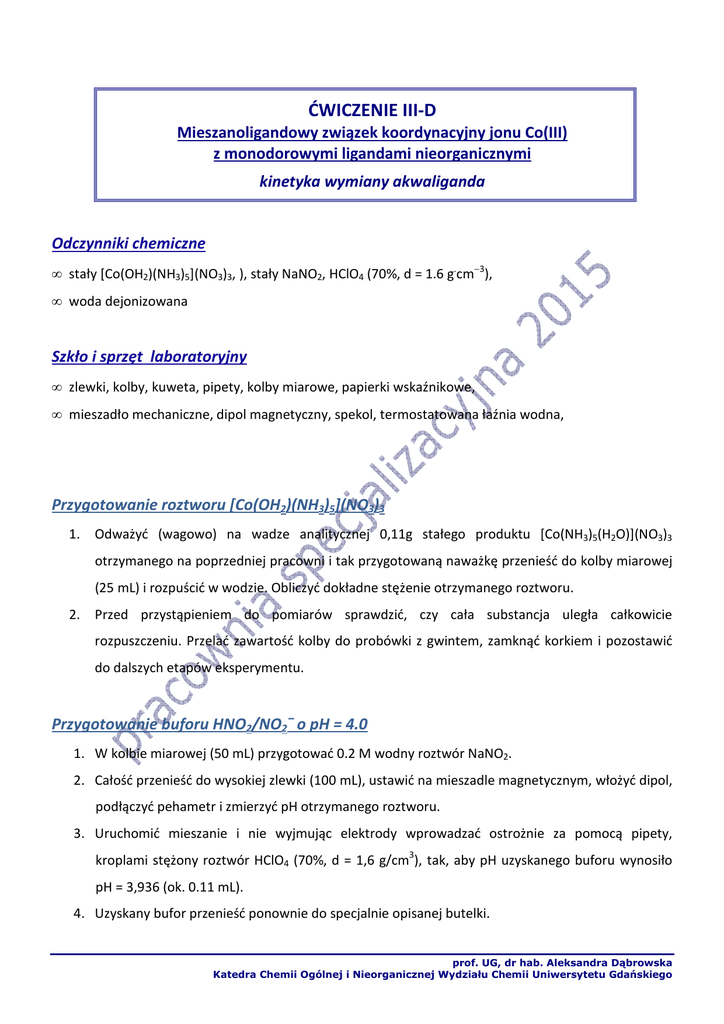 ĆWICZENIE III-D Mieszanoligandowy związek koordynacyjny jonu Co(III) z monodorowymi ligandami nieorganicznymi kinetyka wymiany akwaliganda Odczynniki chemiczne • stały [Co(OH2)(NH3)5](NO3)3, ), stały NaNO2, HClO4 (70%, d = 1.6 g.cm−3), • woda dejonizowana Szkło i sprzęt laboratoryjny • zlewki, kolby, kuweta, pipety, kolby miarowe, papierki wskaźnikowe, • mieszadło mechaniczne, dipol magnetyczny, spekol, termostatowana łaźnia wodna, Przygotowanie roztworu [Co(OH2)(NH3)5](NO3)3 1. Odważyć (wagowo) na wadze analitycznej 0,11g stałego produktu [Co(NH3)5(H2O)](NO3)3 otrzymanego na poprzedniej pracowni i tak przygotowaną naważkę przenieść do kolby miarowej (25 mL) i rozpuścić w wodzie. Obliczyć dokładne stężenie otrzymanego roztworu. 2. Przed przystąpieniem do pomiarów sprawdzić, czy cała substancja uległa całkowicie rozpuszczeniu. Przelać zawartość kolby do probówki z gwintem, zamknąć korkiem i pozostawić do dalszych etapów eksperymentu. Przygotowanie buforu HNO2/NO2− o pH = 4.0 1. W kolbie miarowej (50 mL) przygotować 0.2 M wodny roztwór NaNO2. 2. Całość przenieść do wysokiej zlewki (100 mL), ustawić na mieszadle magnetycznym, włożyć dipol, podłączyć pehametr i zmierzyć pH otrzymanego roztworu. 3. Uruchomić mieszanie i nie wyjmując elektrody wprowadzać ostrożnie za pomocą pipety, kroplami stężony roztwór HClO4 (70%, d = 1,6 g/cm3), tak, aby pH uzyskanego buforu wynosiło pH = 3,936 (ok. 0.11 mL). 4. Uzyskany bufor przenieść ponownie do specjalnie opisanej butelki. prof. UG, dr hab. Aleksandra Dąbrowska Katedra Chemii Ogólnej i Nieorganicznej Wydziału Chemii Uniwersytetu Gdańskiego 2 Kinetyka wymiany akwaliganda 1. Włączyć spektrofotometr uv-vis (lub spekol) 10 minut przed planowanym eksperymentem) 2. Ustawić w spektrofotometrze odpowiednie parametry pomiarowe (m.in. temperaturę pomiaru, zakres pomiaru absorpcji, ścieżkę zapisu, nazwy serii pomiarowej, itp.). Zakres pomiarowy dla badanych substancji wynosi 350 – 600 nm (lub 490 nm). 3. Wykonać pomiar w temperaturze pokojowej. 4. Skalibrować spektrofotometr/spekol na puste kuwety. 5. Do pustej kuwety odmierzyć 1.5 mL roztworu kompleksu i 1.5 mL roztworu buforu, wrzucić niewielkie mieszadełko, oba roztwory dobrze wymieszać 6. Zarejestrować widmo uv (A0) i zapisać czas reakcji (t0). 7. Przenieść kuwetę z roztworem na mieszadło. 8. W odstępach czasowych wynoszących 2 minuty zarejestrować wartość absorbancji do momentu, aż zmiany absorbancji będą zerowe. 9. Każdorazowo po wykonaniu pomiaru kuwetę należy ustawiać na mieszadle magnetycznym. Kinetyka izomeryzacji 1. Włączyć spektrofotometr uv-vis (lub spekol) 10 minut przed planowanym eksperymentem) 2. Ustawić w spektrofotometrze odpowiednie parametry pomiarowe (m.in. temperaturę pomiaru, zakres pomiaru absorpcji, ścieżkę zapisu, nazwy serii pomiarowej, itp.). Zakres pomiarowy dla badanych substancji wynosi 350 – 600 nm (lub 455 nm). 3. Ustawić termostat na temperaturę 40 °C. 4. Do probówki zamykanej korkiem wlać 10 mL roztworu kompleksu, a do drugiej 10 mL roztworu buforu. Całość dobrze wymieszać i włożyć do termostatowanej łaźni. 5. Skalibrować spektrofotometr/spekol na puste kuwety. 10. Gdy temperatura roztworu osiągnie wymaganą wartość, oba roztwory znajdujące się w łaźni należy zmieszać ze sobą. 6. Natychmiast po zmieszaniu odmierzyć do pustej kuwety 2 mL roztworu kompleksu w buforze, zarejestrować widmo uv (A0) i zapisać czas reakcji (t0). 7. Po pomiarze zawartość kuwety wylać, a kuwetę wysuszyć. 8. Pozostały roztwór kompleksu umieścić na powrót w termostatowanej łaźni wodnej. prof. UG, dr hab. Aleksandra Dąbrowska Katedra Chemii Ogólnej i Nieorganicznej Wydziału Chemii Uniwersytetu Gdańskiego 3 9. W odstępach czasowych wynoszących 2 minuty rejestrować wartość absorbancji do momentu, aż zmiany absorbancji będą zerowe. Wyznaczanie A∞ 1. Przygotować w zlewce łaźnię wodną o temperaturze 70 °C. 2. Przelać do próbki zamykanej korkiem 5 mL roztworu kompleksu i 5 mL roztworu buforu i oba roztwory dobrze wymieszać. 3. Probówkę włożyć do łaźni wodnej i termostatować ją ok. 3 godzin. 4. Po tym czasie odmierzyć do pustej kuwety 3 mł uzyskanego roztworu i zarejestrować wartość A∞ (t∞). Opracowanie wyników 1. Na podstawie uzyskanych wyników przygotować i uzupełnić poniższą tabelę: T = 20 °C czas t[s] absorbancja (At) (At– A0) ln(At– A0) (At– A0)−1 T = 40 °C 2. Dla każdej temperatury sporządzić 3 wykresy zależności: a) (At – A) = f(t); b) ln(At – A) = f(t); c) (At – A)−1 = f(t) i na tej podstawie określić rząd reakcji. 3. Na podstawie odpowiedniego wykresu wyznaczyć wartość stałej szybkości reakcji wymiany akwaliganda (w temperaturze pokojowej) i stałej szybkości reakcji izomeryzacji (t 40 °C) 4. Napisać ogólne wyrażenie obrazujące szybkość badanej reakcji. 5. Podać zapis reakcji wymiany akwaliganda i zaproponować mechanizm. 6. Podać zapis reakcji izomeryzacji i zaproponować mechanizm. 7. Przedyskutować jakościowo mechanizmy obu badanych reakcji. prof. UG, dr hab. Aleksandra Dąbrowska Katedra Chemii Ogólnej i Nieorganicznej Wydziału Chemii Uniwersytetu Gdańskiego 4 8. Określić różnice pomiędzy produktem trwałym kinetycznie a trwałym termodynamicznie. Literatura 1. Wilkinson G.; Cotton F.A., Advanced Inorganic Chemistry, 6thEd.; Wiley, New York (1999). 2. Huheey J.E., Inorganic Chemistry, 3rd Ed.; Harper & Row: New York (1983). 3. Basolo F.; Pearson R.G., Mechanisms of Inorganic Reactions, Wiley, New York (1958). 4. Shriver D.F.; Atkins P.W., Inorganic Chemistry; Freeman, New York, 452 (1990). 5. Nakamoto K., Infrared and Raman Spectra of Inorganic and Coordination Compounds; Wiley, New York (1997). 6. Wilkinson G.; Gillard R.D.; McClevery J.A., Comprehensive Coordination Chemistry; Pergamon Press, Oxford, 1:1-31; 2:23; 4:666 (1987). 7. Balzani