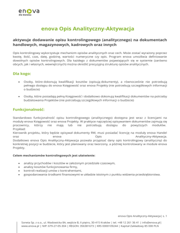 enova Opis Analityczny-Aktywacja aktywuje dodawanie opisu kontrolingowego (analitycznego) na dokumentach handlowych, magazynowych, kadrowych oraz innych Opis kontrolingowy wykorzystuje mechanizm opisów analitycznych oraz cech. Może zostać wyrażony poprzez kwotę, ilość, czas, datę, godzinę, wartości numeryczne czy opis. Program enova umożliwia definiowanie dowolnych opisów kontrolingowych. Dla każdego z dokumentów pojawiających się w systemie (zarówno obcych, jak i własnych, wewnętrznych) można określić precyzyjną strukturę opisów analitycznych. Dla kogo: Osoby, które dokonują kwalifikacji kosztów (opisują dokumenty), a równocześnie nie potrzebują pełnego dostępu do enova Księgowość oraz enova Projekty (nie potrzebują szczegółowych informacji o budżecie) Osoby, które posiadają pełną Księgowość i dodatkowo dokonują kwalifikacji dokumentów na potrzeby budżetowania Projektów (nie potrzebują szczegółowych informacji o budżecie) Funkcjonalność: Standardowo funkcjonalność opisu kontrolingowego (analitycznego) dostępna jest wraz z licencjami na moduły enova Księgowość oraz enova Projekty. W praktyce najczęściej opisywaniem dokumentów zajmują się pracownicy, którzy nie mają lub nie potrzebują dostępu do powyższych modułów. Przykład: Kierownik projektu, który będzie opisywał dokumenty RW, musi posiadać licencję na moduły enova Handel oraz enova Opis Analityczny-Aktywacja. Dodatkowo enova Opis Analityczny-Aktywacja pozwala przypisać dany opis kontrolingowy (analityczny) do konkretnej pozycji w budżecie, który jest planowany oraz tworzony, a później kontrolowany w module enova Projekty. Celem mechanizmów kontrolingowych jest ułatwienie: analizy przychodów i kosztów w założonym przedziale czasowym, analizy kosztów funkcjonowania firmy, kontroli realizacji umów z kontrahentami, gospodarowania środkami finansowymi w układzie istotnym z punktu widzenia przedsiębiorstwa. enova Opis Analityczny-Aktywacja| s. 1 Soneta Sp. z o.o., ul. Wadowicka 8A, wejście B, II piętro, 30-415 Kraków | tel. +48 12 261 36 41 | [email protected]| www.enova.pl | NIP: 679-27-05-304 | REGON: 356381673 | KRS 0000109244 | Kapitał Zakładowy 85 000 PLN Benefity: definiowanie kosztów rodzajowych oraz miejsc powstawania kosztów, uwzględniając indywidualne potrzeby użytkownika, zadania można grupować w dowolne grupy tematyczne, budowanie informacji księgowej do rozksięgowania kosztów wg kolejnych zleceń, projektów itp., w oparciu o niektóre elementy opisu kontrolingowego można opracowywać dynamiczne księgowania, które będą stanowić bazę do gromadzenia informacji niezbędnych do prowadzenia księgowości rachunkowej i podatkowej, wszystkie dane podstawowe i budżetowe można, z poziomu użytkownika, eksportować do programów MS Word i Excel w formie standardowych raportów i dalej je analizować. enova Opis Analityczny-Aktywacja| s. 2 Soneta Sp. z o.o., ul. Wadowicka 8A, wejście B, II piętro, 30-415 Kraków | tel. +48 12 261 36 41 | [email protected]| www.enova.pl | NIP: 679-27-05-304 | REGON: 356381673 | KRS 0000109244 | Kapitał Zakładowy 85 000 PLN