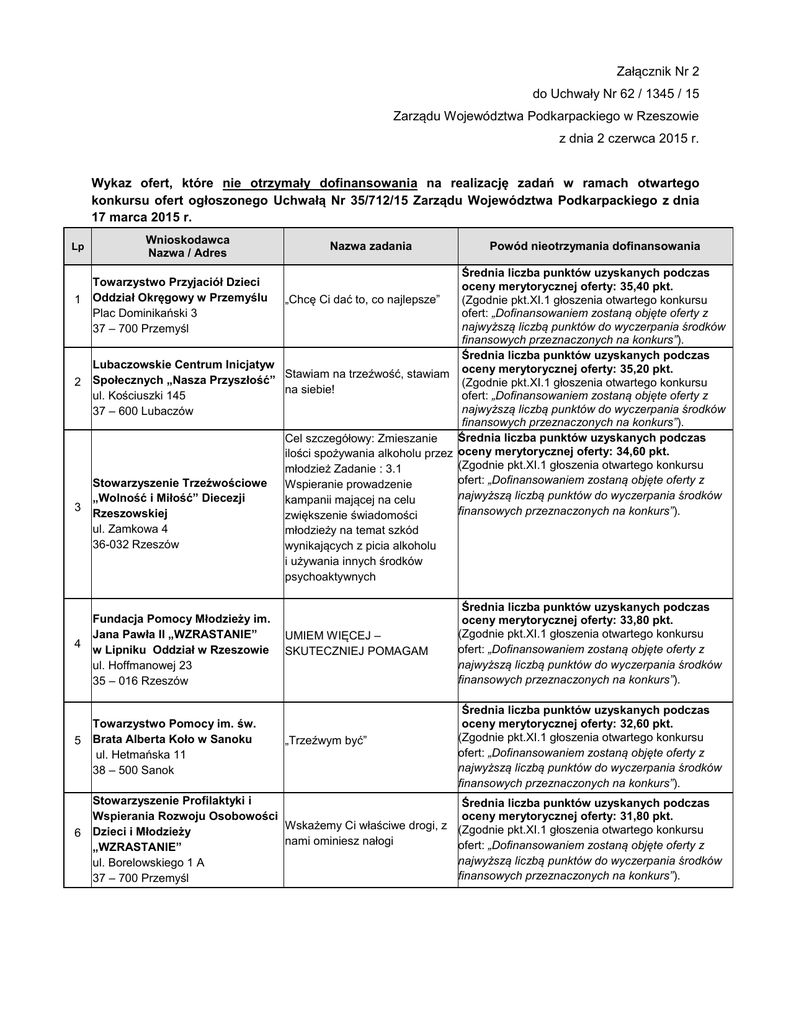 Załącznik Nr 2 do Uchwały Nr 62 / 1345 / 15 Zarządu Województwa Podkarpackiego w Rzeszowie z dnia 2 czerwca 2015 r. Wykaz ofert, które nie otrzymały dofinansowania na realizację zadań w ramach otwartego konkursu ofert ogłoszonego Uchwałą Nr 35/712/15 Zarządu Województwa Podkarpackiego z dnia 17 marca 2015 r. Lp 1 2 3 Wnioskodawca Nazwa / Adres Powód nieotrzymania dofinansowania Średnia liczba punktów uzyskanych podczas oceny merytorycznej oferty: 35,40 pkt. „Chcę Ci dać to, co najlepsze” (Zgodnie pkt.XI.1 głoszenia otwartego konkursu ofert: „Dofinansowaniem zostaną objęte oferty z najwyższą liczbą punktów do wyczerpania środków finansowych przeznaczonych na konkurs”). Średnia liczba punktów uzyskanych podczas Lubaczowskie Centrum Inicjatyw Stawiam na trzeźwość, stawiam oceny merytorycznej oferty: 35,20 pkt. Społecznych „Nasza Przyszłość” (Zgodnie pkt.XI.1 głoszenia otwartego konkursu na siebie! ofert: „Dofinansowaniem zostaną objęte oferty z ul. Kościuszki 145 najwyższą liczbą punktów do wyczerpania środków 37 – 600 Lubaczów finansowych przeznaczonych na konkurs”). Średnia liczba punktów uzyskanych podczas Cel szczegółowy: Zmieszanie ilości spożywania alkoholu przez oceny merytorycznej oferty: 34,60 pkt. (Zgodnie pkt.XI.1 głoszenia otwartego konkursu młodzież Zadanie : 3.1 ofert: „Dofinansowaniem zostaną objęte oferty z Stowarzyszenie Trzeźwościowe Wspieranie prowadzenie najwyższą liczbą punktów do wyczerpania środków „Wolność i Miłość” Diecezji kampanii mającej na celu finansowych przeznaczonych na konkurs”). Rzeszowskiej zwiększenie świadomości ul. Zamkowa 4 młodzieży na temat szkód 36-032 Rzeszów wynikających z picia alkoholu i używania innych środków psychoaktywnych Towarzystwo Przyjaciół Dzieci Oddział Okręgowy w Przemyślu Plac Dominikański 3 37 – 700 Przemyśl 4 Fundacja Pomocy Młodzieży im. Jana Pawła II „WZRASTANIE” w Lipniku Oddział w Rzeszowie ul. Hoffmanowej 23 35 – 016 Rzeszów 5 Towarzystwo Pomocy im. św. Brata Alberta Koło w Sanoku ul. Hetmańska 11 38 – 500 Sanok 6 Nazwa zadania UMIEM WIĘCEJ – SKUTECZNIEJ POMAGAM „Trzeźwym być” Stowarzyszenie Profilaktyki i Wspierania Rozwoju Osobowości Wskażemy Ci właściwe drogi, z Dzieci i Młodzieży nami ominiesz nałogi „WZRASTANIE” ul. Borelowskiego 1 A 37 – 700 Przemyśl Średnia liczba punktów uzyskanych podczas oceny merytorycznej oferty: 33,80 pkt. (Zgodnie pkt.XI.1 głoszenia otwartego konkursu ofert: „Dofinansowaniem zostaną objęte oferty z najwyższą liczbą punktów do wyczerpania środków finansowych przeznaczonych na konkurs”). Średnia liczba punktów uzyskanych podczas oceny merytorycznej oferty: 32,60 pkt. (Zgodnie pkt.XI.1 głoszenia otwartego konkursu ofert: „Dofinansowaniem zostaną objęte oferty z najwyższą liczbą punktów do wyczerpania środków finansowych przeznaczonych na konkurs”). Średnia liczba punktów uzyskanych podczas oceny merytorycznej oferty: 31,80 pkt. (Zgodnie pkt.XI.1 głoszenia otwartego konkursu ofert: „Dofinansowaniem zostaną objęte oferty z najwyższą liczbą punktów do wyczerpania środków finansowych przeznaczonych na konkurs”). 7 8 9 Towarzystwo Przyjaciół Dzieci Oddział Miejski w Mielcu ul. Mickiewicza 51 39 - 300 Mielec Uczniowski Klub Sportowy „PROMYK” 37 – 122 Albigowa 300 Towarzystwo Pomocy im. św. Brata Alberta Koło w Sanoku ul. Hetmańska 11 38 – 500 Sanok Fundacja „Światło-Życie” 10 Ośrodek w Sandomierzu ul. Mariacka 8 27 – 600 Sandomierz Inkubator Rozwoju Inicjatyw 11 Społecznych IRIS ul. Narutowicza 6 36 –100 Kolbuszowa Stowarzyszenie Lokalna Grupa Działania 12 „SIEDLISKO” ul. Kościuszki 6, lokal 2/4 36 – 100 Kolbuszowa Centrum Edukacji i Wsparcia 13 „RES-GEST” Ul. Langiewicza 22 35 – 085 Rzeszów 14 Stowarzyszenie „Dobry Dom” 37 – 311 Wola Zarczycka 129 A „Jestem trendy! – żyję zdrowo bez nałogów” „KOŃ – magiczna więź” „Natura – mój azyl twórczy” Średnia liczba punktów uzyskanych podczas oceny merytorycznej oferty: 30,40 pkt. (Zgodnie pkt.XI.1 głoszenia otwartego konkursu ofert: „Dofinansowaniem zostaną objęte oferty z najwyższą liczbą punktów do wyczerpania środków finansowych przeznaczonych na konkurs”). Średnia liczba punktów uzyskanych podczas oceny merytorycznej oferty: 29,80 pkt. (Zgodnie pkt.XI.1 głoszenia otwartego konkursu ofert: „Dofinansowaniem zostaną objęte oferty z najwyższą liczbą punktów do wyczerpania środków finansowych przeznaczonych na konkurs”). Średnia liczba punktów uzyskanych podczas oceny merytorycznej oferty: 26,80 pkt. (Zgodnie pkt.XI.1 głoszenia otwartego konkursu ofert: „Dofinansowaniem zostaną objęte oferty z najwyższą liczbą punktów do wyczerpania środków finansowych przeznaczonych na konkurs”). Oferta zakłada realizacje celu konkursu w minimalnym zakresie. W OAZIE WARTOŚCI – wypoczynek Średnia ocena wartości merytorycznej zadania: dla młodzieży 9,40 pkt. (pkt. X.2.d) ogłoszenia otwartego konkursu ofert). „TRENUJ MIĘŚNIE NIE TRAĆ GŁOWY” – PROFILAKTYKA POPRZEZ SPORT Wakacyjna szkółka ruchu Ryzyko wynikające ze spożywania alkoholu – kampania informacyjna dla osób niesłyszących Oferta zakłada realizacje celu konkursu w minimalnym zakresie. Średnia ocena wartości merytorycznej zadania: 5,40 pkt. (pkt. X.2.d) ogłoszenia otwartego konkursu ofert). Braki formalne: 1. Brak określenia w tytule zadania: celu, zadania wybranego do realizacji /pkt X. 3)l) ogłoszenia otwartego konkursu ofert/. 2. Niepodpisane CV 2 realizatorów zadania /pkt V.9.e) ogłoszenia otwartego konkursu ofert/. Braki formalne: 1. Brak określenia w tytule zadania: celu, zadania wybranego do realizacji /pkt X. 3)l) ogłoszenia otwartego konkursu ofert/. Braki formalne: 1. Brak zapisu dot. prowadzenia działalności statutowej w zakresie ochrony i promocji zdrowia i/l