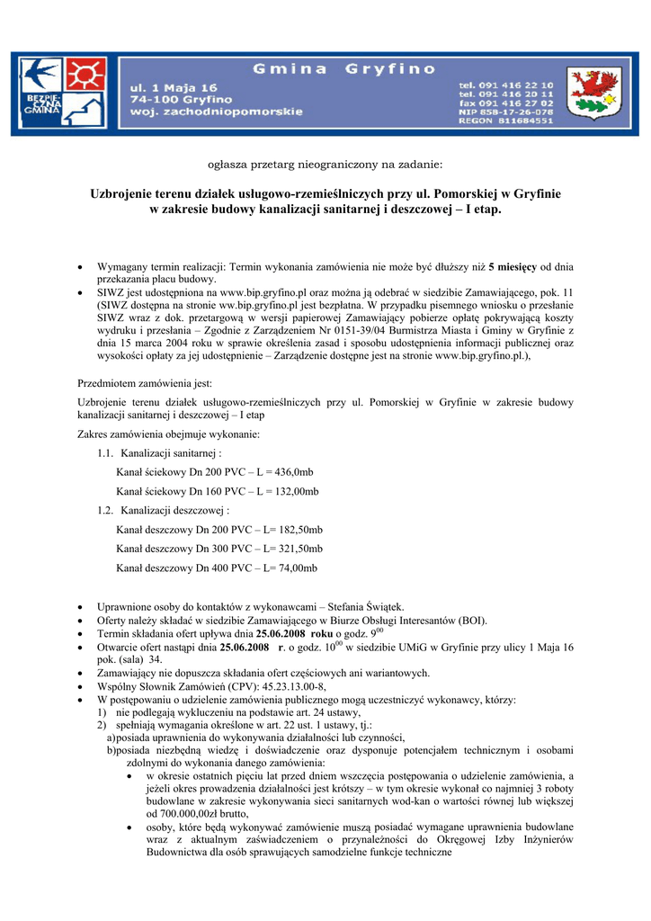 ogłasza przetarg nieograniczony na zadanie: Uzbrojenie terenu działek usługowo-rzemieślniczych przy ul. Pomorskiej w Gryfinie w zakresie budowy kanalizacji sanitarnej i deszczowej – I etap. • • Wymagany termin realizacji: Termin wykonania zamówienia nie może być dłuższy niż 5 miesięcy od dnia przekazania placu budowy. SIWZ jest udostępniona na www.bip.gryfino.pl oraz można ją odebrać w siedzibie Zamawiającego, pok. 11 (SIWZ dostępna na stronie ww.bip.gryfino.pl jest bezpłatna. W przypadku pisemnego wniosku o przesłanie SIWZ wraz z dok. przetargową w wersji papierowej Zamawiający pobierze opłatę pokrywającą koszty wydruku i przesłania – Zgodnie z Zarządzeniem Nr 0151-39/04 Burmistrza Miasta i Gminy w Gryfinie z dnia 15 marca 2004 roku w sprawie określenia zasad i sposobu udostępnienia informacji publicznej oraz wysokości opłaty za jej udostępnienie – Zarządzenie dostępne jest na stronie www.bip.gryfino.pl.), Przedmiotem zamówienia jest: Uzbrojenie terenu działek usługowo-rzemieślniczych przy ul. Pomorskiej w Gryfinie w zakresie budowy kanalizacji sanitarnej i deszczowej – I etap Zakres zamówienia obejmuje wykonanie: 1.1. Kanalizacji sanitarnej : Kanał ściekowy Dn 200 PVC – L = 436,0mb Kanał ściekowy Dn 160 PVC – L = 132,00mb 1.2. Kanalizacji deszczowej : Kanał deszczowy Dn 200 PVC – L= 182,50mb Kanał deszczowy Dn 300 PVC – L= 321,50mb Kanał deszczowy Dn 400 PVC – L= 74,00mb • • • • • • • Uprawnione osoby do kontaktów z wykonawcami – Stefania Świątek. Oferty należy składać w siedzibie Zamawiającego w Biurze Obsługi Interesantów (BOI). Termin składania ofert upływa dnia 25.06.2008 roku o godz. 900 Otwarcie ofert nastąpi dnia 25.06.2008 r. o godz. 1000 w siedzibie UMiG w Gryfinie przy ulicy 1 Maja 16 pok. (sala) 34. Zamawiający nie dopuszcza składania ofert częściowych ani wariantowych. Wspólny Słownik Zamówień (CPV): 45.23.13.00-8, W postępowaniu o udzielenie zamówienia publicznego mogą uczestniczyć wykonawcy, którzy: 1) nie podlegają wykluczeniu na podstawie art. 24 ustawy, 2) spełniają wymagania określone w art. 22 ust. 1 ustawy, tj.: a) posiada uprawnienia do wykonywania działalności lub czynności, b)posiada niezbędną wiedzę i doświadczenie oraz dysponuje potencjałem technicznym i osobami zdolnymi do wykonania danego zamówienia: • w okresie ostatnich pięciu lat przed dniem wszczęcia postępowania o udzielenie zamówienia, a jeżeli okres prowadzenia działalności jest krótszy – w tym okresie wykonał co najmniej 3 roboty budowlane w zakresie wykonywania sieci sanitarnych wod-kan o wartości równej lub większej od 700.000,00zł brutto, • osoby, które będą wykonywać zamówienie muszą posiadać wymagane uprawnienia budowlane wraz z aktualnym zaświadczeniem o przynależności do Okręgowej Izby Inżynierów Budownictwa dla osób sprawujących samodzielne funkcje techniczne c) znajduje się w sytuacji ekonomicznej i finansowej zapewniającej wykonanie zamówienia: • posiada rachunek bankowy, potwierdzający wysokość środków finansowych lub zdolność kredytową wykonawcy o wysokości minimum 50% ceny oferty( cena brutto), • jest ubezpieczony od odpowiedzialności cywilnej w zakresie prowadzonej działalności na kwotę nie mniejszą niż 1.000.000,00 zł. • Zamawiający żądać będzie od Wykonawcy, którego oferta zostanie wybrana jako najkorzystniejsza, wniesienia zabezpieczenia należytego wykonania umowy w wysokości 10 % ceny oferty brutto (szczegółowe informacje zawiera SIWZ). Warunkiem udziału w postępowaniu o zamówienie publiczne jest wniesienie wadium w wysokości: 15.000,00 zł słownie: trzy tysiące złotych. Wadium musi być wniesione najpóźniej do wyznaczonego terminu składania ofert. Termin związania ofertą wynosi 30 dni, licząc od upływu terminu do składania ofert. Kryteria wyboru oferty i ich znaczenie: Cena– 100% BURMISTRZ Miasta i Gminy Gryfino mgr inż. Henryk Piłat