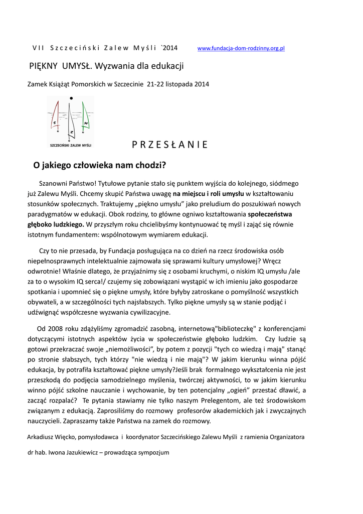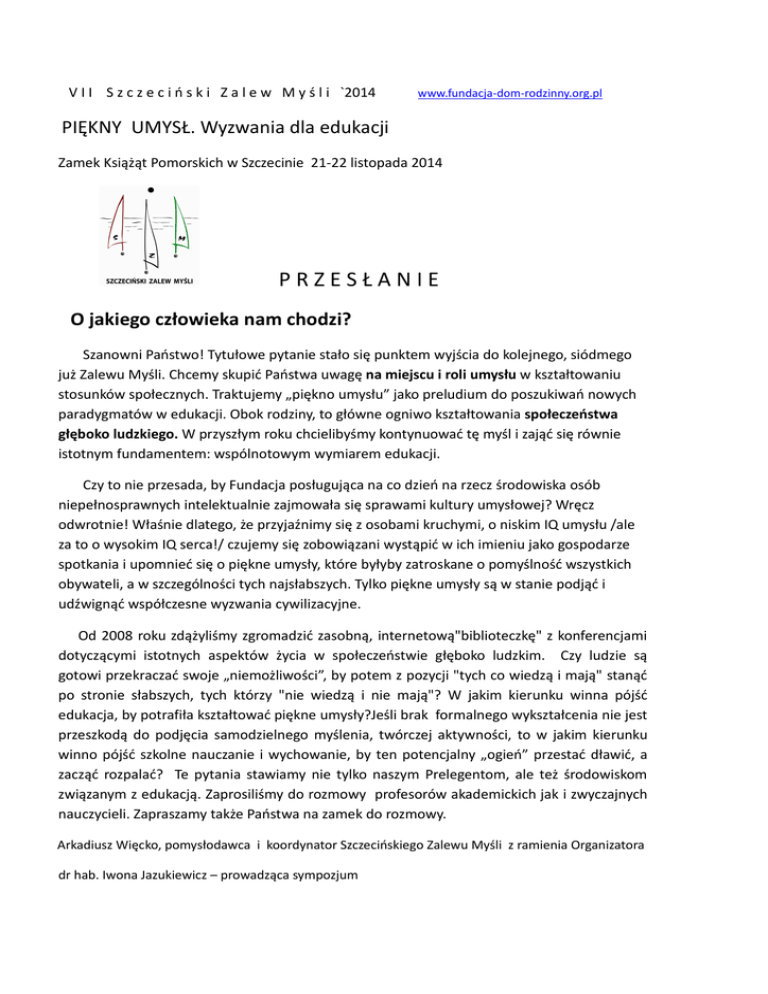 V I I S z c z e c i ń s k i Z a l e w M y ś l i `2014 www.fundacja-dom-rodzinny.org.pl PIĘKNY UMYSŁ. Wyzwania dla edukacji Zamek Książąt Pomorskich w Szczecinie 21-22 listopada 2014 PRZESŁANIE O jakiego człowieka nam chodzi? Szanowni Państwo! Tytułowe pytanie stało się punktem wyjścia do kolejnego, siódmego już Zalewu Myśli. Chcemy skupić Państwa uwagę na miejscu i roli umysłu w kształtowaniu stosunków społecznych. Traktujemy „piękno umysłu” jako preludium do poszukiwań nowych paradygmatów w edukacji. Obok rodziny, to główne ogniwo kształtowania społeczeństwa głęboko ludzkiego. W przyszłym roku chcielibyśmy kontynuować tę myśl i zająć się równie istotnym fundamentem: wspólnotowym wymiarem edukacji. Czy to nie przesada, by Fundacja posługująca na co dzień na rzecz środowiska osób niepełnosprawnych intelektualnie zajmowała się sprawami kultury umysłowej? Wręcz odwrotnie! Właśnie dlatego, że przyjaźnimy się z osobami kruchymi, o niskim IQ umysłu /ale za to o wysokim IQ serca!/ czujemy się zobowiązani wystąpić w ich imieniu jako gospodarze spotkania i upomnieć się o piękne umysły, które byłyby zatroskane o pomyślność wszystkich obywateli, a w szczególności tych najsłabszych. Tylko piękne umysły są w stanie podjąć i udźwignąć współczesne wyzwania cywilizacyjne. Od 2008 roku zdążyliśmy zgromadzić zasobną, internetową"biblioteczkę" z konferencjami dotyczącymi istotnych aspektów życia w społeczeństwie głęboko ludzkim. Czy ludzie są gotowi przekraczać swoje „niemożliwości”, by potem z pozycji "tych co wiedzą i mają" stanąć po stronie słabszych, tych którzy "nie wiedzą i nie mają"? W jakim kierunku winna pójść edukacja, by potrafiła kształtować piękne umysły?Jeśli brak formalnego wykształcenia nie jest przeszkodą do podjęcia samodzielnego myślenia, twórczej aktywności, to w jakim kierunku winno pójść szkolne nauczanie i wychowanie, by ten potencjalny „ogień” przestać dławić, a zacząć rozpalać? Te pytania stawiamy nie tylko naszym Prelegentom, ale też środowiskom związanym z edukacją. Zaprosiliśmy do rozmowy profesorów akademickich jak i zwyczajnych nauczycieli. Zapraszamy także Państwa na zamek do rozmowy. Arkadiusz Więcko, pomysłodawca i koordynator Szczecińskiego Zalewu Myśli z ramienia Organizatora dr hab. Iwona Jazukiewicz – prowadząca sympozjum