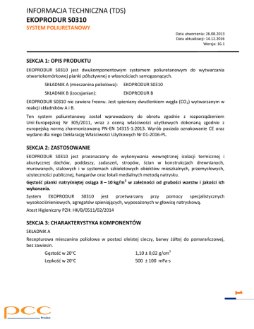 INFORMACJA TECHNICZNA (TDS) EKOPRODUR S0310 SYSTEM POLIURETANOWY Data utworzenia: 26.08.2013 Data aktualizacji: 14.12.2016 Wersja: 16.1 SEKCJA 1: OPIS PRODUKTU EKOPRODUR S0310 jest dwukomponentowym systemem poliuretanowym do wytwarzania otwartokomórkowej pianki półsztywnej o własnościach samogasnących. SKŁADNIK A (mieszanina poliolowa): EKOPRODUR S0310 SKŁADNIK B (izocyjanian): EKOPRODUR B EKOPRODUR S0310 nie zawiera freonu. Jest spieniany dwutlenkiem węgla (CO2) wytwarzanym w reakcji składników A i B. Ten system poliuretanowy został wprowadzony do obrotu zgodnie z rozporządzeniem Unii Europejskiej Nr 305/2011, wraz z oceną właściwości użytkowych dokonaną zgodnie z europejską normą zharmonizowaną PN-EN 14315-1:2013. Wyrób posiada oznakowanie CE oraz wydano dla niego Deklarację Właściwości Użytkowych Nr 01-2016-PL. SEKCJA 2: ZASTOSOWANIE EKOPRODUR S0310 jest przeznaczony do wykonywania wewnętrznej izolacji termicznej i akustycznej dachów, poddaszy, zadaszeń, stropów, ścian w konstrukcjach drewnianych, murowanych, stalowych i w systemach szkieletowych obiektów mieszkalnych, przemysłowych, użyteczności publicznej, hangarów oraz lokali medialnych metodą natrysku. Gęstość pianki natryśniętej osiąga 8 – 10 kg/m3 w zależności od grubości warstw i jakości ich wykonania. System EKOPRODUR S0310 jest przetwarzany przy pomocy specjalistycznych wysokociśnieniowych, agregatów spieniających, wyposażonych w głowicę natryskową. Atest Higieniczny PZH: HK/B/0511/02/2014 SEKCJA 3: CHARAKTERYSTYKA KOMPONENTÓW SKŁADNIK A Recepturowa mieszanina poliolowa w postaci oleistej cieczy, barwy żółtej do pomarańczowej, bez zawiesin. Gęstość w 20ºC 1,10 ± 0,02 g/cm3 Lepkość w 20ºC 500 ± 100 mPa·s 1 INFORMACJA TECHNICZNA (TDS) EKOPRODUR S0310 SYSTEM POLIURETANOWY Data utworzenia: 26.08.2013 Data aktualizacji: 14.12.2016 Wersja: 16.1 SKŁADNIK B Mieszanina aromatycznych poliizocyjanianów, Ciecz o barwie brunatnej, bez zawiesin. głównie diizocyjanianu Gęstość w 20ºC 1,22 ± 0,02 g/cm3 Lepkość w 20ºC 350 ± 100 mPa·s difenylometanu. SEKCJA 4: CHARAKTERYSTYKA SPIENIANIA W WARUNKACH LABORATORYJNYCH Czasy reakcji1 oraz gęstość pozorna rdzenia2 mierzone były w warunkach laboratoryjnych (w temp. 20ºC). Czas startu1 Czas żelowania 4 ± 1 sek. 1 Czas suchego lica 10 ± 2 sek. 1 Gęstość pozorna rdzenia 13 ± 3 sek. 9 ± 1,5 kg/m3 SEKCJA 5: ZALECANE WARUNKI PRZETWÓRSTWA Zalecenia oparto na doświadczeniach w natrysku maszyną Graco Reaktor H-XP3 z pistoletem PROBLER P2 ELITE (komora mieszania 01) oraz mieszadłem dobeczkowym Twistork. WAŻNE: Przed użyciem należy podgrzać oba składniki do temperatury 30-40ºC. Dodatkowo należy dokładnie wymieszać Składnik A (około 1 godziny, mieszadłem dobeczkowym – zalecane mieszadło Twistork firmy Graco). Składnik A ma skłonność do powolnego rozwarstwiania. Składnik B nie wymaga mieszania. Objętościowy stosunek składników A : B 100 : 100 Nastawy temperatur na maszynie: Temperatura grzania A i B: 50-60ºC Grzanie węży: 50-60ºC Ciśnienie składników: 80-110 bar (1160-1595 psi) Temperatura składników w beczkach: 30-40ºC 1 2 Czasy reakcji mierzone są od rozpoczęcia mieszania. Czas startu – do momentu rozpoczęcia wzrostu mieszaniny. Czas żelowania – do momentu wyciągania zżelowanych włókien z pianki. Czas suchego lica – do momentu, gdy powierzchnia pianki nie klei się przy dotknięciu. (Procedura według instrukcji własnej IJ 11 02). 2 Gęstość pozorną rdzenia mierzy się po wycięciu prostopadłościennej kostki z pianki (wg PN-EN 1602:2013-07). INFORMACJA TECHNICZNA (TDS) EKOPRODUR S0310 SYSTEM POLIURETANOWY Data utworzenia: 26.08.2013 Data aktualizacji: 14.12.2016 Wersja: 16.1 Temperatura otoczenia: 10-35ºC Zalecana temperatura podłoża: 15-50ºC Wilgotność względna otoczenia: 70% Wilgotność podłoża porowatego: do 15% Powierzchnie izolowane powinny być wcześniej przygotowane. Nie powinny zawierać pyłu, oleju, luźnych fragmentów oraz innych środków mogących zmniejszyć przyczepność piany. Przed wykonaniem natrysku należy starannie zabezpieczyć powierzchnie sąsiadujących obiektów, okien, drzwi, podłóg, mebli itp., aby uniknąć przypadkowego zabrudzenia podczas natrysku – należy pamiętać, że natryśnięta pianka ma bardzo dobrą przyczepność i może być trudna do późniejszego usunięcia z niepożądanych miejsc. Nastawa ciśnienia dla Składnika A oraz dla Składnika B powinna być jednakowa. Natrysk powinno się wykonywać w taki sposób aby uzyskane warstwy były jak najgrubsze ( >100mm). Przy przetwarzaniu systemu należy uwzględnić wskazówki i informacje zawarte w Kartach Charakterystyk obu składników. SEKCJA 6: WŁASNOŚCI NATRYŚNIĘTEJ PIANKI Pianka wycięta z próbki wykonanej przy użyciu specjalistycznej maszyny. Gęstość pozorna rdzenia: ≥ 7 kg/m3 PN-EN 1602:2013-07 Klasyfikacja ogniowa: Bs1d03 PN-EN 13501-1+A1:2010 F PN-EN 13501-1+A1:2010 ≤ 0,85 kg/m2 PN-EN 1609:2013 PN-EN 12667:2002 Krótkotrwała nasiąkliwość wodą przy częściowym zanurzeniu, WP Współczynnik przewodności cieplnej: λmean, i 0,037 W/(m·K) λ90, 90 0,038 W/(m·K) Wartość starzeniowa, λD Naprężenie ściskające przy 10% odkształceniu względnym, σ10 PN-EN 12667:2002 ≥ 6 kPa PN-EN 826:2013-07 dot. układu warstw składającego się z pianki EKOPRODUR S0310 na podkładach palnych lub niepalnych, pokrytej okładziną z płyt gipsowo-kartonowych, na konstrukcji drewnianej lub metalowej o grubości płyty G-K 12,5 mm 3 3 0,038 W/(m·K) INFORMACJA TECHNICZNA (TDS) EKOPRODUR S0310 SYSTEM POLIURETANOWY Data utworzenia: 26.08.2013 Data aktualizacji: 14.12.2016 Wersja: 16.1 Współczynnik oporu dyfuzyjnego pary wodnej, μ Stabilność temperaturowa: 70ºC, 90% RH, po 48 h 3 PN-EN 12086:2013-07 PN-EN 1604:2013-07 d≤4% sz ≤ 4 % g≤1% -30ºC, po 48 h d≤2% sz ≤ 2 % g ≤ 0,5 % Przyczepność pianki prostopadle do podło