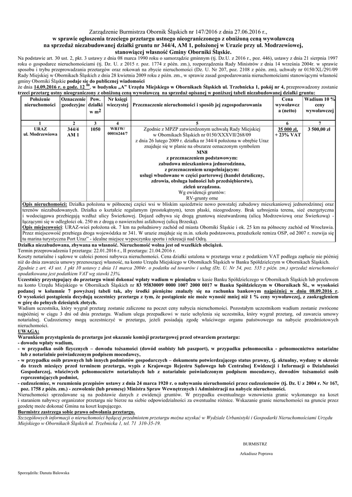 Zarządzenie Burmistrza Obornik Śląskich nr 147/2016 z dnia 27.06.2016 r., w sprawie ogłoszenia trzeciego przetargu ustnego nieograniczonego z obniżoną ceną wywoławczą na sprzedaż niezabudowanej działki gruntu nr 344/4, AM 1, położonej w Urazie przy ul. Modrzewiowej, stanowiącej własność Gminy Oborniki Śląskie. Na podstawie art. 30 ust. 2, pkt. 3 ustawy z dnia 08 marca 1990 roku o samorządzie gminnym (tj. Dz.U. z 2016 r., poz. 446), ustawy z dnia 21 sierpnia 1997 roku o gospodarce nieruchomościami (tj. Dz. U. z 2015 r. poz. 1774 z późn. zm.), rozporządzenia Rady Ministrów z dnia 14 września 2004r. w sprawie sposobu i trybu przeprowadzania przetargów oraz rokowań na zbycie nieruchomości (Dz. U. Nr 207, poz. 2108 z późn. zm), uchwały nr 0150/XL/291/09 Rady Miejskiej w Obornikach Śląskich z dnia 28 kwietnia 2009 roku z późn. zm., w sprawie zasad gospodarowania nieruchomościami stanowiącymi własność gminy Oborniki Śląskie podaje się do publicznej wiadomości że dnia 14.09.2016 r. o godz. 12 00, w budynku „A” Urzędu Miejskiego w Obornikach Śląskich ul. Trzebnicka 1, pokój nr 4, przeprowadzony zostanie trzeci przetarg ustny nieograniczony z obniżoną ceną wywoławczą na sprzedaż opisanej w poniższej tabeli niezabudowanej działki gruntu: Położenie Oznaczenie Pow. Nr księgi Cena Wadium 10 % nieruchomości geodezyjne działki wieczystej Przeznaczenie nieruchomości i sposób jej zagospodarowania wywoławcz ceny a (netto) wywoławczej w m2 1 URAZ ul. Modrzewiowa 2 3 4 5 6 7 Zgodnie z MPZP zatwierdzonym uchwałą Rady Miejskiej 35 000 zł, 3 500,00 zł w Obornikach Śląskich nr 0150/XXXVII/268/09 + 23% VAT z dnia 26 lutego 2009 r. działka nr 344/4 położona w obrębie Uraz znajduje się w planie na obszarze oznaczonym symbolem MN8 z przeznaczeniem podstawowym: zabudowa mieszkaniowa jednorodzinna, z przeznaczeniem uzupełniającym: usługi wbudowane w części parterowej (handel detaliczny, zdrowia, obsługa ludności lub przedsiębiorstw), zieleń urządzona. Wg ewidencji gruntów: RV-grunty orne Opis nieruchomości: Działka położona w północnej części wsi w bliskim sąsiedztwie nowo powstałej zabudowy mieszkaniowej jednorodzinnej oraz terenów niezabudowanych. Działka o kształcie regularnym (prostokątnym), teren płaski, nieogrodzony. Brak uzbrojenia terenu, sieć energetyczna i wodociągowa przebiegają wzdłuż ulicy Świerkowej. Dojazd odbywa się drogą gruntową nieutwardzoną (ulicą Modrzewiową oraz Świerkową) łączącymi się w odległości ok. 250 m z drogą o nawierzchni asfaltowej (ulicą Brzeską). Opis miejscowości: URAZ-wieś położona ok. 7 km na południowy zachód od miasta Oborniki Śląskie i ok. 25 km na północny zachód od Wrocławia. Przez miejscowość przebiega droga wojewódzka nr 341. W urazie znajduje się m.in. szkoła podstawowa, przedszkole remiza OSP, od 2007 r. rozwija się tu marina turystyczna Port Uraz” - idealne miejsce wypoczynku sportu i rekreacji nad Odrą. Działka niezabudowana, zbywana na własność. Nieruchomość wolna jest od wszelkich obciążeń. Termin przeprowadzenia I przetargu: 22.01.2016 r., II przetargu: 21.04.2016 r. Koszty notarialne i sądowe w całości ponosi nabywca nieruchomości. Cena działki ustalona w przetargu wraz z podatkiem VAT podlega zapłacie nie później niż do dnia zawarcia umowy przenoszącej własność, na konto Urzędu Miejskiego w Obornikach Śląskich w Banku Spółdzielczym w Obornikach Śląskich. Zgodnie z art. 43 ust. 1 pkt 10 ustawy z dnia 11 marca 2004r. o podatku od towarów i usług (Dz. U. Nr 54, poz. 535 z późn. zm.) sprzedaż nieruchomości opodatkowana jest podatkiem VAT wg stawki 23%. Uczestnicy przystępujący do przetargu winni dokonać wpłaty wadium w pieniądzu w kasie Banku Spółdzielczego w Obornikach Śląskich lub przelewem na konto Urzędu Miejskiego w Obornikach Śląskich nr 83 95830009 0000 1007 2000 0017 w Banku Spółdzielczym w Obornikach Śl., w wysokości podanej w kolumnie 7 powyższej tabeli tak, aby środki pieniężne znalazły się na rachunku bankowym najpóźniej w dniu 08.09.2016 r. O wysokości postąpienia decydują uczestnicy przetargu z tym, że postąpienie nie może wynosić mniej niż 1 % ceny wywoławczej, z zaokrągleniem w górę do pełnych dziesiątek złotych. Wadium uczestnika, który wygrał przetarg zostanie zaliczone na poczet ceny nabycia nieruchomości. Pozostałym uczestnikom wadium zostanie zwrócone najpóźniej w ciągu 3 dni od dnia przetargu. Wadium ulega przepadkowi w razie uchylenia się uczestnika, który wygrał przetarg, od zawarcia umowy notarialnej. Cudzoziemcy mogą uczestniczyć w przetargu, jeżeli posiadają zgodę właściwego organu państwowego na nabycie przedmiotowych nieruchomości. UWAGA: Warunkiem przystąpienia do przetargu jest okazanie komisji przetargowej przed otwarciem przetargu: - dowodu wpłaty wadium, - w przypadku osób fizycznych – dowodu tożsamości (dowód osobisty lub paszport), w przypadku pełnomocnika - pełnomocnictwo notarialne lub z notarialnie poświadczonym podpisem mocodawcy, - w przypadku osób prawnych lub innych podmiotów gospodarczych – dokumentu potwierdzającego status prawny, tj. aktualny, wydany w okresie do trzech miesięcy przed terminem przetargu, wypis z Krajowego Rejestru Sądowego lub Centralnej Ewidencji i Informacji o Działalności Gospodarczej, właściwych pełnomocnictw notarialnych lub z notarialnie poświadczonym podpisem mocodawcy, dowodów tożsamości osób reprezentujących podmiot, - cudzoziemiec, w rozumieniu przepisów ustawy z dnia 24 marca 1920 r. o nabywaniu nieruchomości przez cudzoziemców (tj. Dz. U z 2004 r. Nr 167, poz. 1758 z późn. zm.) - zezwolenie (lub promesę) Ministra Spraw Wewnętrznych i Administracji na nabycie nieruchomości. Nieruchomości sprzedawane są na podstawie danych z ewidencji gruntów. W przypadku ewentualnego wznowienia granic wykonanego na koszt i staraniem 