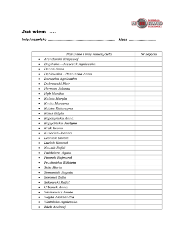 Już wiem .... Imię i nazwisko ....................................................................... Nazwisko i imię nauczyciela Arendarski Krzysztof Bagińska - Juszczak Agnieszka Banaś Anna Bąblewska - Pastuszka Anna Borzęcka Agnieszka Dąbrowski Piotr Herman Jolanta Hyb Monika Kaleta Maryla Kmita Marzena Kobiec Katarzyna Kolus Edyta Kopczyńska Anna Kopycińska Justyna Kruk Iwona Kwiecień Joanna Leśniak Dorota Luciak Konrad Nowak Rafał Paździerz Agata Pisarek Rajmund Pruchnicka Elżbieta Sala Marta Semaniak Jagoda Seremet Zofia Sękowski Rafał Urbanek Anna Walkiewicz Anuta Wojda Aleksandra Woźnicka Agnieszka Zdeb Andrzej klasa ............................. Nr zdjęcia