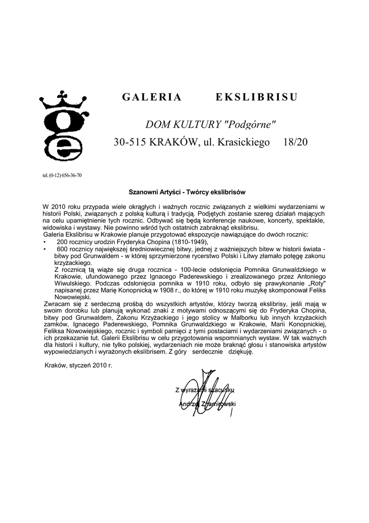 GALERIA EKSLIBRISU DOM KULTURY "Podgórne" 30-515 KRAKÓW, ul. Krasickiego 18/20 tel. (0-12) 656-36-70 Szanowni Artyści - Twórcy ekslibrisów W 2010 roku przypada wiele okrągłych i ważnych rocznic związanych z wielkimi wydarzeniami w historii Polski, związanych z polską kulturą i tradycją. Podjętych zostanie szereg działań mających na celu upamiętnienie tych rocznic. Odbywać się będą konferencje naukowe, koncerty, spektakle, widowiska i wystawy. Nie powinno wśród tych ostatnich zabraknąć ekslibrisu. Galeria Ekslibrisu w Krakowie planuje przygotować ekspozycje nawiązujące do dwóch rocznic: • 200 rocznicy urodzin Fryderyka Chopina (1810-1949), • 600 rocznicy największej średniowiecznej bitwy, jednej z ważniejszych bitew w historii świata bitwy pod Grunwaldem - w której sprzymierzone rycerstwo Polski i Litwy złamało potęgę zakonu krzyżackiego. Z rocznicą tą wiąże się druga rocznica - 100-lecie odsłonięcia Pomnika Grunwaldzkiego w Krakowie, ufundowanego przez Ignacego Paderewskiego i zrealizowanego przez Antoniego Wiwulskiego. Podczas odsłonięcia pomnika w 1910 roku, odbyło się prawykonanie „Roty" napisanej przez Marię Konopnicką w 1908 r., do której w 1910 roku muzykę skomponował Feliks Nowowiejski. Zwracam się z serdeczną prośbą do wszystkich artystów, którzy tworzą ekslibrisy, jeśli mają w swoim dorobku lub planują wykonać znaki z motywami odnoszącymi się do Fryderyka Chopina, bitwy pod Grunwaldem, Zakonu Krzyżackiego i jego stolicy w Malborku lub innych krzyżackich zamków, Ignacego Paderewskiego, Pomnika Grunwaldzkiego w Krakowie, Marii Konopnickiej, Feliksa Nowowiejskiego, rocznic i symboli pamięci z tymi postaciami i wydarzeniami związanych - o ich przekazanie tut. Galerii Ekslibrisu w celu przygotowania wspomnianych wystaw. W tak ważnych dla historii i kultury, nie tylko polskiej, wydarzeniach nie może braknąć głosu i stanowiska artystów wypowiedzianych i wyrażonych ekslibrisem. Z góry serdecznie dziękuję. Kraków, styczeń 2010 r.