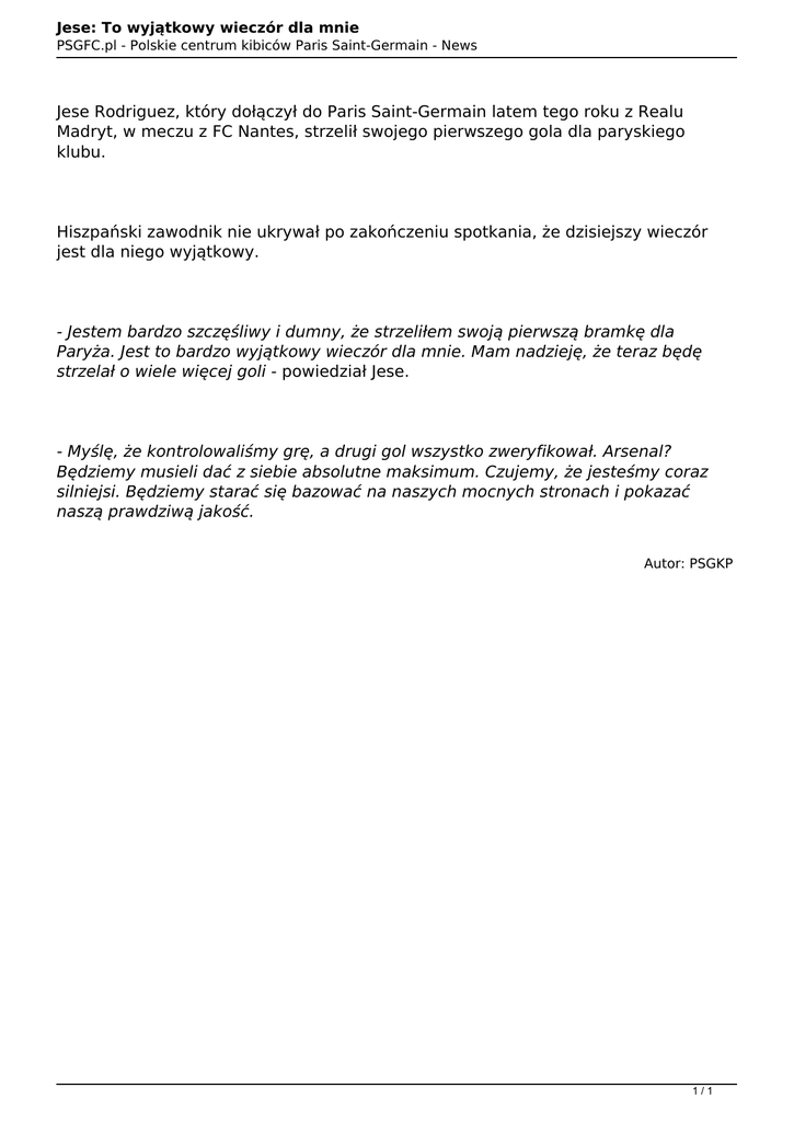 Jese: To wyjątkowy wieczór dla mnie PSGFC.pl - Polskie centrum kibiców Paris Saint-Germain - News Jese Rodriguez, który dołączył do Paris Saint-Germain latem tego roku z Realu Madryt, w meczu z FC Nantes, strzelił swojego pierwszego gola dla paryskiego klubu. Hiszpański zawodnik nie ukrywał po zakończeniu spotkania, że dzisiejszy wieczór jest dla niego wyjątkowy. - Jestem bardzo szczęśliwy i dumny, że strzeliłem swoją pierwszą bramkę dla Paryża. Jest to bardzo wyjątkowy wieczór dla mnie. Mam nadzieję, że teraz będę strzelał o wiele więcej goli - powiedział Jese. - Myślę, że kontrolowaliśmy grę, a drugi gol wszystko zweryfikował. Arsenal? Będziemy musieli dać z siebie absolutne maksimum. Czujemy, że jesteśmy coraz silniejsi. Będziemy starać się bazować na naszych mocnych stronach i pokazać naszą prawdziwą jakość. Autor: PSGKP 1/1 Powered by TCPDF (www.tcpdf.org)