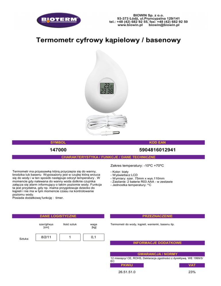 Termometr cyfrowy kąpielowy / basenowy SYMBOL KOD EAN 147000 5904816012941 CHARAKTERYSTYKA / FUNKCJE / DANE TECHNICZNE Zakres temperatury: -10ºC +70ºC Termometr ma przyssawkę którą przyczepia się do wanny, brodzika lub basenu Wyposażony jest w czujkę którą wrzuca się do wody i w ten sposób następuje odczyt temperatury . W momencie gdy nalewana do wanny woda dotknie czujnika załącza się alarm informujący o takim poziomie wody. Funkcja ta jest przydatna, gdy np. mama przygotowuje dziecko do kąpieli i nie ma w tym momencie czasu na kontrolowanie poziomu wody. Posiada dodatkową funkcję : timer. - Kolor: biały - Wyświetlacz LCD - Wymiary: szer. 75mm x wys.110mm - Zasilanie: 2 baterie R03 AAA - w zestawie - Jednostka temperatury: º C DANE LOGISTYCZNE Sztuka PRZEZNACZENIE szer/gł/wys [cm] Ilość sztuk waga [kg] 8/2/11 1 0,1 Termometr do wody, kąpieli, wanienki, basenu itp. INFORMACJE DODATKOWE GWARANCJA / NORMY 12 miesięcy/ CE, ROHS, Deklaracja zgodności z dyrektywą WE 1999/5/ EC PKWiU VAT 26.51.51.0 23%
