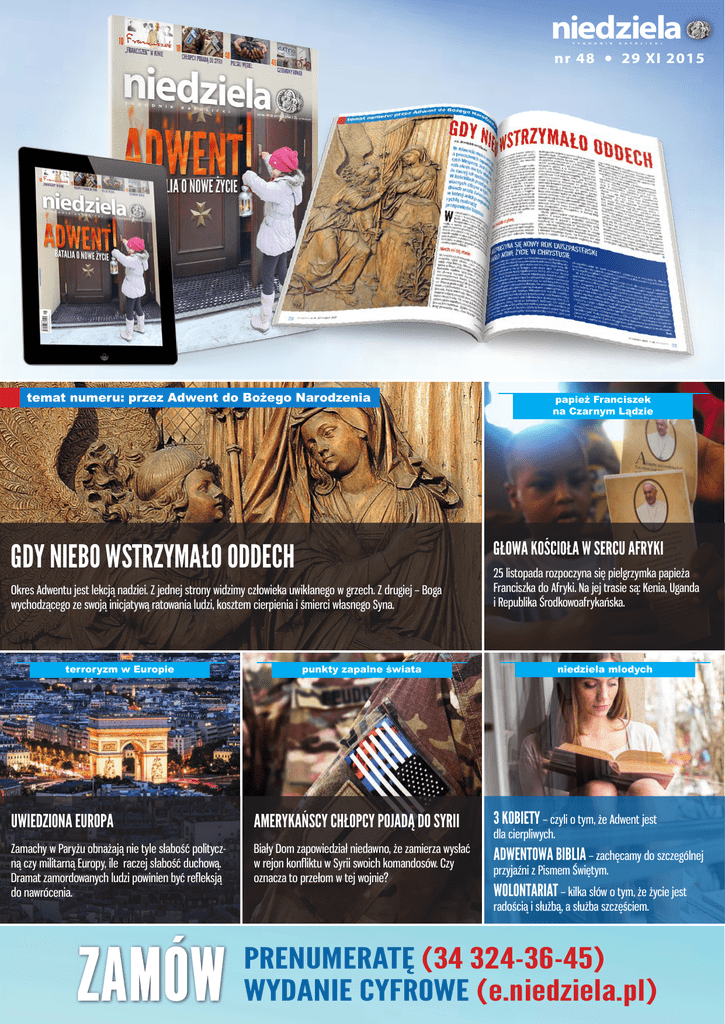 niedziela T Y G O D nr 48 temat numeru: przez Adwent do Bożego Narodzenia I K K A T O L I C K I 29 XI 2015 papież Franciszek na Czarnym Lądzie GŁOWA KOŚCIOŁA W SERCU AFRYKI GDY NIEBO WSTRZYMAŁO ODDECH Okres Adwentu jest lekcją nadziei. Z jednej strony widzimy człowieka uwikłanego w grzech. Z drugiej – Boga wychodzącego ze swoją inicjatywą ratowania ludzi, kosztem cierpienia i śmierci własnego Syna. terroryzm w Europie N 25 listopada rozpoczyna się pielgrzymka papieża Franciszka do Afryki. Na jej trasie są: Kenia, Uganda i Republika Środkowoafrykańska. niedziela mlodych punkty zapalne świata UWIEDZIONA EUROPA AMERYKAŃSCY CHŁOPCY POJADĄ DO SYRII 3 KOBIETY – czyli o tym, że Adwent jest Zamachy w Paryżu obnażają nie tyle słabość polityczną czy militarną Europy, ile raczej słabość duchową. Dramat zamordowanych ludzi powinien być refleksją do nawrócenia. Biały Dom zapowiedział niedawno, że zamierza wysłać w rejon konfliktu w Syrii swoich komandosów. Czy oznacza to przełom w tej wojnie? ADWENTOWA BIBLIA – zachęcamy do szczególnej przyjaźni z Pismem Świętym. ZAMÓW dla cierpliwych. WOLONTARIAT – kilka słów o tym, że życie jest radością i służbą, a służba szczęściem. PRENUMERATĘ (34 324-36-45) WYDANIE CYFROWE (e.niedziela.pl) Zapraszamy do lektury 48. numeru „Niedzieli” 29 listopada 2015 r. Proponujemy m.in. artykuły: Temat numeru: przez Adwent do Bożego Narodzenia Głowa Kościoła w sercu Afryki 25 listopada rozpoczyna się pielgrzymka papieża Franciszka do Afryki. Na jej trasie są: Kenia, Uganda i Republika Środkowoafrykańska. Uwiedziona Europa Zamachy w Paryżu obnażają nie tyle słabość polityczną czy militarną Europy, ile raczej słabość duchową. Dramat zamordowanych ludzi powinien być refleksją do nawrócenia. Amerykańscy chłopcy pojadą do Syrii Biały Dom zapowiedział niedawno, że zamierza wysłać w rejon konfliktu w Syrii swoich komandosów. Czy oznacza to przełom w tej wojnie? O relikwiach Jana Pawła II Kult relikwii św. Jana Pawła II lawinowo rośnie. Na cały świat rozesłano ponad milion fragmentów papieskiej sutanny. Okazało się, że to za mało. Gdy niebo wstrzymało oddech Okres Adwentu jest lekcją nadziei. Z jednej strony widzimy człowieka uwikłanego w grzech. Z drugiej – Boga wychodzącego ze swoją inicjatywą ratowania ludzi, kosztem cierpienia i śmierci własnego Syna. Polski węgiel – błogosławieństwo czy przekleństwo? Kondycja polskiego górnictwa nie nastraja do radosnego świętowania Barbórki. Terapeutyczna jadłodajnia Kuchnia jest znakomitym miejscem terapeutycznym. Potwierdza to przypadek warszawskiej jadłodajni „Czerwony rower”. W „Niedzieli Młodych”: * 3 KOBIETY – czyli o tym, że Adwent jest dla cierpliwych. * ADWENTOWA BIBLIA – zachęcamy do szczególnej przyjaźni z Pismem Świętym. * WOLONTARIAT – kilka słów o tym, że życie jest radością i służbą, a służba szczęściem.