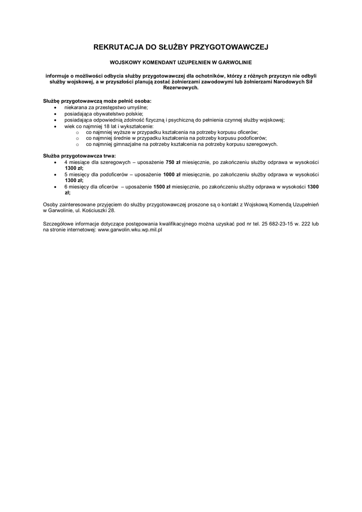 REKRUTACJA DO SŁUŻBY PRZYGOTOWAWCZEJ WOJSKOWY KOMENDANT UZUPEŁNIEN W GARWOLINIE informuje o możliwości odbycia służby przygotowawczej dla ochotników, którzy z różnych przyczyn nie odbyli służby wojskowej, a w przyszłości planują zostać żołnierzami zawodowymi lub żołnierzami Narodowych Sił Rezerwowych. Służbę przygotowawczą może pełnić osoba: niekarana za przestępstwo umyślne; posiadająca obywatelstwo polskie; posiadająca odpowiednią zdolność fizyczną i psychiczną do pełnienia czynnej służby wojskowej; wiek co najmniej 18 lat i wykształcenie: o co najmniej wyższe w przypadku kształcenia na potrzeby korpusu oficerów; o co najmniej średnie w przypadku kształcenia na potrzeby korpusu podoficerów; o co najmniej gimnazjalne na potrzeby kształcenia na potrzeby korpusu szeregowych. Służba przygotowawcza trwa: 4 miesiące dla szeregowych – uposażenie 750 zł miesięcznie, po zakończeniu służby odprawa w wysokości 1300 zł; 5 miesięcy dla podoficerów – uposażenie 1000 zł miesięcznie, po zakończeniu służby odprawa w wysokości 1300 zł; 6 miesięcy dla oficerów – uposażenie 1500 zł miesięcznie, po zakończeniu służby odprawa w wysokości 1300 zł; Osoby zainteresowane przyjęciem do służby przygotowawczej proszone są o kontakt z Wojskową Komendą Uzupełnień w Garwolinie, ul. Kościuszki 28. Szczegółowe informacje dotyczące postępowania kwalifikacyjnego można uzyskać pod nr tel. 25 682-23-15 w. 222 lub na stronie internetowej: www.garwolin.wku.wp.mil.pl