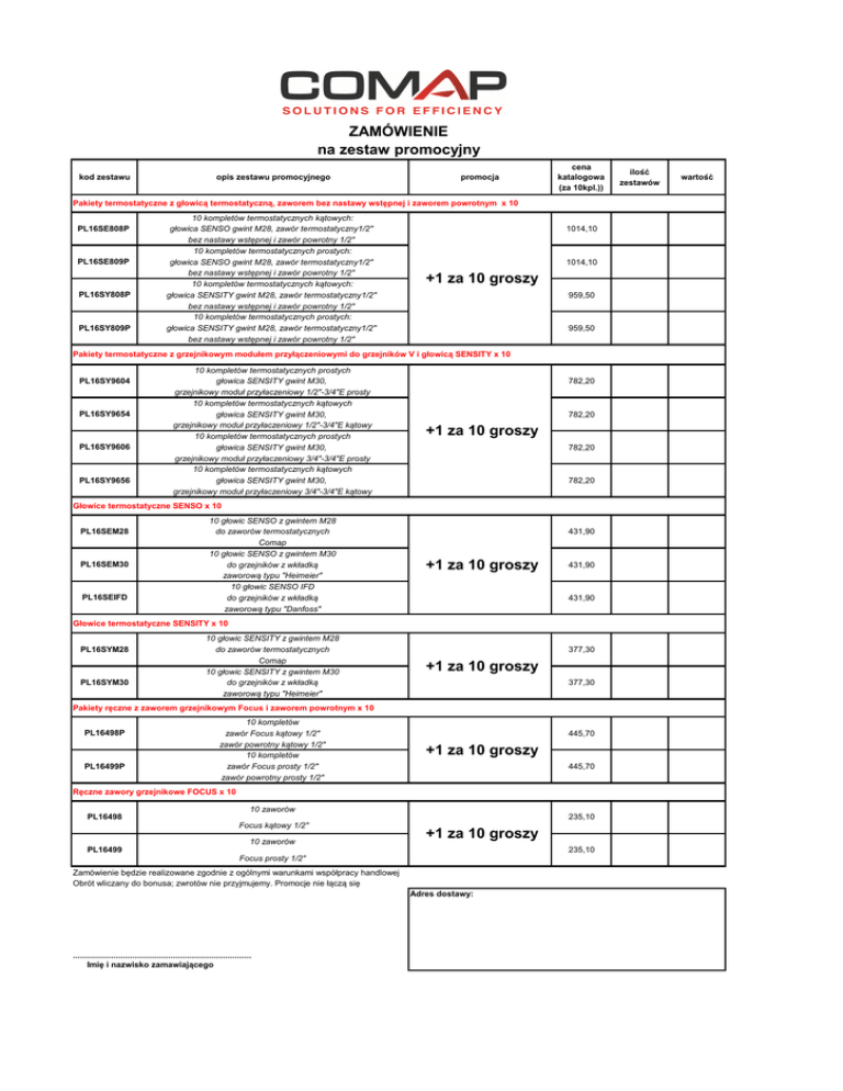 ZAMÓWIENIE na zestaw promocyjny kod zestawu opis zestawu promocyjnego promocja cena katalogowa (za 10kpl.)) Pakiety termostatyczne z głowicą termostatyczną, zaworem bez nastawy wstępnej i zaworem powrotnym x 10 PL16SE808P PL16SE809P PL16SY808P PL16SY809P 10 kompletów termostatycznych kątowych: głowica SENSO gwint M28, zawór termostatyczny1/2" bez nastawy wstępnej i zawór powrotny 1/2" 10 kompletów termostatycznych prostych: głowica SENSO gwint M28, zawór termostatyczny1/2" bez nastawy wstępnej i zawór powrotny 1/2" 10 kompletów termostatycznych kątowych: głowica SENSITY gwint M28, zawór termostatyczny1/2" bez nastawy wstępnej i zawór powrotny 1/2" 10 kompletów termostatycznych prostych: głowica SENSITY gwint M28, zawór termostatyczny1/2" bez nastawy wstępnej i zawór powrotny 1/2" 1014,10 1014,10 +1 za 10 groszy 959,50 959,50 Pakiety termostatyczne z grzejnikowym modułem przyłączeniowymi do grzejników V i głowicą SENSITY x 10 PL16SY9604 PL16SY9654 PL16SY9606 PL16SY9656 10 kompletów termostatycznych prostych głowica SENSITY gwint M30, grzejnikowy moduł przyłaczeniowy 1/2"-3/4"E prosty 10 kompletów termostatycznych kątowych głowica SENSITY gwint M30, grzejnikowy moduł przyłaczeniowy 1/2"-3/4"E kątowy 10 kompletów termostatycznych prostych głowica SENSITY gwint M30, grzejnikowy moduł przyłaczeniowy 3/4"-3/4"E prosty 10 kompletów termostatycznych kątowych głowica SENSITY gwint M30, grzejnikowy moduł przyłaczeniowy 3/4"-3/4"E kątowy 782,20 782,20 +1 za 10 groszy 782,20 782,20 Głowice termostatyczne SENSO x 10 PL16SEM28 PL16SEM30 PL16SEIFD 10 głowic SENSO z gwintem M28 do zaworów termostatycznych Comap 10 głowic SENSO z gwintem M30 do grzejników z wkładką zaworową typu "Heimeier" 10 głowic SENSO IFD do grzejników z wkładką zaworową typu "Danfoss" 431,90 +1 za 10 groszy 431,90 431,90 Głowice termostatyczne SENSITY x 10 PL16SYM28 PL16SYM30 10 głowic SENSITY z gwintem M28 do zaworów termostatycznych Comap 10 głowic SENSITY z gwintem M30 do grzejników z wkładką zaworową typu "Heimeier" 377,30 +1 za 10 groszy 377,30 Pakiety ręczne z zaworem grzejnikowym Focus i zaworem powrotnym x 10 PL16498P PL16499P 10 kompletów zawór Focus kątowy 1/2" zawór powrotny kątowy 1/2" 10 kompletów zawór Focus prosty 1/2" zawór powrotny prosty 1/2" 445,70 +1 za 10 groszy 445,70 Ręczne zawory grzejnikowe FOCUS x 10 10 zaworów PL16498 235,10 Focus kątowy 1/2" 10 zaworów +1 za 10 groszy PL16499 235,10 Focus prosty 1/2" Zamówienie będzie realizowane zgodnie z ogólnymi warunkami współpracy handlowej Obrót wliczany do bonusa; zwrotów nie przyjmujemy. Promocje nie łączą się Adres dostawy: ........................................................................... Imię i nazwisko zamawiającego ilość zestawów wartość