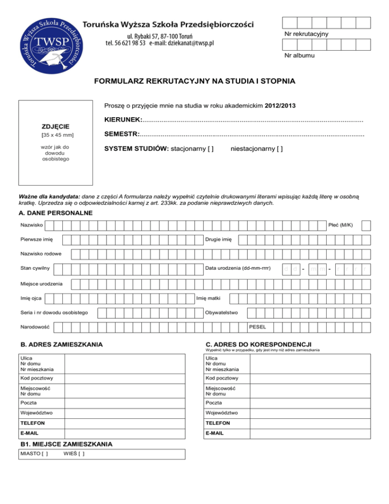 Nr rekrutacyjny Nr albumu FORMULARZ REKRUTACYJNY NA STUDIA I STOPNIA Proszę o przyjęcie mnie na studia w roku akademickim 2012/2013 KIERUNEK:.................................................................................................................... ZDJĘCIE [35 x 45 mm] SEMESTR:...................................................................................................................... wzór jak do dowodu osobistego SYSTEM STUDIÓW: stacjonarny [ ] niestacjonarny [ ] Ważne dla kandydata: dane z części A formularza należy wypełnić czytelnie drukowanymi literami wpisując każdą literę w osobną kratkę. Uprzedza się o odpowiedzialności karnej z art. 233kk. za podanie nieprawdziwych danych. A. DANE PERSONALNE 6 Nazwisko Płeć (M/K) 6 Pierwsze imię Drugie imię 6 Nazwisko rodowe 6 Stan cywilny Data urodzenia (dd-mm-rrrr) d d - m m - 6 Miejsce urodzenia 6 Imię ojca Imię matki 6 Seria i nr dowodu osobistego Obywatelstwo 6 Narodowość PESEL B. ADRES ZAMIESZKANIA C. ADRES DO KORESPONDENCJI Wypełnić tylko w przypadku, gdy jest inny niż adres zamieszkania Ulica Nr domu Nr mieszkania Ulica Nr domu Nr mieszkania Kod pocztowy Kod pocztowy Miejscowość Nr domu Miejscowość Nr domu Poczta Poczta Województwo Województwo TELEFON TELEFON E-MAIL E-MAIL B1. MIEJSCE ZAMIESZKANIA MIASTO [ ] WIEŚ [ ] r r r r D. UKOŃCZONA SZKOŁA ŚREDNIA PEŁNA NAZWA SZKOŁY TYP SZKOŁY [NP.: LO TE, LE] ADRES SZKOŁY MIEJSCOWOŚĆ ROK UKOŃCZENIA NUMER ŚWIADECTWA DOJRZAŁOŚCI DATA WYSTAWIENIA ŚWIADECTWA DOJRZAŁOŚCI OKE 6 E. ZNAJOMOŚĆ JĘZYKA OBCEGO [PROSZĘ ZAZNACZYĆ X] JĘZYK Poziom podstawowy Poziom średniozaawansowany Poziom zaawansowany Angielski Niemiecki Francuski Rosyjski inny: 6 F. STOPIEŃ NIEPEŁNOSPRAWNOŚCI [PROSZĘ ZAZNACZYĆ X] Niesłyszący i niedosłyszący [ ] Niewidomi i niedowidzący [ ] Z DYSFUNKCJĄ NARZĄDÓW RUCHU Chodzący [ ] Niechodzący [ ] Inne rodzaje niepełnosprawności 6 G. PODSTAWOWE ŹRÓDŁO UTRZYMANIA RODZINY Wynagrodzenie o pracę Emerytura/renta Gospodarstwo rolne Działalność gospodarcza Inne (podać jakie)........................................................................................................................................................................................................... OŚWIADCZENIE 1. Prawdziwość danych zawartych w formularzu stwierdzam własnoręcznym podpisem. 2. Przyjmuję do wiadomości, że w przypadku rezygnacji ze studiów opłata rekrutacyjna nie podlega zwrotowi. 3. Zobowiązuję się do pisemnego powiadamiania Dziekanatu o każdorazowej zmianie danych adresowych. 4. Przyjmuję do wiadomości, że w przypadku nie powiadomienia Dziekanatu o zmianie danych adresowych, korespondencję wysłaną na dany adres uznaje się za skutecznie dostarczoną. 5. Wyrażam zgodę na przetwarzanie moich danych osobowych na potrzeby Toruńskiej Wyższej Szkoły Przedsiębiorczości zgodnie z Ustawą z dnia 29 sierpnia 1997 r. o ochronie danych osobowych (Dz. U. Z 2003 r, Nr 101 poz 926 z późn. zm.) …....................................................................... Miejscowość …................................................................... Data ….......................................................................... Czytelny podpis osoby, której dane dotyczą Toruń, dnia.................................................... …............................................................................. Podpis osoby przyjmującej formularz