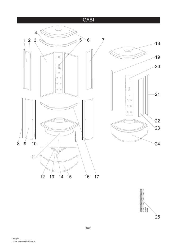 GABI 4 5 1 2 3 6 7 18 19 20 21 22 23 8 9 10 24 11 12 13 14 15 16 17 25 327 069-gabi 22 pa dziernika 2016 08:27:38 Gabi 90 numer symbol nazwa części uwagi wymiary 1630 x 390 x 22, grubość szkła 4 1 301010187 ścianka przednia lewa M 2 104020216 uszczelka piórowa szyby przedniej F 3 301030108 ścianka tylna O 4 201010132 profil poziomy górny I 5 501010035 panel natryskowy R wymaga potwierdzenia dostępności 6 801020030 daszek - korpus K wymaga potwierdzenia dostępności 7 301010188 ścianka przednia prawa M wymiary 1630 x 390 x 22, grubość szkła 4 8 104020216 uszczelka piórowa drzwi F 9 301020161 szyba drzwiowa L 10 104020217 uszczelka magnetyczna G 11 401020135 skorupa brodzika O 12 402010044 stelaż brodzika I 13 403010011 pręt gwintowany M12 x 130 C 14 403010083 pręt gwintowany M12 x 110 C 15 401020132 osłona brodzika K 16 403010017 pręt gwintowany M12 x 410 E 17 201010133 profil poziomy dolny I 18 801010036 daszek kompletny M wymaga potwierdzenia dostępności 19 201020137 profil boczny lewy H wymaga potwierdzenia dostępności 20 501020047 panel natryskowy - korpus M wymaga potwierdzenia dostępności 21 201020138 profil boczny prawy H wymaga potwierdzenia dostępności 22 104020219 uszczelka o przekroju „U” F 23 301010189 szyba przednia stała L 24 401010091 brodzik kompletny R 25 403010151 pręt M12 - komplet H 328 069-gabi 22 pa grupa cenowa dziernika 2016 08:27:38 wymiary 1620 x 668 wymiary 1595 x 362, grubość szkła 4 wymaga potwierdzenia dostępności wymaga potwierdzenia dostępności wymaga potwierdzenia dostępności Gabi 1 2 3 4 5 6 7 8 9 10 11 12 13 14 15 16 17 18 19 20 numer symbol nazwa części grupa cenowa 1 106010028 bateria kompletna M 2 103010001 głowica mieszacza 40 mm G 3 103020031 głowica przełącznika funkcji G 4 101030033 uchwyt mieszacza E 5 101030074 uchwyt przełącznika funkcji E 6 102020053 rozeta mieszacza E 7 102020055 rozeta przełącznika funkcji E 8 102040030 osłona głowicy mieszacza D 9 105010049 dysza masażowa D 10 105010050 dysza masażowa końcowa D 11 102030094 wąż połączeniowy dysz masażowych F długość całkowita 145 cm 12 102030031 wąż połączeniowy deszczownicy F długość 120 cm 13 102030011 E długość 45 cm 14 102060001 opaska zaciskowa B 15 102050007 kolanko węża połączeniowego - mosiądz C 16 104020086 uszczelka 1/2" A 17 502010006 nakładka panelu natryskowego D 18 702010068 rolka górna E średnica kółka 21,5 19 702010067 rolka dolna E średnica kółka 23 20 702010017 odbojnik B wąż połączeniowy zestawu natryskowego 329 069-gabi 22 pa uwagi dziernika 2016 08:27:38 rozstaw 100 wysokość 74, średnica 37 Gabi 1 2 3 4 5 6 7 8 9 10 11 12 13 14 15 16 17 18 19 20 numer symbol nazwa części grupa cenowa 1 702020017 uchwyt drzwi C 2 105010008 słuchawka natryskowa F 3 105020007 wąż natryskowy E 1/2" x 1/2" L1200 4 105030022 uchwyt słuchawki D rozstaw otworów 60 5 701020035 śruby uchwytu słuchawki A 6 102050005 przyłącze węża natryskowego C 7 701020002 nakrętka 1/2" z kołnierzem - tworzywo A 8 105010011 deszczownica I 9 802010002 osłona daszka E 10 105050010 drenaż H 11 403010005 nakrętka M12 A 12 403010084 stopka B 13 403010085 zatrzask osłony B 14 701010059 zestaw wkrętów do montażu kabiny F rysunek poglądowy 15 701010058 zestaw wkrętów do montażu brodzika E rysunek poglądowy 16 403010150 zestaw montażowy brodzika I bez prętów M12; rysunek poglądowy 17 105050037 korek F 18 105050038 rura odpływowa F 19 902010056 zestaw montażowy kabiny R 20 330 069-gabi 22 pa uwagi dziernika 2016 08:27:39 rysunek poglądowy Gabi - paczki - wymaga potwierdzenia dostępności symbol nazwa części grupa cenowa 8006059075481073120104 paczka 1/4 Gabi 90 U brodzik, osłona brodzika, stelaż, profile poziome, daszek, zestaw montażowy, akcesoria 8006059075481073120204 paczka 2/4 Gabi 90 S szyby przednie, drzwi, uszczelki, profile 8006059075481073120304 paczka 3/4 Gabi 90 R panel natryskowy 8006059075481073120404 paczka 4/4 Gabi 90 S ścianki tylne 331 069-gabi 22 pa uwagi dziernika 2016 08:27:39