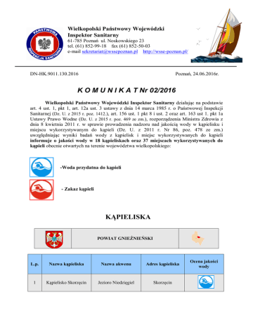 Wielkopolski Państwowy Wojewódzki Inspektor Sanitarny 61-785 Poznań ul. Noskowskiego 23 tel. (61) 852-99-18 fax (61) 852-50-03 e-mail [email protected] http://wsse-poznan.pl/ DN-HK.9011.130.2016 Poznań, 24.06.2016r. K O M U N I K A T Nr 02/2016 Wielkopolski Państwowy Wojewódzki Inspektor Sanitarny działając na podstawie art. 4 ust. 1, pkt 1, art. 12a ust. 3 ustawy z dnia 14 marca 1985 r. o Państwowej Inspekcji Sanitarnej (Dz. U. z 2015 r. poz. 1412.), art. 156 ust. 1 pkt 8 i ust. 2 oraz art. 163 ust 1. pkt 1a Ustawy Prawo Wodne (Dz. U. z 2015 r. poz. 469 ze zm.), rozporządzenia Ministra Zdrowia z dnia 8 kwietnia 2011 r. w sprawie prowadzenia nadzoru nad jakością wody w kąpielisku i miejscu wykorzystywanym do kąpieli (Dz. U. z 2011 r. Nr 86, poz. 478 ze zm.) uwzględniając wyniki badań wody z kąpielisk i miejsc wykorzystywanych do kąpieli informuje o jakości wody w 18 kąpieliskach oraz 37 miejscach wykorzystywanych do kąpieli obecnie otwartych na terenie województwa wielkopolskiego: -Woda przydatna do kąpieli - Zakaz kąpieli KĄPIELISKA POWIAT GNIEŹNIEŃSKI L.p. Nazwa kąpieliska Nazwa akwenu Adres kąpieliska 1 Kąpielisko Skorzęcin Jezioro Niedzięgiel Skorzęcin Ocena jakości wody 2 Kąpielisko Winiary Gniezno ul. Łazienkowa Jezioro Winiary POWIAT KOŚCIAŃSKI L.p. Nazwa kąpieliska Nazwa akwenu Adres kąpieliska 1 Nowy Dębiec jezioro Wonieść Nowy Dębiec, 64-000 Kościan Ocena jakości wody POWIAT MIĘDZYCHODZKI L.p. Nazwa kąpieliska Nazwa akwenu Adres kąpieliska 1 Kąpielisko na jeziorze Kuchennym w Prusimiu Jezioro Kuchenne Prusim 5, 64-420 Kwilcz Ocena jakości wody POWIAT OBORNICKI L.p. Nazwa kąpieliska Nazwa akwenu Adres kąpieliska 1 Kąpielisko Miejskie Oborniki zbiornik wodny ul. Kowanowska, 64-600 Oborniki Ocena jakości wody POWIAT OSTROWSKI L.p. 1 Nazwa kąpieliska LIDO Nazwa akwenu Adres kąpieliska Staw Szperek ul. Wrocławska 6 Antonin,63-421 Przygodzice Ocena jakości wody POWIAT OSTRZESZOWSKI L.p. Nazwa kąpieliska Nazwa akwenu Adres kąpieliska 1 Kąpielisko OSiR przy ul. Kąpielowej w Ostrzeszowie Rzeka Strzegowa ul. Kąpielowa 5, 63-500 Ostrzeszów Ocena jakości wody POWIAT PILSKI L.p. Nazwa kąpieliska Nazwa akwenu Adres kąpieliska 1 Płotki Jezioro Płotki Piła Płotki 2 Piaszczyste Jezioro Piaszczyste Piła Piaszczyste Ocena jakości wody POWIAT PLESZEWSKI L.p. Nazwa kąpieliska Nazwa akwenu Adres kąpieliska 1 Kąpielisko na sztucznym zbiorniku rzeki Ciemnej w Gołuchowie Rzeka Ciemna ul. Leśna 1, 63-322 Gołuchów Ocena jakości wody POWIAT POZNAŃSKI L.p. Nazwa kąpieliska Nazwa akwenu Adres kąpieliska 1 Kąpielisko Malta na jeziorze Maltańskim Jezioro Malta ul. Wiankowa 3, 61-131 Poznań 2 Kąpielisko Rusałka na jeziorze Rusałka Jezioro Rusałka ul. Wiślana 14, 60-401 Poznań Jezioro Strzeszyńskie ul. Koszalińska 15, 60-480 Poznań 4 Kąpielisko Krzyżowniki na jeziorze Kierskim w Poznaniu Krzyżownikach Jezioro Kierskie ul. Nad Jeziorem 21, 60-459 Poznań 5 Kąpielisko strzeżone Akwen Tropicana w Owińskach Zbiornik pożwirowy w Owińskach ul. Plażowa 1, 62-005 Owińska 3 Kąpielisko Strzeszynek na jeziorze Strzeszyńskim Ocena jakości wody POWIAT ŚREMSKI L.p. Nazwa kąpieliska Nazwa akwenu Adres kąpieliska 1 Kąpielisko nad jeziorem Jarosławskim Jezioro Jarosławskie Jarosławki Ocena jakości wody POWIAT WĄGROWIECKI L.p. Nazwa kąpieliska Nazwa akwenu Adres kąpieliska 1 Kąpielisko Miejskie Jezioro Durowskie ul. Kościuszki, Wągrowiec Ocena jakości wody 2 Kozielsko Jezioro Stępuchowskie Kozielsko, gm. Damasławek MIEJSCA WYKORZYTYWANE DO KĄPIELI POWIAT GNIEŹNIENSKI L.p. Nazwa miejsca wykorzystywanego do kąpieli Nazwa akwenu Adres miejsca wykorzystywanego do kąpieli 1 Borzątew Jezioro Borzątew Borzątew gm. Mieleszyn 2 Dziekanowice Jezioro Lednickie Dziekanowice gm. Łubowo 3 Lednogóra Jezioro Lednickie Lednogóra gm. Łubowo 4 Rybitwy Jezioro Lednickie Rybitwy gm. Łubowo Ocena jakości wody POWIAT KONIŃSKI L.p. 1 2 3 Nazwa miejsca wykorzystywanego do kąpieli Jezioro przy Parku Rekreacji i Aktywności Fizycznej w Kleczewie Jezioro Budzisławskie przy OW w Trębach Starych Jezioro Wilczyńskie przy GOSiR w Wilczynie Nazwa akwenu Adres miejsca wykorzystywanego do kąpieli jezioro pokopalniane Kleczew, Cegielnia 1 Jezioro Budzisławskie Jezioro Wilczyńskie Tręby Stare, gm. Kleczew ul. Karolkowa 39, Wilczyn Ocena jakości wody 4 5 6 7 8 9 10 11 Jezioro Ślesińskie przy OSW ”Gwarek” Sp. z o.o. w Ślesinie Jezioro Ślesińskie ul. Leśna 5, Ślesin, Jezioro Ślesińskie ul. Napoleona, Ślesin Jezioro Ślesińskie Ślesin Jezioro Mikorzyńskie Półwiosek Stary 30b, gm. Ślesin Jezioro Mikorzyńskie przy OW "Bernardynka" w Wąsoszach Jezioro Mikorzyńskie Wąsosze, gm. Ślesin Jezioro Mikorzyńskie przy Hotelu "Mikorzyn" zlokalizowanym w Mikorzynie Jezioro Mikorzyńskie Mikorzyn 1C, gm. Ślesin Jezioro Pątnowskie przy OW "Przystań Gosławice" w KoninieGosławicach Jezioro Pątnowskie Jezioro Ślesińskie na terenie Term Ślesińskich Sp. z o. o. w Ślesinie Jezioro Ślesińskie przy Parku Miejskim w Ślesinie Jezioro Mikorzyńskie przy OW "Delfin" w Półwiosku Starym Jezioro Mąkolno przy OW w Kolonii Lipiny Jezioro Mąkolno ul. Rybacka 1, Konin-Gosławice Kolonia Lipiny, gm. Sompolno POWIAT OBORNICKI L.p. 1 2 Nazwa miejsca wykorzystywanego do kąpieli Miejsce wykorzystywane do kąpieli Rogoźno Miejsce wykorzystywane do kąpieli przy Ośrodku RekreacyjnoSportowym Nazwa akwenu Adres miejsca wykorzystywanego do kąpieli Jezioro Rogozińskie ul. Plażowa, 64-610 Rogoźno Jezioro Rogoźińskie ul. Za Jeziorem, 64-610 Rogoźno Ocena jakości wody Przemysław Czarnecki 3 Miejsce wykorzystywane do kąpieli Nienawiszcz Jezioro Nienawiszcz Duże Nienawiszcz, 64-610 Rogoźno POWIAT OSTROWSKI L.p. Nazwa miejsca wykorzystywanego do kąpieli Nazwa akwenu 1 Piaski – Szczygliczka zbiornik wodny 2 Kąpielka zbiornik wodny Adres miejsca wykorzystywanego do kąpieli ul. Plażowa 1, 63-400 Ostrów Wlkp. O