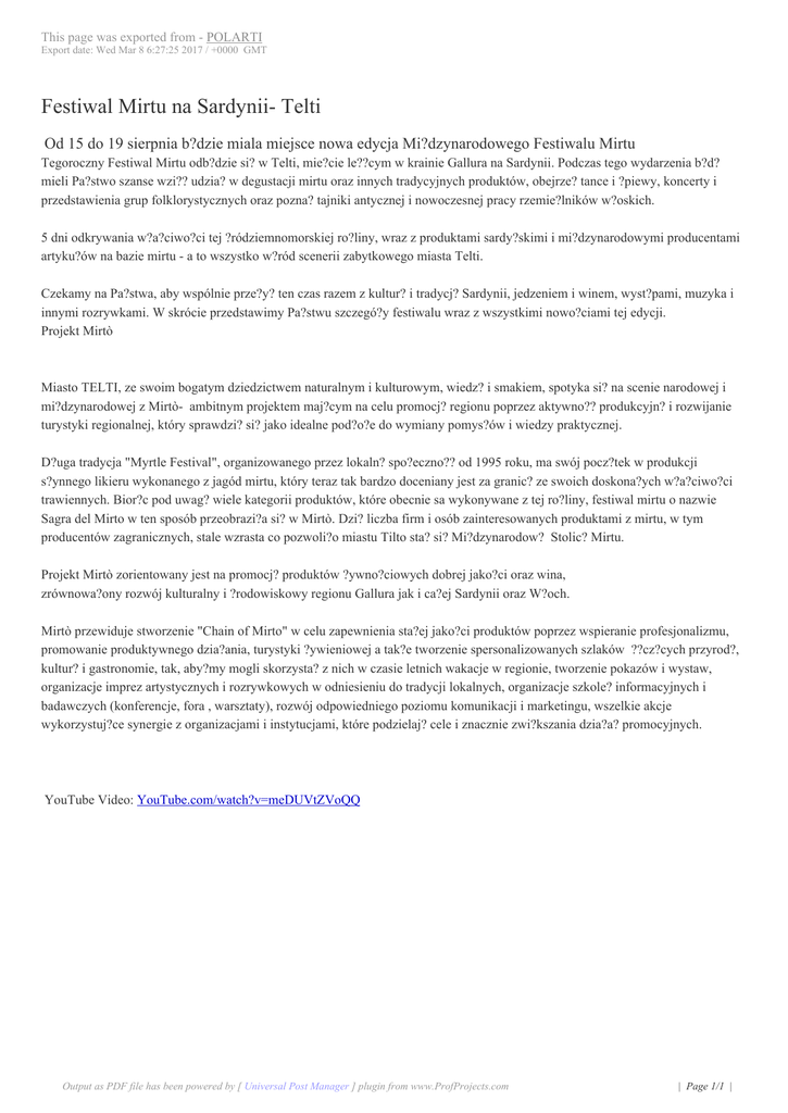 This page was exported from - POLARTI Export date: Wed Mar 8 6:27:25 2017 / +0000 GMT Festiwal Mirtu na Sardynii- Telti Od 15 do 19 sierpnia b?dzie miala miejsce nowa edycja Mi?dzynarodowego Festiwalu Mirtu Tegoroczny Festiwal Mirtu odb?dzie si? w Telti, mie?cie le??cym w krainie Gallura na Sardynii. Podczas tego wydarzenia b?d? mieli Pa?stwo szanse wzi?? udzia? w degustacji mirtu oraz innych tradycyjnych produktów, obejrze? tance i ?piewy, koncerty i przedstawienia grup folklorystycznych oraz pozna? tajniki antycznej i nowoczesnej pracy rzemie?lników w?oskich. 5 dni odkrywania w?a?ciwo?ci tej ?ródziemnomorskiej ro?liny, wraz z produktami sardy?skimi i mi?dzynarodowymi producentami artyku?ów na bazie mirtu - a to wszystko w?ród scenerii zabytkowego miasta Telti. Czekamy na Pa?stwa, aby wspólnie prze?y? ten czas razem z kultur? i tradycj? Sardynii, jedzeniem i winem, wyst?pami, muzyka i innymi rozrywkami. W skrócie przedstawimy Pa?stwu szczegó?y festiwalu wraz z wszystkimi nowo?ciami tej edycji. Projekt Mirtò Miasto TELTI, ze swoim bogatym dziedzictwem naturalnym i kulturowym, wiedz? i smakiem, spotyka si? na scenie narodowej i mi?dzynarodowej z Mirtò- ambitnym projektem maj?cym na celu promocj? regionu poprzez aktywno?? produkcyjn? i rozwijanie turystyki regionalnej, który sprawdzi? si? jako idealne pod?o?e do wymiany pomys?ów i wiedzy praktycznej. D?uga tradycja "Myrtle Festival", organizowanego przez lokaln? spo?eczno?? od 1995 roku, ma swój pocz?tek w produkcji s?ynnego likieru wykonanego z jagód mirtu, który teraz tak bardzo doceniany jest za granic? ze swoich doskona?ych w?a?ciwo?ci trawiennych. Bior?c pod uwag? wiele kategorii produktów, które obecnie sa wykonywane z tej ro?liny, festiwal mirtu o nazwie Sagra del Mirto w ten sposób przeobrazi?a si? w Mirtò. Dzi? liczba firm i osób zainteresowanych produktami z mirtu, w tym producentów zagranicznych, stale wzrasta co pozwoli?o miastu Tilto sta? si? Mi?dzynarodow? Stolic? Mirtu. Projekt Mirtò zorientowany jest na promocj? produktów ?ywno?ciowych dobrej jako?ci oraz wina, zrównowa?ony rozwój kulturalny i ?rodowiskowy regionu Gallura jak i ca?ej Sardynii oraz W?och. Mirtò przewiduje stworzenie "Chain of Mirto" w celu zapewnienia sta?ej jako?ci produktów poprzez wspieranie profesjonalizmu, promowanie produktywnego dzia?ania, turystyki ?ywieniowej a tak?e tworzenie spersonalizowanych szlaków ??cz?cych przyrod?, kultur? i gastronomie, tak, aby?my mogli skorzysta? z nich w czasie letnich wakacje w regionie, tworzenie pokazów i wystaw, organizacje imprez artystycznych i rozrywkowych w odniesieniu do tradycji lokalnych, organizacje szkole? informacyjnych i badawczych (konferencje, fora , warsztaty), rozwój odpowiedniego poziomu komunikacji i marketingu, wszelkie akcje wykorzystuj?ce synergie z organizacjami i instytucjami, które podzielaj? cele i znacznie zwi?kszania dzia?a? promocyjnych. YouTube Video: YouTube.com/watch?v=meDUVtZVoQQ Output as PDF file has been powered by [ Universal Post Manager ] plugin from www.ProfProjects.com | Page 1/1 |