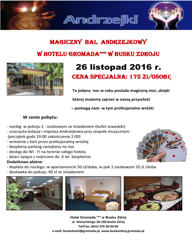 MAGICZNY BAL ANDRZEJKOWY w Hotelu Gromada*** w Busku Zdroju 26 listopad 2016 r. Cena specjalna: 175 zł/osobĘ Ta jedyna noc w roku posiada magiczną moc ,dzięki której możemy zajrzeć w naszą przyszłość – pomogą nam w tym profesjonalne wróżki W cenie pobytu: - nocleg w pokoju 2 - osobowym ze śniadaniem (bufet szwedzki) - uroczysta kolacja i impreza Andrzejkowa przy zespole muzycznym (początek godz.19.00 zakończenie 2:00) - wróżenie z kart przez profesjonalną wróżkę - bezpłatny parking zamykany na noc - dostęp do Wi - Fi na terenie całego hotelu - dzieci śpiące z rodzicami do 6 lat bezpłatnie Dodatkowo płatne: - dopłata do noclegu: w apartamencie 50 zł/doba, w pok 1 osobowym 20 zł /doba - dostawka do pokoju: 60 zł ze śniadaniem Hotel Gromada *** w Busku Zdrój ul. Waryńskiego 28-100 Busko Zdrój Tel/Fax: (041) 378 30 00-04 e-mail: [email protected], www.buskozdroj.gromada.pl Propozycja menu Zupa Krem pomidorowo – paprykowy z paluszkiem z ciasta francuskiego Danie Główne Roladka neapolitańska Kuleczki ziemniaczane Mix sałat z sosem vinegrett Zimna płyta Schab po warszawsku Półmisek mięs pieczonych z dipami Tymbaliki drobiowe , Trio śledziowe Pomidory faszerowane sałatką jarzynową Sałatka Cezar Mozzarella z pomidorami Pieczywo , masło Drugie Danie Ciepłe Barszcz czerwony z pasztecikiem Deser Tort czekoladowy Napoje Bufet z kawą i herbatą Sok 0,3 l/os. , Woda o,3 l/os. , 250 ml wódki lub wina/os. Atrakcje Muzyka na żywo Wróżenie przez profesjonalne wróżki , lanie wosku