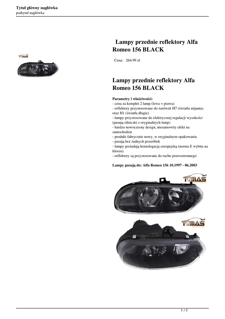 Tytuł główny nagłówka podtytuł nagłówka Lampy przednie reflektory Alfa Romeo 156 BLACK Cena: 264.99 zł Lampy przednie reflektory Alfa Romeo 156 BLACK Parametry i właściwości: - cena za komplet 2 lamp (lewa + prawa) - reflektory przystosowane do żarówek H7 (światła mijania) oraz H1 (światła długie) - lampy przystosowane do elektrycznej regulacji wysokości (pasują silniczki z oryginalnych lamp) - bardzo nowoczesny design, niesamowity efekt na samochodzie - produkt fabrycznie nowy, w oryginalnym opakowaniu - pasują beż żadnych przeróbek - lampy posiadają homologację europejską (norma E wybita na kloszu) - reflektory są przystosowane do ruchu prawostronnego Lampy pasują do: Alfa Romeo 156 10.1997 - 06.2003 1/2 Tytuł główny nagłówka podtytuł nagłówka 2/2 Powered by TCPDF (www.tcpdf.org)