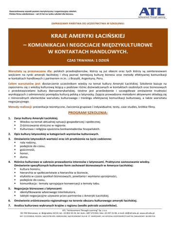 Gwarantowany wysoki poziom merytoryczny i organizacyjny szkoleń. Polska firma szkoleniowa – od 15 lat na rynku szkoleń dla biznesu. ZAPRASZAMY PAŃSTWA DO UCZESTNICTWA W SZKOLENIU: KRAJE AMERYKI ŁACIŃSKIEJ – KOMUNIKACJA I NEGOCJACJE MIĘDZYKULTUROWE W KONTAKTACH HANDLOWYCH. CZAS TRWANIA: 1 DZIEŃ Warsztaty są przeznaczone dla: polskich przedsiębiorców, którzy są już obecni oraz tych którzy są zainteresowani wejściem na rynki ameryki łacińskiej i chcą poznać tamtejszą kulturę biznesu oraz metody efektywnej komunikacji w kontaktach handlowych z partnerem m.in.: z Brazylii, Argentyny, Peru. Celem warsztatów jest: dostarczenie uczestnikom wiedzy na temat kultury Ameryki Łacińskiej. Szkolenie bazuje na zapoznaniu się z wiedzą kulturową leżącą u podstaw różnic doświadczanych w kontaktach osobistych oraz biznesowych z przedstawicielami kultury iberoamerykańskiej. Istotne jest prześledzenie i szczegółowe omówienie trudności wynikających z odmienności pomiędzy kulturą polską a latynoską. Zajęcia prowadzone metodami aktywnymi składają się z różnorodnych elementów warsztatu kulturowego i treningu efektywnej komunikacji kulturowej, a także warsztatu negocjacyjnego. Metody realizacji: prezentacje teoretyczne, ćwiczenia grupowe i indywidualne, testy, case studies, krótkie filmy. PROGRAM SZKOLENIA: 1. Zarys kultury Ameryki Łacińskiej. Wiedza na temat aktualnej sytuacji gospodarczej i społecznej. Zróżnicowanie etniczne w regionie. Kulturowa i religijna spuścizna konkwistadorów hiszpańskich. 2. Opis kultury latynoskiej w kategoriach wymiarów kulturowych. 3. Omówienie latynoskich wartości oraz ich przełożenia na życie codzienne: rola rodziny, podejście do czasu, gościnność, honor, duma. 4. Różnice kulturowe w zakresie prowadzenia interesów z latynosami. Praktyczne zastosowanie wiedzy. Omówienie specyficznych kulturowo form zachowań biznesowych w Ameryce Łacińskiej: kultura honoru, hierarchia w społeczeństwie a hierarchia w biznesie, etykieta w czasie spotkań biznesowych, powitania i wymiana uprzejmości, podejście do czasu, komunikacja : tematy sprzyjające konwersacji a tematy tabu. 5. Negocjacje biznesowe z latynosami: identyfikowanie właściwego interlokutora, taktyki negocjacyjne używane przez partnerów z Ameryki Łacińskiej. 6. Omówienie zróżnicowania regionalnego na terenie obszaru kulturowego ameryki łacińskiej. 7. Analiza kulturowa wybranych krajów z regionu (wedle potrzeb uczestników). ATL “Achievement Through Learning” Sp. z o.o. 02-793 Warszawa, ul. Belgradzka 14/14; tel.: 22 853 35 23, tel. kom.: 607 573 053, faks: 22 247 21 83, e-mail: [email protected], www.atl.edu.pl NIP: 5213358018, REGON: 140233796 KRS: 0000241906, SĄD REJONOWY DLA M. ST. WARSZAWY, XIII WYDZIAŁ GOSPODARCZY KAPITAŁ ZAKŁADOWY: 80.000 PLN Gwarantowany wysoki poziom merytoryczny i organizacyjny szkoleń. Polska firma szkoleniowa – od 15 lat na rynku szkoleń dla biznesu. KRAJE AMERYKI ŁACIŃSKIEJ - KOMUNIKACJA I NEGOCJACJE MIĘDZYKULTUROWE W KONTAKTACH HANDLOWYCH. FORMULARZ ZAINTERESOWANIA: prosimy o przesłanie faksem (22) 247 21 83 lub mailem: [email protected] Jesteśmy zainteresowani zorganizowaniem szkolenia zamkniętego w naszej firmie dla grupy około ......................... osób Jesteśmy zainteresowani uczestnictwem w szkoleniu otwartym (proszę podać ilość osób) - .......................... zorganizowanym w mieście: Białystok Kraków Łódź Toruń Szczecin Gdańsk Kielce Poznań Warszawa inne ………… Katowice Lublin Rzeszów Wrocław Firma:........................................................................................................................................................................................................... Miejscowość: ............................................................................. ulica .......................................................................... kod ...................... Osoba kontaktowa: ...................................................................................... Stanowisko: ......................................................................... Kontakt e-mail: ............................................................................................. Kontakt telefoniczny: .......................................................... Wyrażamy zgodę na umieszczenie w bazie ATL danych osobowych zawartych w formularzu w celu realizacji niniejszego zgłoszenia oraz dla potrzeb działań marketingowych prowadzonych przez ATL. zgodnie z Ustawą o ochronie danych osobowych (Dz. U. nr 133/97, poz. 883). Zapewniamy klientom prawo wglądu i zmiany swoich danych osobowych. ..................................... PIECZĄTKA I PODPIS ATL “Achievement Through Learning” Sp. z o.o. 02-793 Warszawa, ul. Belgradzka 14/14; tel.: 22 853 35 23, tel. kom.: 607 573 053, faks: 22 247 21 83, e-mail: [email protected], www.atl.edu.pl NIP: 5213358018, REGON: 140233796 KRS: 0000241906, SĄD REJONOWY DLA M. ST. WARSZAWY, XIII WYDZIAŁ GOSPODARCZY KAPITAŁ ZAKŁADOWY: 80.000 PLN