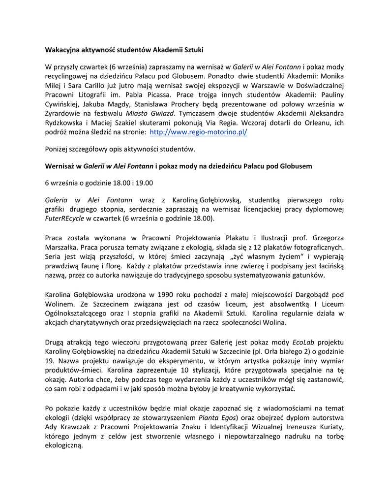Wakacyjna aktywność studentów Akademii Sztuki W przyszły czwartek (6 września) zapraszamy na wernisaż w Galerii w Alei Fontann i pokaz mody recyclingowej na dziedzińcu Pałacu pod Globusem. Ponadto dwie studentki Akademii: Monika Milej i Sara Carillo już jutro mają wernisaż swojej ekspozycji w Warszawie w Doświadczalnej Pracowni Litografii im. Pabla Picassa. Prace trojga innych studentów Akademii: Pauliny Cywińskiej, Jakuba Magdy, Stanisława Prochery będą prezentowane od połowy września w Żyrardowie na festiwalu Miasto Gwiazd. Tymczasem dwoje studentów Akademii Aleksandra Rydzkowska i Maciej Szakiel skuterami pokonują Via Regia. Wczoraj dotarli do Orleanu, ich podróż można śledzić na stronie: http://www.regio-‐motorino.pl/ Poniżej szczegółowy opis aktywności studentów. Wernisaż w Galerii w Alei Fontann i pokaz mody na dziedzińcu Pałacu pod Globusem 6 września o godzinie 18.00 i 19.00 Galeria w Alei Fontann wraz z Karoliną Gołębiowską, studentką pierwszego roku grafiki drugiego stopnia, serdecznie zapraszają na wernisaż licencjackiej pracy dyplomowej FuterREcycle w czwartek (6 września o godzinie 18.00). Praca została wykonana w Pracowni Projektowania Plakatu i Ilustracji prof. Grzegorza Marszałka. Praca porusza tematy związane z ekologią, składa się z 12 plakatów fotograficznych. Seria jest wizją przyszłości, w której śmieci zaczynają „żyć własnym życiem“ i wypierają prawdziwą faunę i florę. Każdy z plakatów przedstawia inne zwierzę i podpisany jest łacińską nazwą, przez co autorka nawiązuje do tradycyjnego sposobu systematyzowania gatunków. Karolina Gołębiowska urodzona w 1990 roku pochodzi z małej miejscowości Dargobądź pod Wolinem. Ze Szczecinem związana jest od czasów liceum, jest absolwentką I Liceum Ogólnokształcącego oraz I stopnia grafiki na Akademii Sztuki. Karolina regularnie działa w akcjach charytatywnych oraz przedsięwzięciach na rzecz społeczności Wolina. Drugą atrakcją tego wieczoru przygotowaną przez Galerię jest pokaz mody EcoLab projektu Karoliny Gołębiowskiej na dziedzińcu Akademii Sztuki w Szczecinie (pl. Orła białego 2) o godzinie 19. Nazwa projektu nawiązuje do eksperymentu, w którym artystka pokazuje inny wymiar produktów-‐śmieci. Karolina zaprezentuje 10 stylizacji, które przygotowała specjalnie na tę okazję. Autorka chce, żeby podczas tego wydarzenia każdy z uczestników mógł się zastanowić, co sam robi z odpadami i w jaki sposób można byłoby je kreatywnie wykorzystać. Po pokazie każdy z uczestników będzie miał okazje zapoznać się z wiadomościami na temat ekologii (dzięki współpracy ze stowarzyszeniem Planta Egos) oraz obejrzeć dyplom autorstwa Ady Krawczak z Pracowni Projektowania Znaku i Identyfikacji Wizualnej Ireneusza Kuriaty, którego jednym z celów jest stworzenie własnego i niepowtarzalnego nadruku na torbę ekologiczną. Wstęp wolny! Wernisaż prac Moniki Milej i Sary Carillo w Doświadczalnej Pracowni Litografii im. Pabla Picassa w Warszawie Monika Milej i Sara Carillo, studnetki Akademii Sztuki w Szczecinie oraz Doświadczalna Pracownia Litografii im. Pabla Picassa w Warszawie zapraszają na otwarcie wystawy: M Ł O D A G R A F I K A – Monika Milej | Sara Carrillo Monika Milej i Sara Carrillo, studentki Akademii Sztuki, zaprezentują swoje dyplomy zrealizowane w Pracowni Grafiki Warsztatowej prowadzonej przez prof. Marię Radomską i dr Ewy Czerwińskiej w 2012 roku Monika Milej – dyplom pt. : Geometria w życiu człowieka, w technice: sucha igła Sara Carrillo – dyplom pt. : Strefa hałasu , w technice: akwaforta/akwatinta Wernisaż odbędzie się w piątek 31 sierpnia o godz. 18:00. koncert podczas wernisażu: The Clark Kent Experience Wystawa trwa do końca września. Studenci Akademii Sztuki w Szczecinie na festiwalu Miasto Gwiazd w Żyrardowie Prace dyplomowe trojga studentów Akademii Sztuki w Szczecinie zostaną zaprezentowane podczas festiwalu Miasto Gwiazd w Żyrardowie w dniach 16-‐24 września 2012. Jakub Magda przygotował serię plakatów do wybranych filmów reżyserskiego duetu braci Coen. Jego praca to odejście od współczesnego śmieciowego plakatu filmowego. W symboliczny sposób stara się ująć fabułę, co intryguje odbiorcę i zmusza do myślenia. To praca licencjacka powstała w Pracowni Projektowania Plakatu i Ilustracji prof. Grzegorza Marszałka. Kolejna praca prezentowana w Żyrardowie to dyplom Pauliny Cywińskiej pt.: Rozum a instynkty i intuicje -‐ grafiki w technice druku wypukłego ilustrujące pulę cytatów (Pracownia Druku Wypukłego u prof. Andrzej Załeckiego). Dyplom składa się z dwunastu linorytów o wymiarach 49 x 69 cm prezentowanych oddzielnie oraz połączonych w całość. Każda z prac obrazuje jeden z instynktów bądź intuicji (rozumianych w sposób potoczny, nie naukowy): twórczość, seksualność, współpraca, ciekawość, gniew, rywalizacja, chciwość, macierzyństwo, sen, religijność, strach, głód. Złożone w całość tworzą obraz czaszki i mózgu. Każdy z wymienionych instynktów i intuicji staje się częścią współtworzącą wzorowane na rentgenowskim zdjęciu przedstawienie. Kolejnym elementem pracy jest książka o wymiarach 47 x 49 cm, zawierająca miniatury linorytów składających się -‐ podobnie jak w powiększeniu -‐ w jeden obraz, z których każdy jest siedmiostronicową książeczką zawierającą siedmioklatkową animację z załączonym na każdej ze stron cytatem dotyczącym danego instynktu/intuicji. W ramach festiwalu sztuki Miasto Gwiazd w Żyrardowie prezentowana będzie też praca dyplomowa Stanisława Prochery nosząca tytuł Transformacje. Praca została wykonana w Pracowni Druku Wypukłego prowadzonej pod kierunkiem prof. Andrzeja Załeckiego. Skuterami przez Via Regia Dwoje studentów Akademii Sztuki w Szczecinie Aleksandra Rydzkowska (Wydział Sztuk Wizualnych) i Maciej Szakiel (Wydział Edukacji Muzyczn